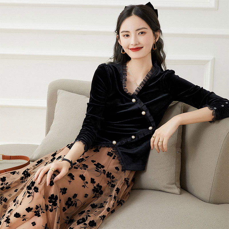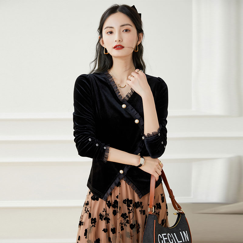白鹿语木耳花边拼接衬衫春季新款时尚复古优雅V领丝绒女式衬衣