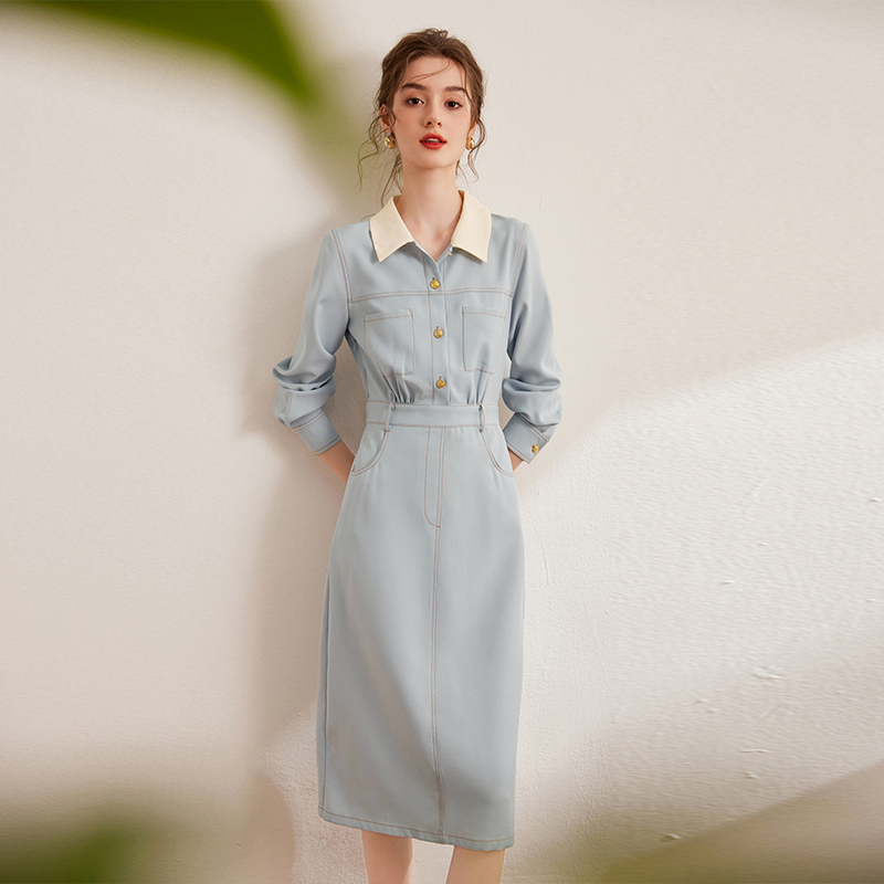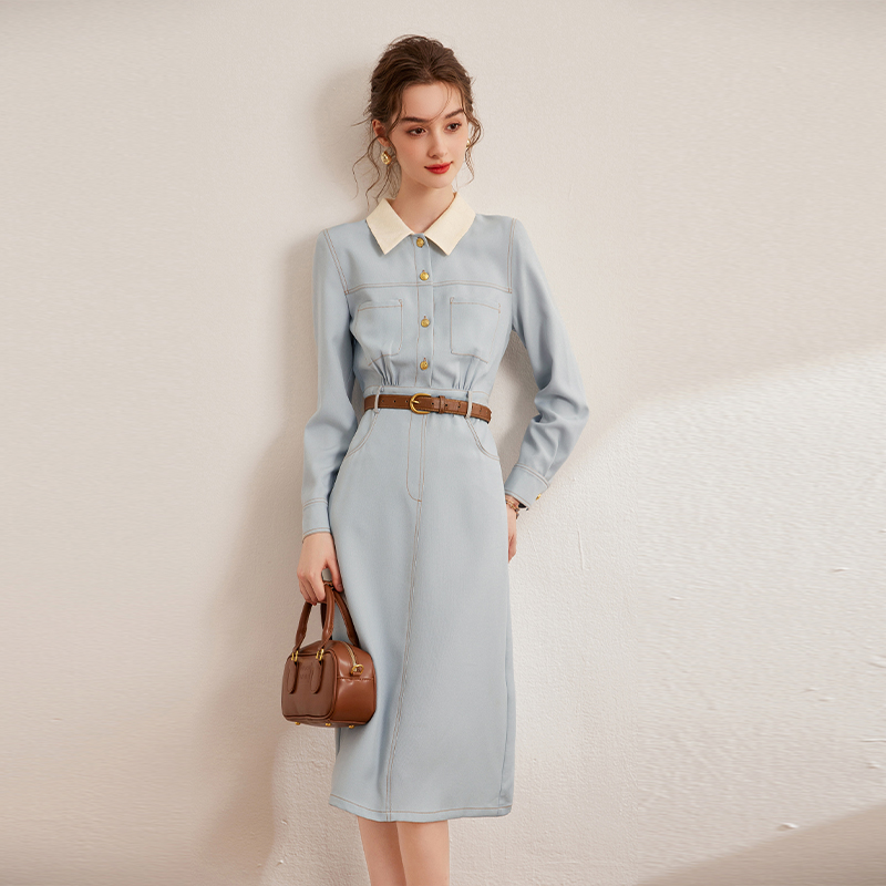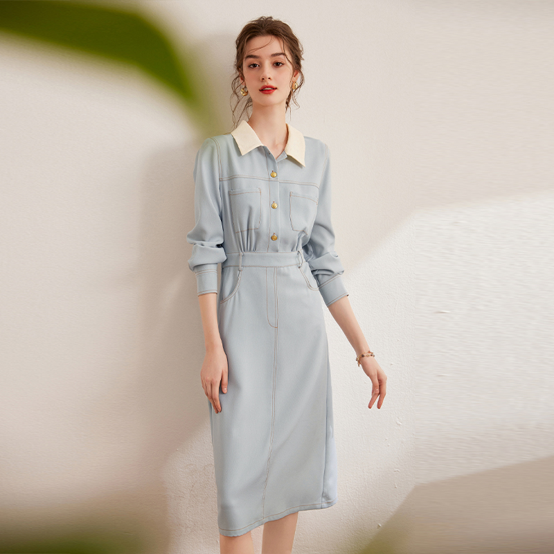 白鹿语撞色拼接翻领长裙2024秋通勤气质修身牛仔线无弹长袖连衣裙