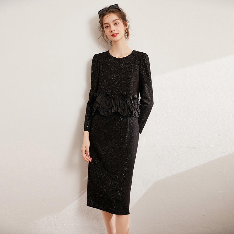 白鹿语立体花朵拼接假两件长裙2024秋季新款圆领烫压长袖连衣裙女