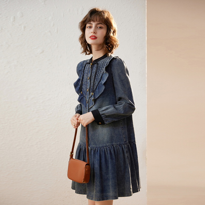 白鹿语撞色小立领盘扣洗水牛仔裙春款风琴褶荷叶边连衣裙女