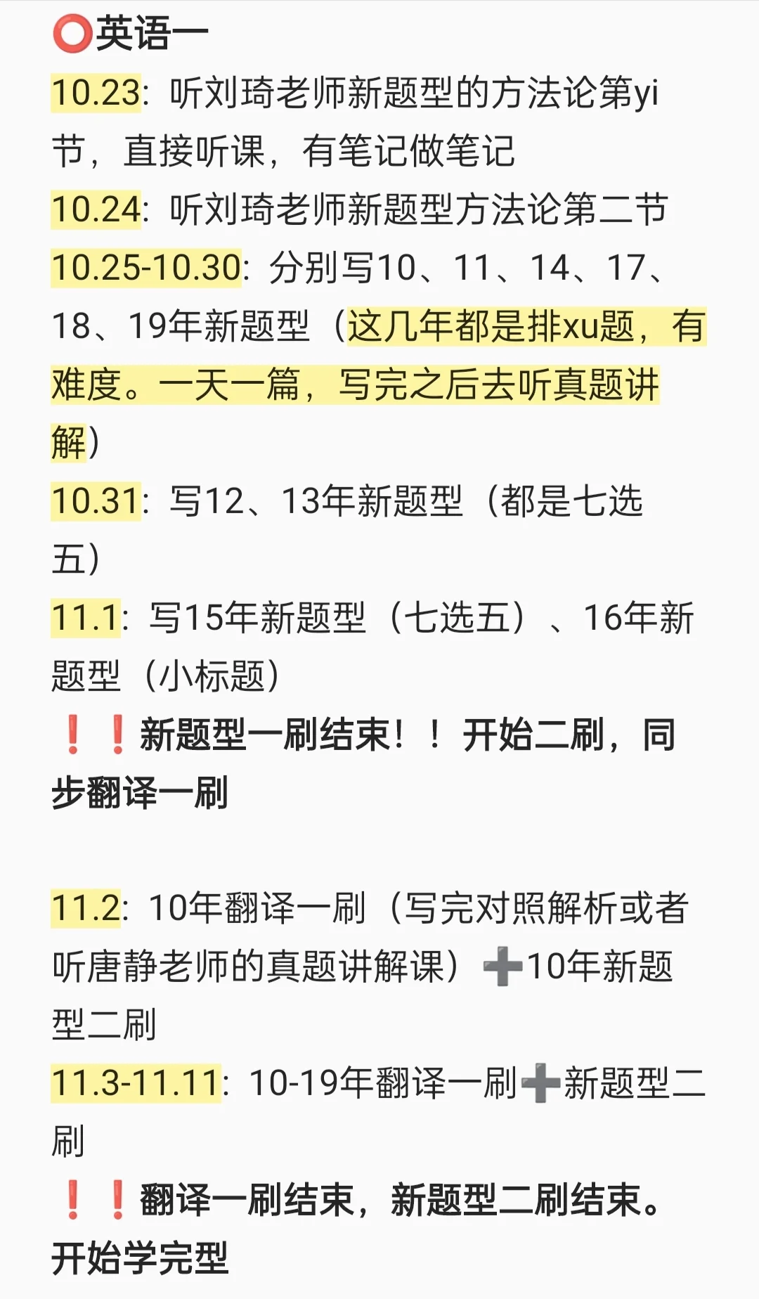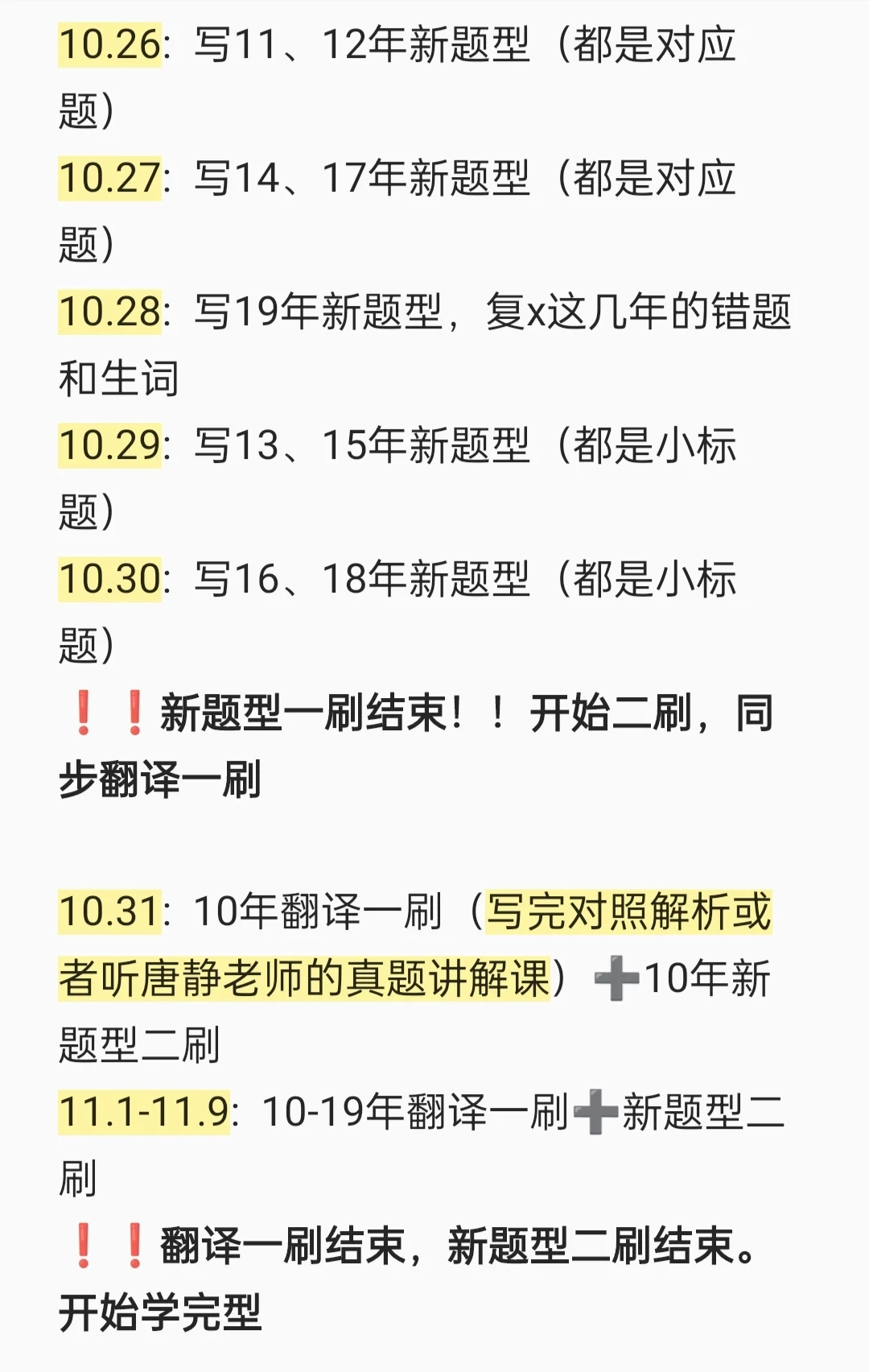 10.31: 10年翻译一刷(写完对照解析或者听唐静老师的真题讲解课)➕10年新题型二刷