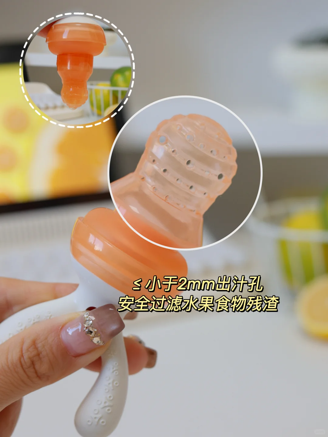 很多咬咬乐的顶部都是有小孔的,这样宝宝咬的时候就会出现一个问题,果泥可能直接从小孔里面“直冲”孩子喉咙,🫣对于宝宝来说也是一个安全隐患,我选的这个顶部没有小孔而且咀嚼网袋上面的纹路还是仿牙齿弧度的,🦷更贴合宝宝的牙床,让宝宝咀嚼的时候更轻松呀~