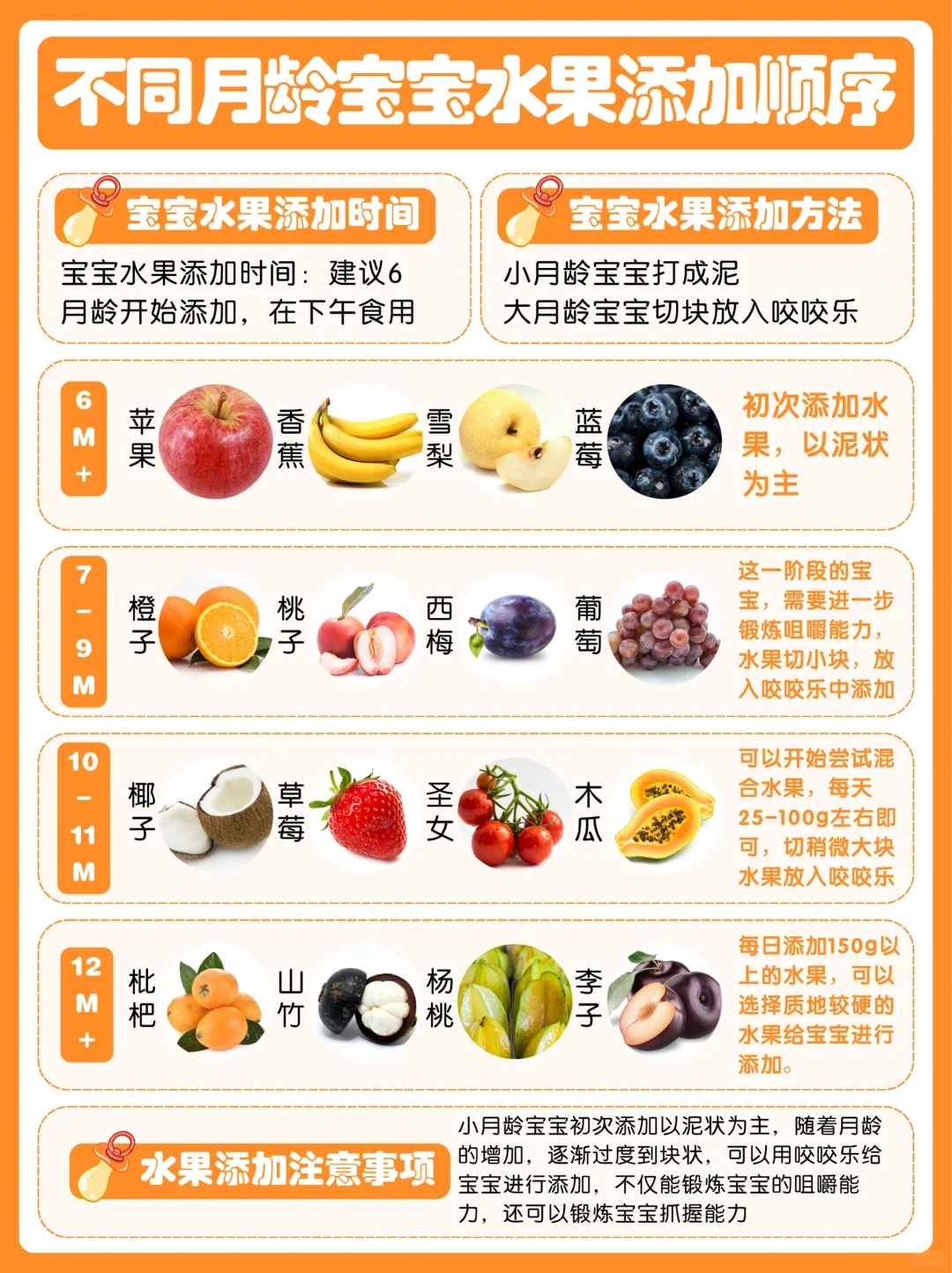 6个月:以常见的苹果🍎、香蕉🍌为主,打成泥喂给孩子吃。