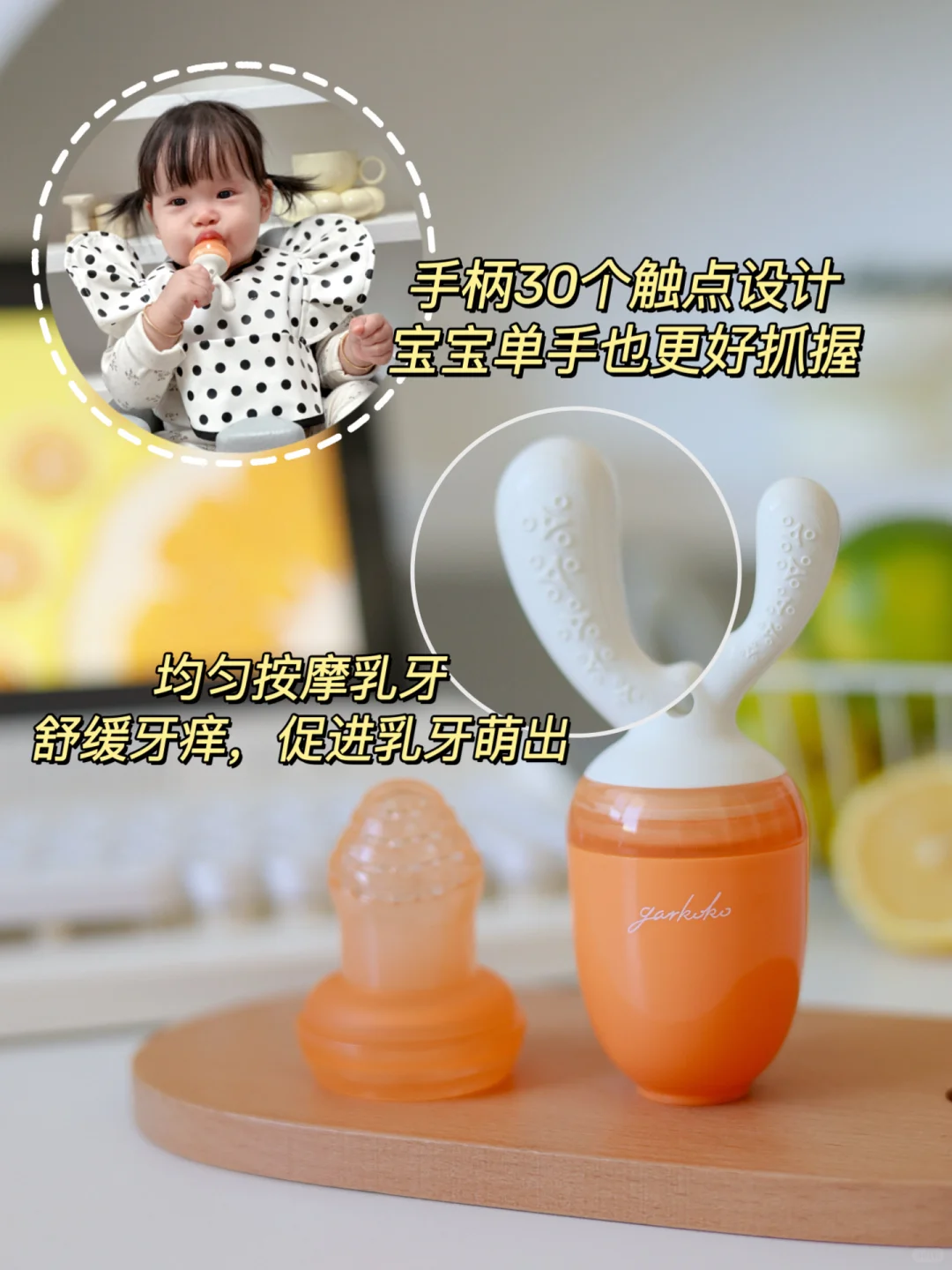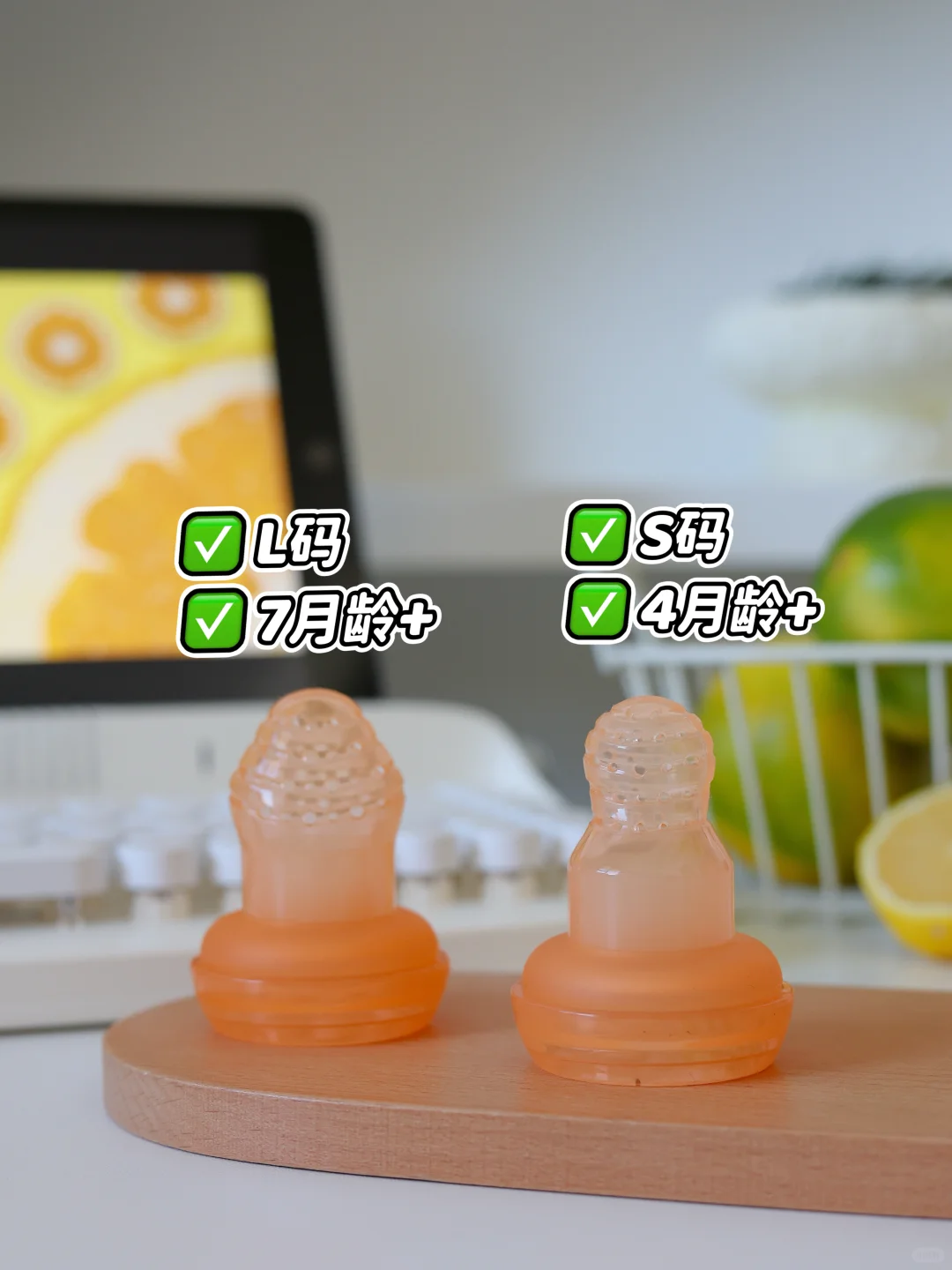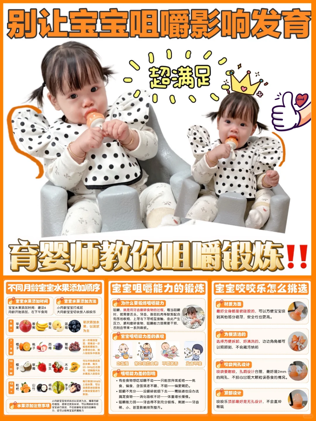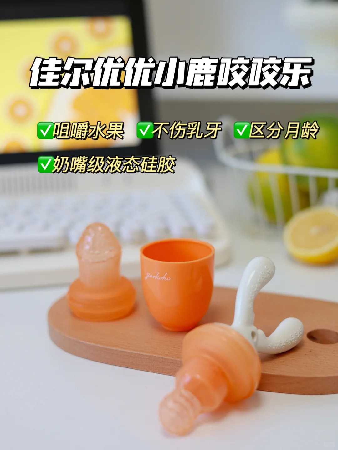 7—9月:可以解锁橙子🍊、桃子🍑等水果,需要锻炼孩子咀嚼能力,可以把水果切成小块儿放入咬咬乐。