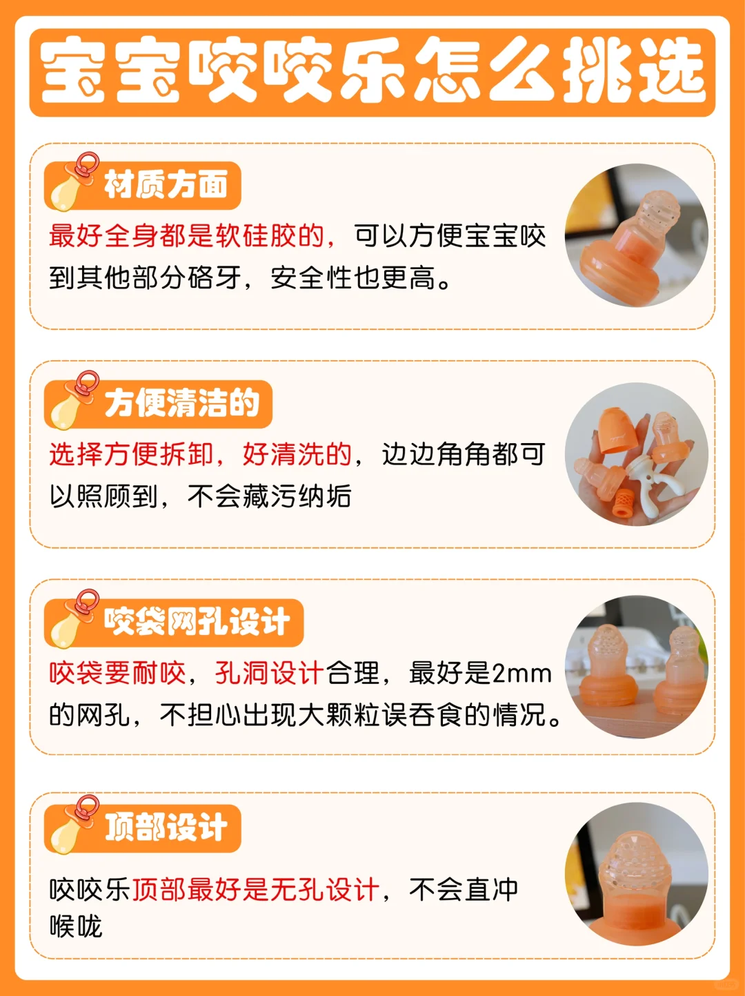 为了锻炼宝宝的咀嚼能力,家长们可以给宝宝选一个好用的咬咬乐,选的时候可以从以下几方面入手