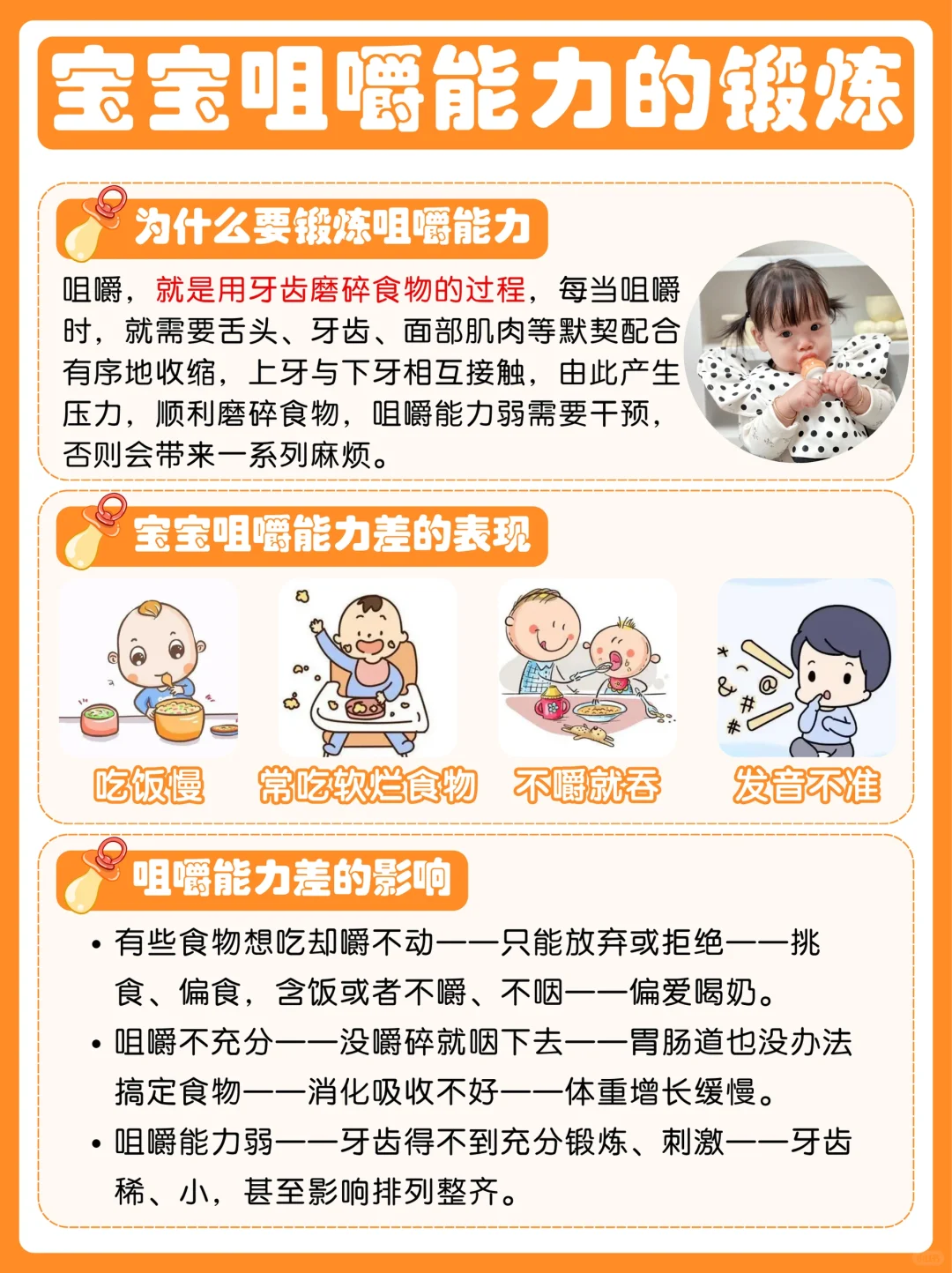 家长们可以感受到一个问题,那就是给宝宝添加辅食的这个过程,咱们要时刻关注孩子的咀嚼能力,👍咀嚼能力看似简单,但是其实对于宝宝的成长来说至关重要,因为如果孩子咀嚼能力跟不上的话,那宝宝想吃的食物却嚼不动,😭时间长了可能会影响孩子吃饭的积极性,咀嚼不充分的食物也可能影响孩子消化吸收,长此以往可能会影响孩子长肉长个。🤯