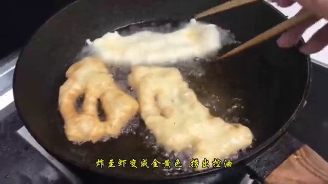6. 锅中油温烧至五成热下入虾,小火慢炸,炸至虾变成金黄色捞出控油。