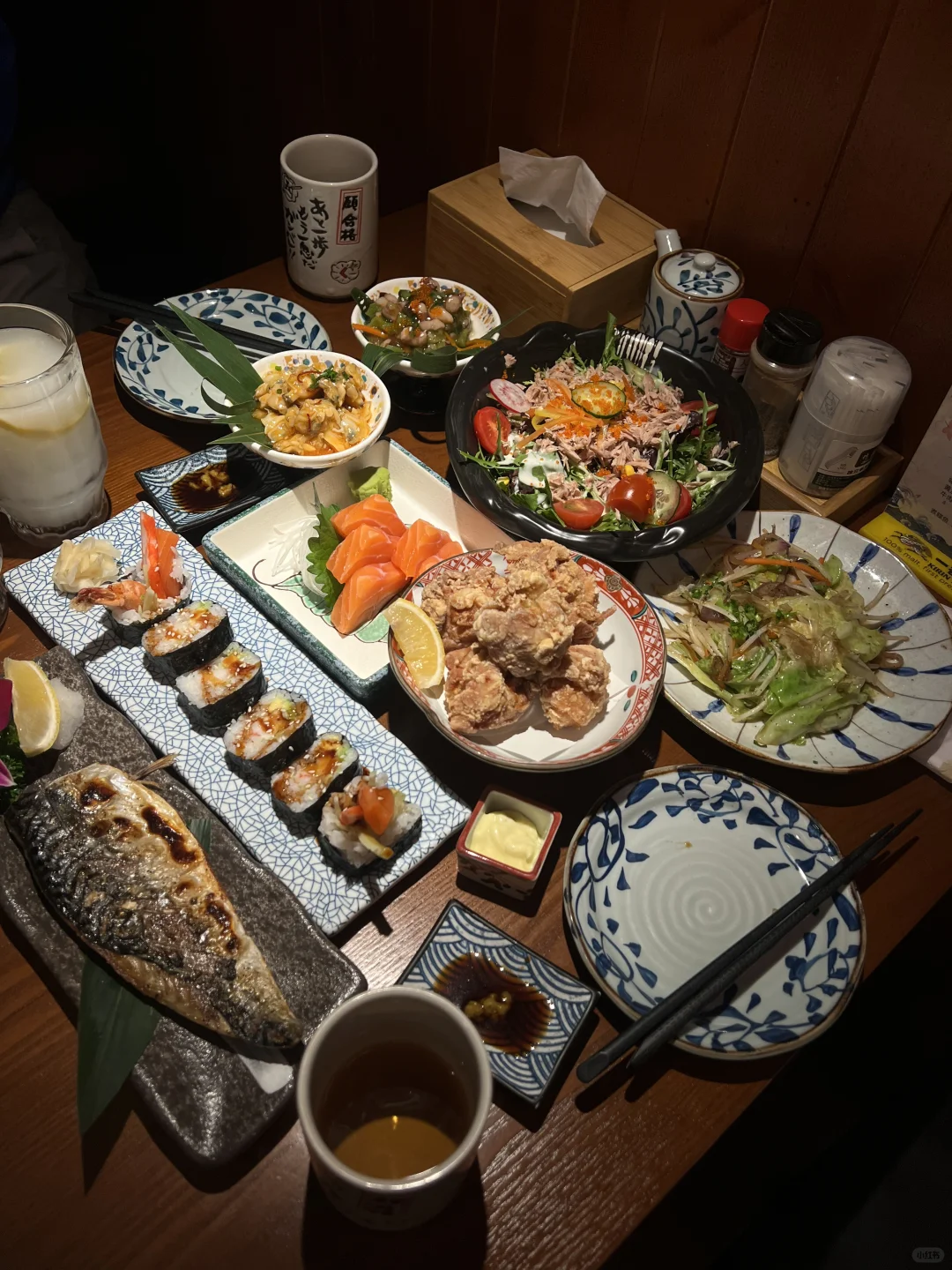 收藏这家店好久了,终于吃上了!! 你们可以闭眼冲了! 这家日料真的是在亦庄没对手‼️ 工作日都是满座 可以提前打电话预约过去! 环境布置的很温馨,非常日式~~ 厨师做食物是可以看的到的 点了一个套餐太好吃后来又单独加了别的 🍣厚切三文鱼必点,厚切的吃起来炒满足! 从此爱上了厚切 🍗他们家招牌炸鸡块一定要吃!!想吃炸鸡好久了没想到他们家炸鸡满足了我,肉特别嫩,外表酥酥脆脆的很绝! 和风炒时蔬还有她们家特制的寿司卷都好吃 这么说吧点的菜一个都没有踩雷! 从此去亦庄多了个理由!