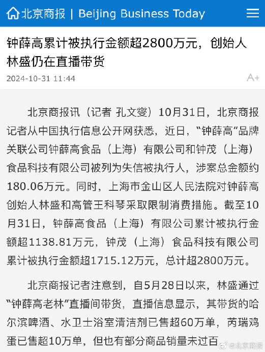[#钟薛高累计被执行超2800万#,#钟薛高创始人林盛仍在直播带货#]10月31日,@北京商报记者从中国执行信息公开网获悉,近日,“钟薛高”品牌关联公司钟薛高食品(上海)有限公司和钟茂(上海)食品科技有限公司被列为失信被执行人,涉案总金额约180.06万元。同时,上海市金山区人民法院对钟薛高创始人林盛和高管王科琴采取限制消费措施。截至10月31日,钟薛高食品(上海)有限公司累计被执行金额超1138.81万元,钟茂(上海)食品科技有限公司累计被执行金额超1715.12万元,总计超2800万元。