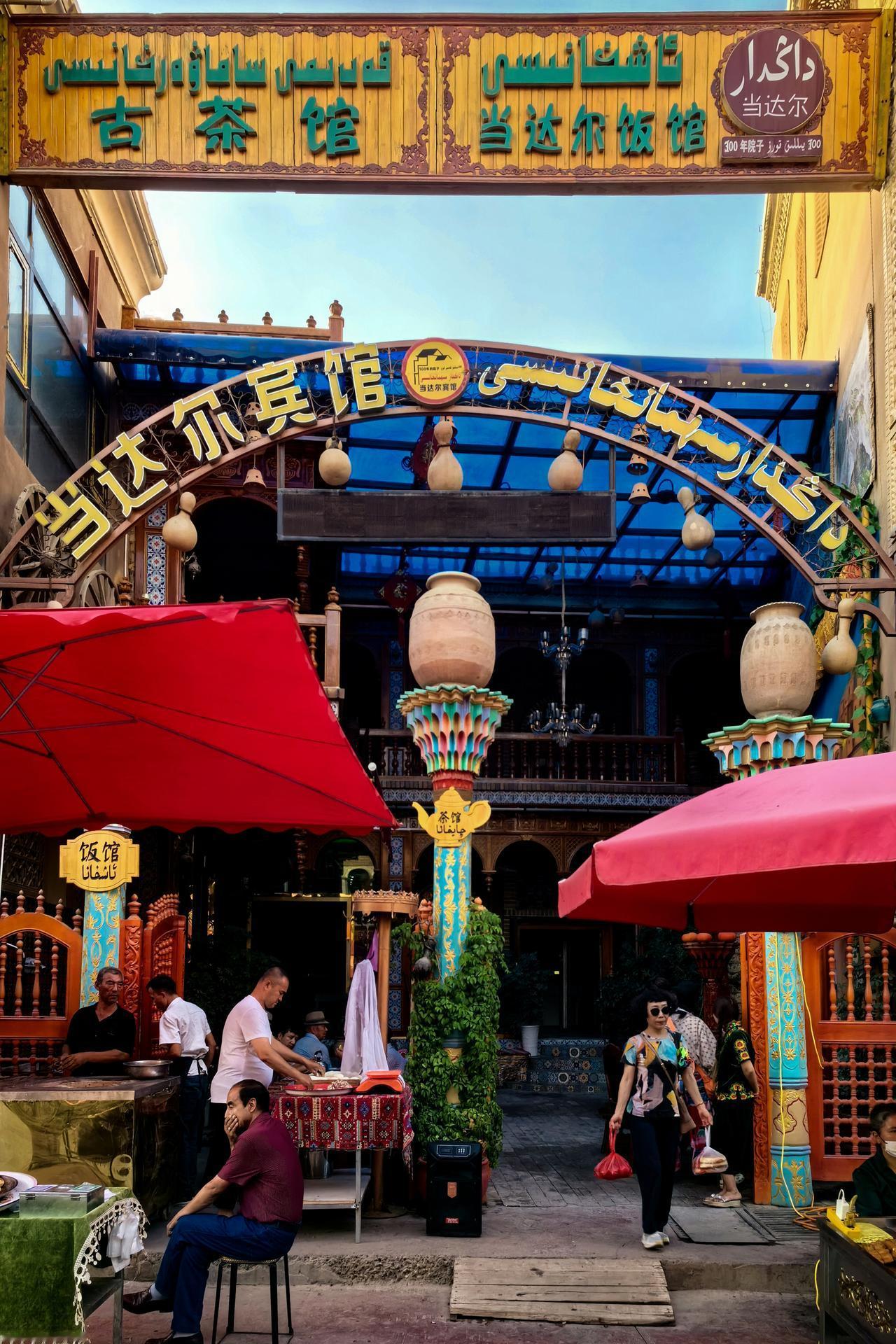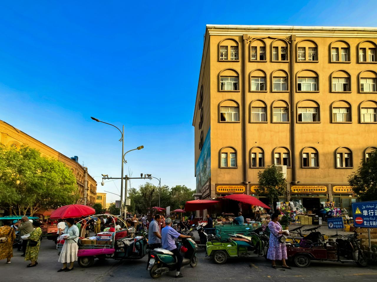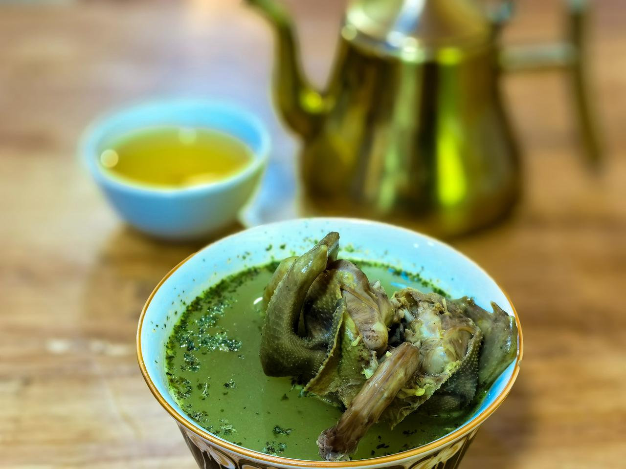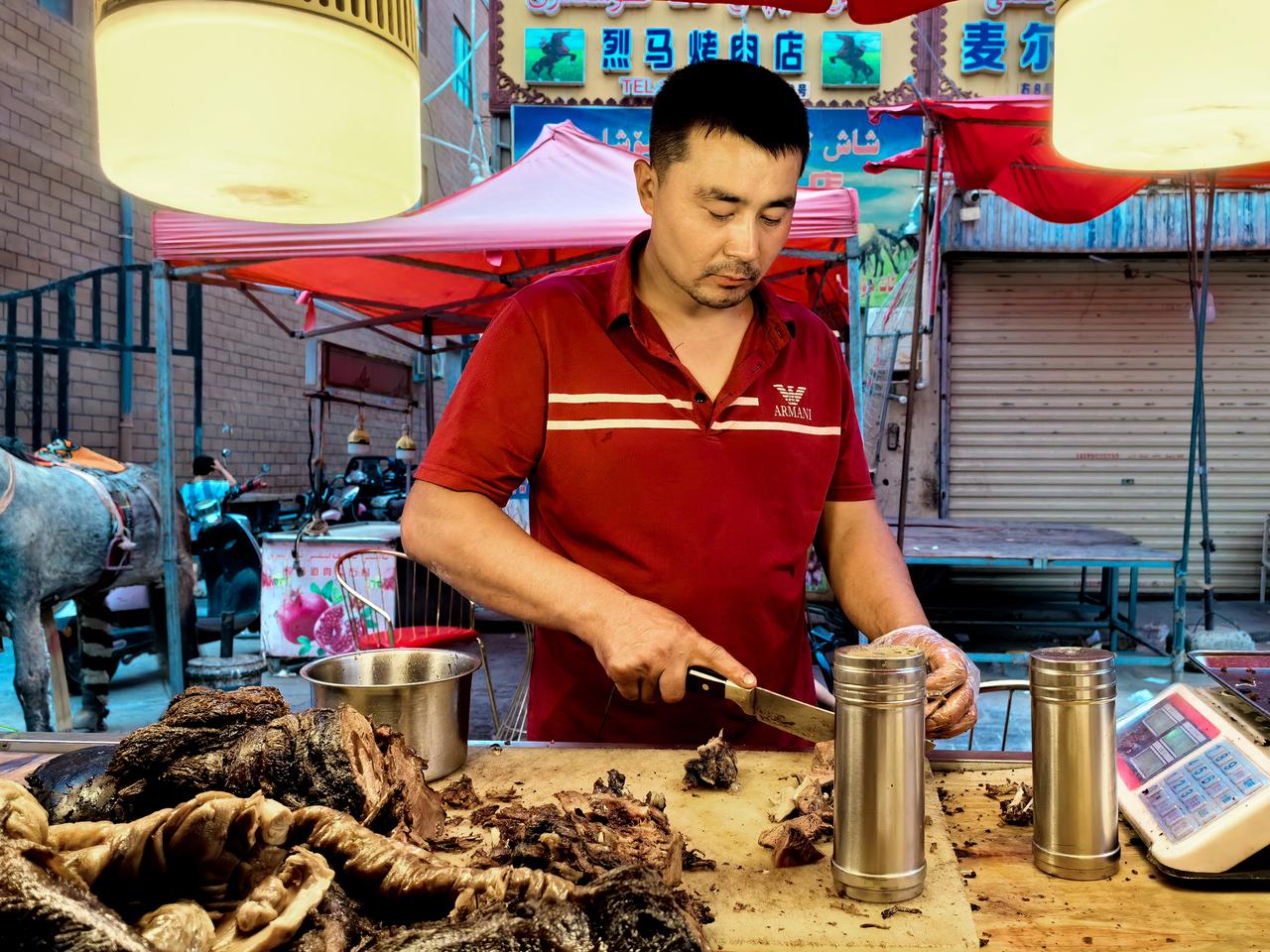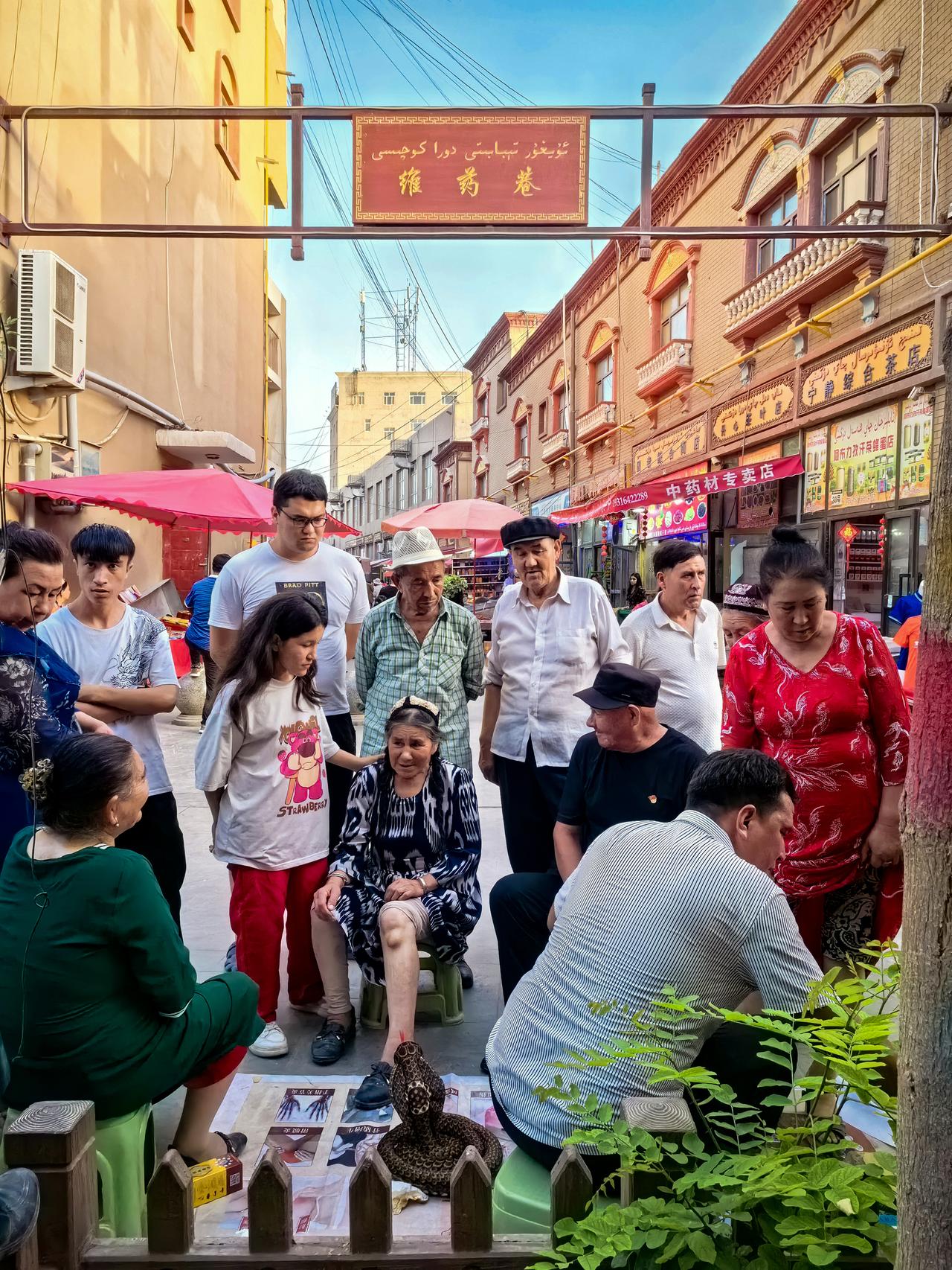 莎车人说,没有一个鸽子能飞出莎车。果然,莎车老城有一整条街,都卖鸽子汤,我就要了一碗,感觉还行,一只鸽子放在碗里,上面漂着一层绿色的什么调料。必须要声明,我觉得莎车人做鸽子的水平,还是不如广州。 整体而言,莎车老城有点像喀什,但没有喀什那么商业化,能感受到莎车的以前。莎车府、十二木卡姆,叶儿羌汗国王陵,或者路边的茶馆、马肉店、乐器店、手工作坊,甚至有人拉着羊在街头走过,是不是觉得很莎车? 一群人聚集在维药巷口(图8),似乎有什么热闹可看?我从人缝里挤进去,原来有个壮汉在摆摊,他正在指着一条盘起来的假蛇介绍维吾尔药。一位戴着四角帽的阿姨,挽起裤管,露出腿上的一个大包,让这汉子治疗。我突然记起,已经有些年头没看到这种膏药摊了,在莎车遇见,仿佛又回到过去。#秋日生活打卡季#