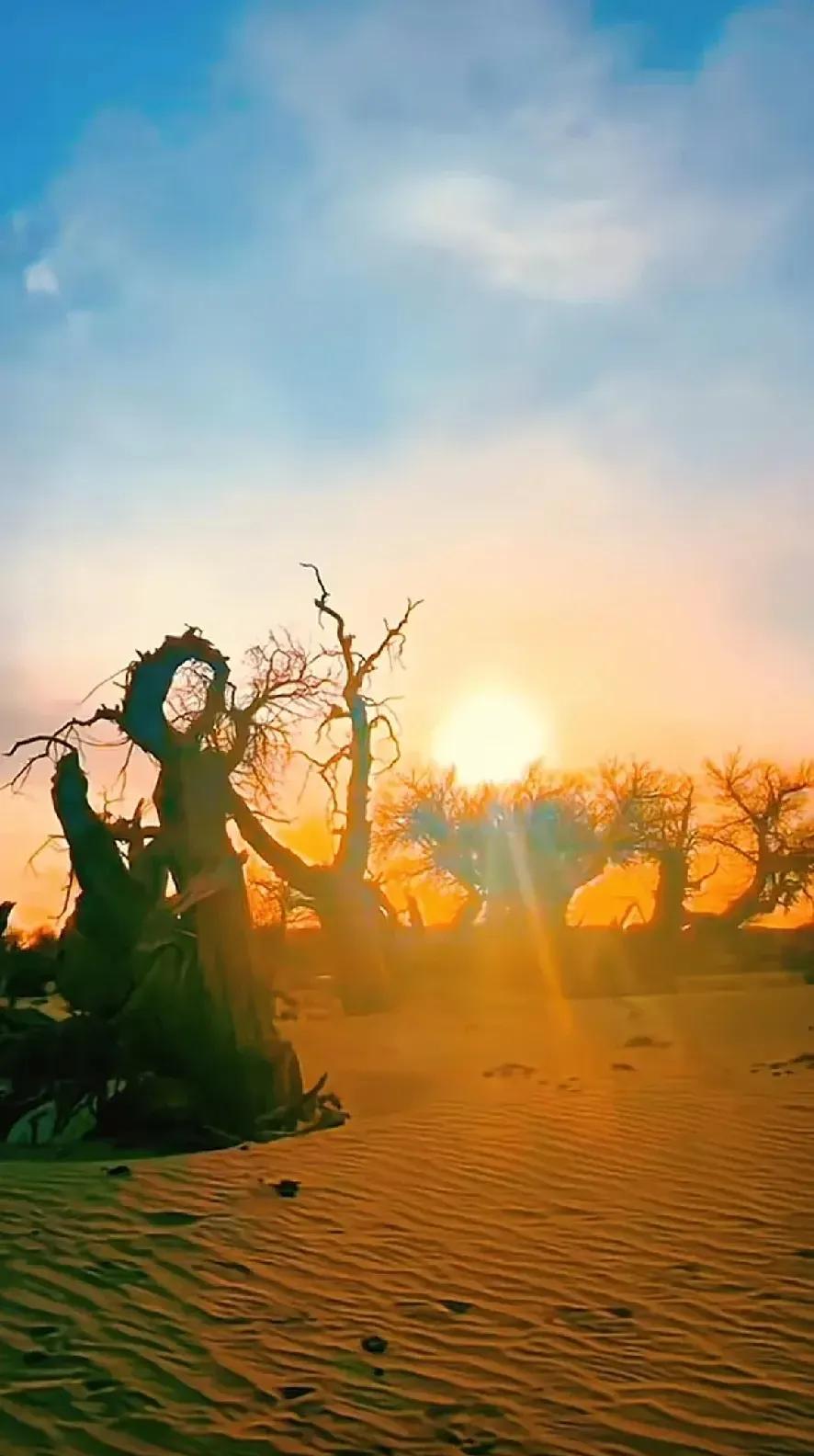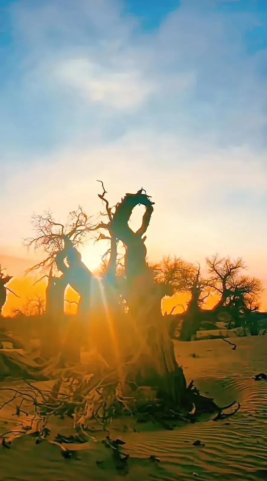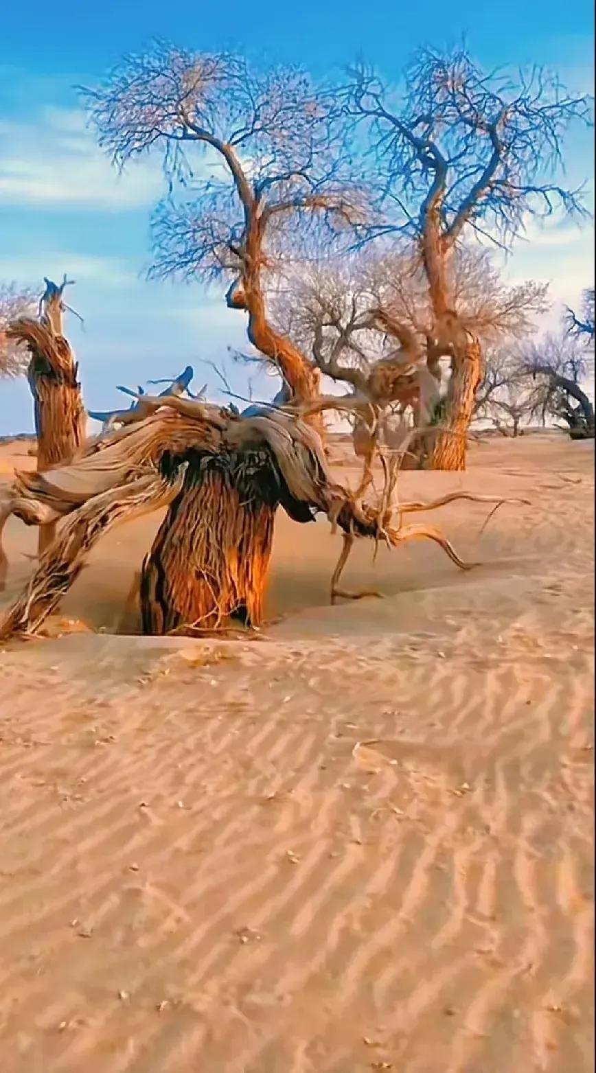 夕阳西下,将这片沙漠染成了金色的世界,古老的胡杨树诉说着无尽的故事。#原始胡杨树