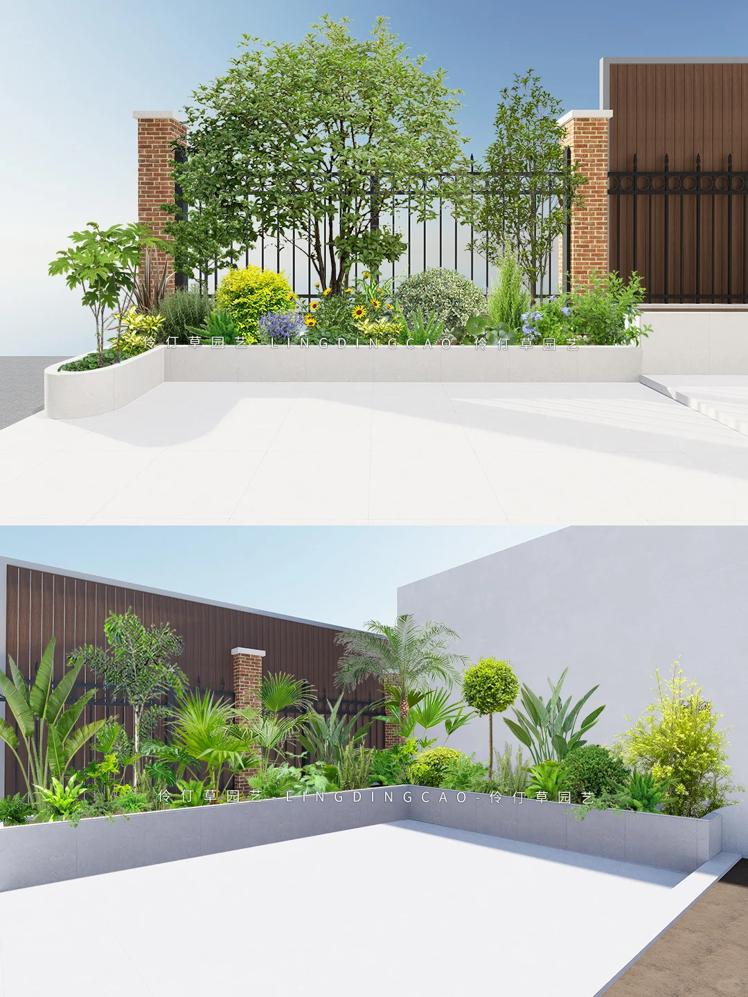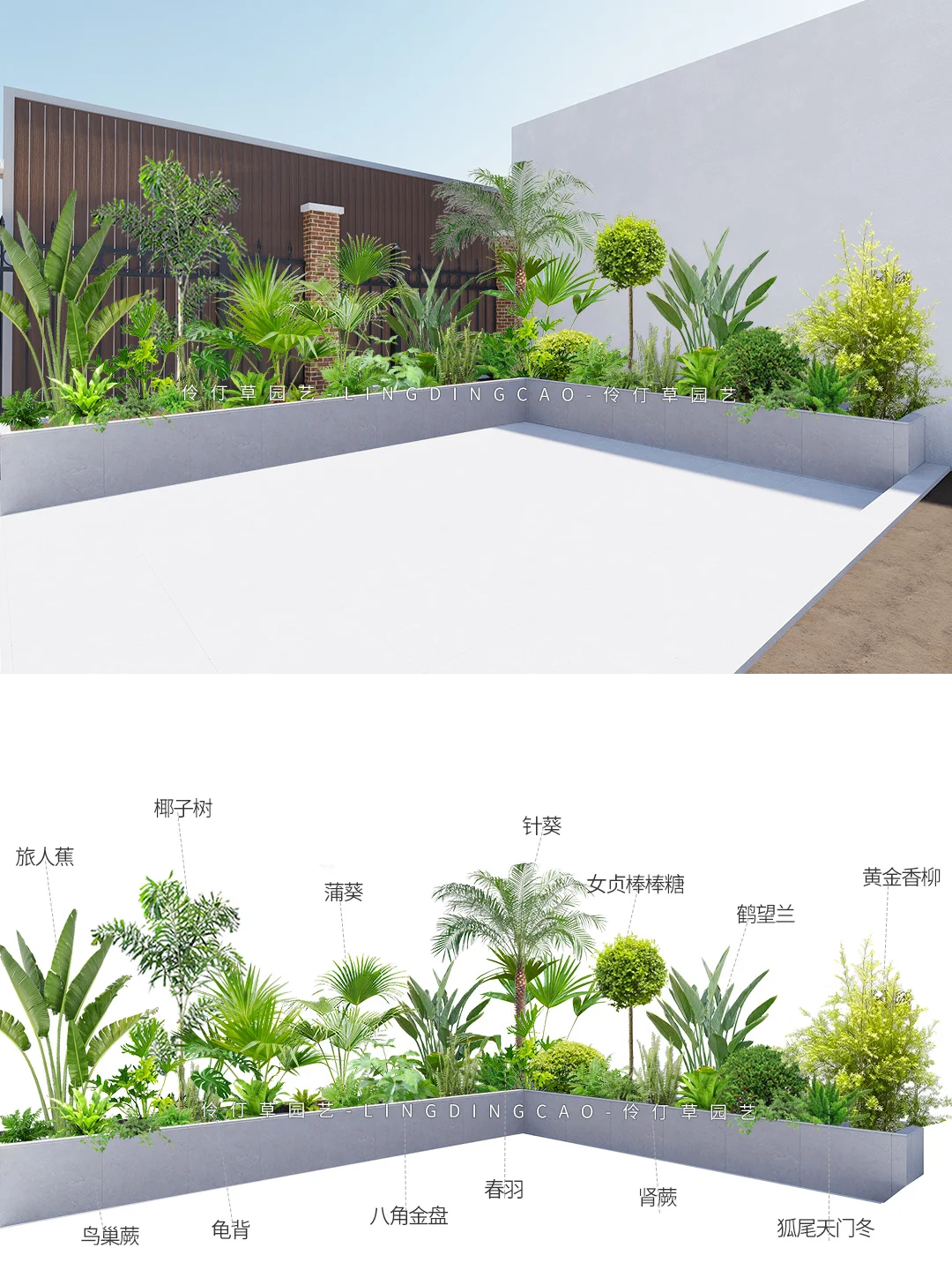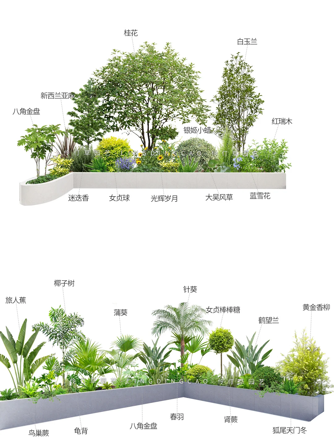 植物配置一:旅人蕉、椰子树、蒲葵、针葵、女贞棒棒糖、鹤望兰、黄金香柳、狐尾天门冬、肾蕨、春羽、八角金盘、龟背 植物配置二:八角金盘、新西兰亚麻、桂花、白玉兰、红瑞木、蓝雪花、大吴风草、女贞球、迷迭香