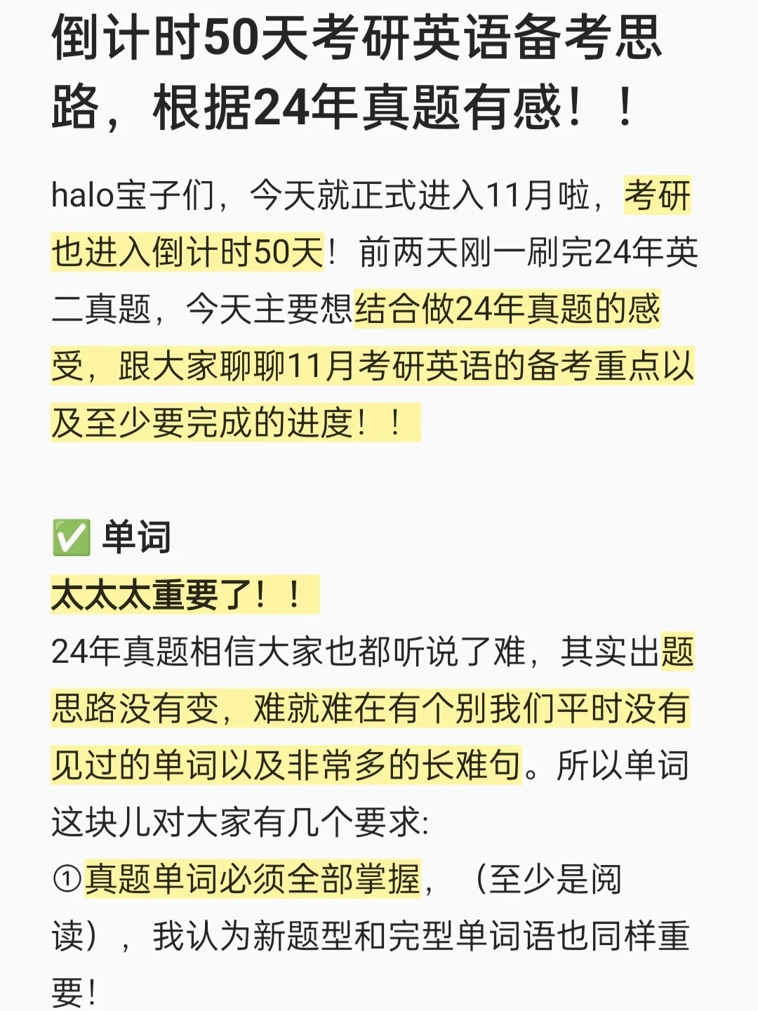 halo宝子们,今天就正式进入11月啦,考研也进入倒计时50天!前两天刚一刷完24年英二真题,今天主要想结合做24年真题的感受,跟大家聊聊11月考研英语的备考重点以及至少要完成的进度!!
