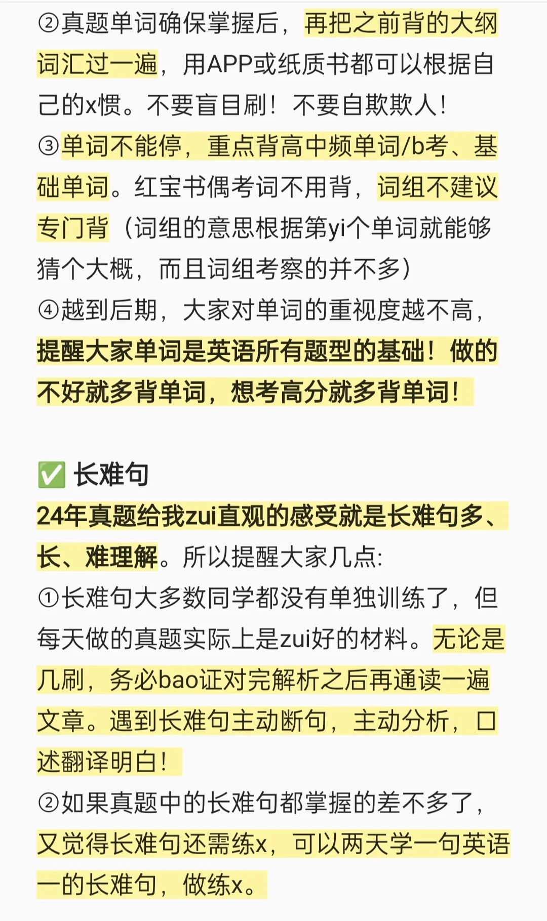 24年真题相信大家也都听说了难,其实出题思路没有变,难就难在有个别我们平时没有见过的单词以及非常多的长难句。所以单词这块儿对大家有几个要求: