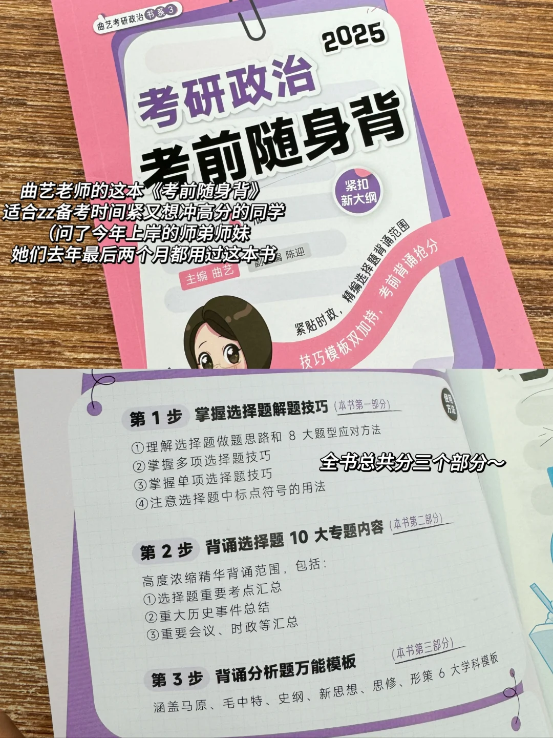 zz备考时间紧又想掌握一些选择题的技巧、分析题的模板的同学可以用曲艺老师的《考前随身背》,我问了十几个今年上岸的考zz的学弟学妹,大多数同学去年这个时候都用到这本书。这本书有三个部分,第yi部分是【选择题做题必备技巧】,8大题型,5种排除,单选多选的技巧都涵盖其中。第二部分是【多项选择题高分应对技巧】,共有10个专题讲义,九、十是国内国际重要时政考点汇总,不用再额外买时政书了。第三部分是【分析题模板】,6个学科只有23个模板,全是精华内容,真正减轻备考🦆力。有需要的宝子早买早背!