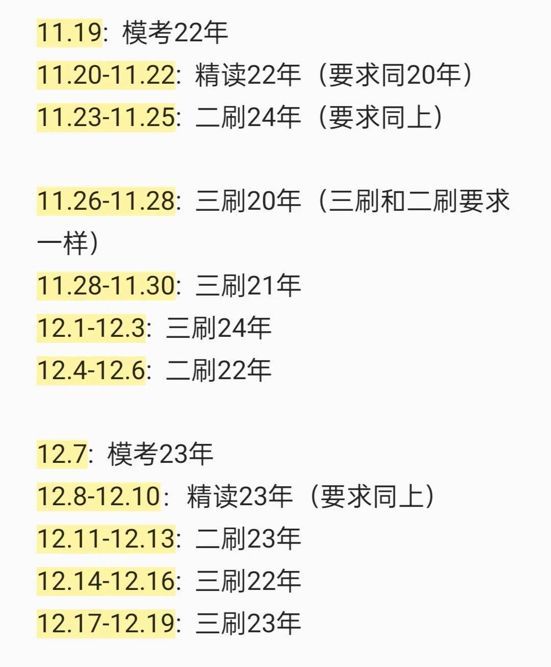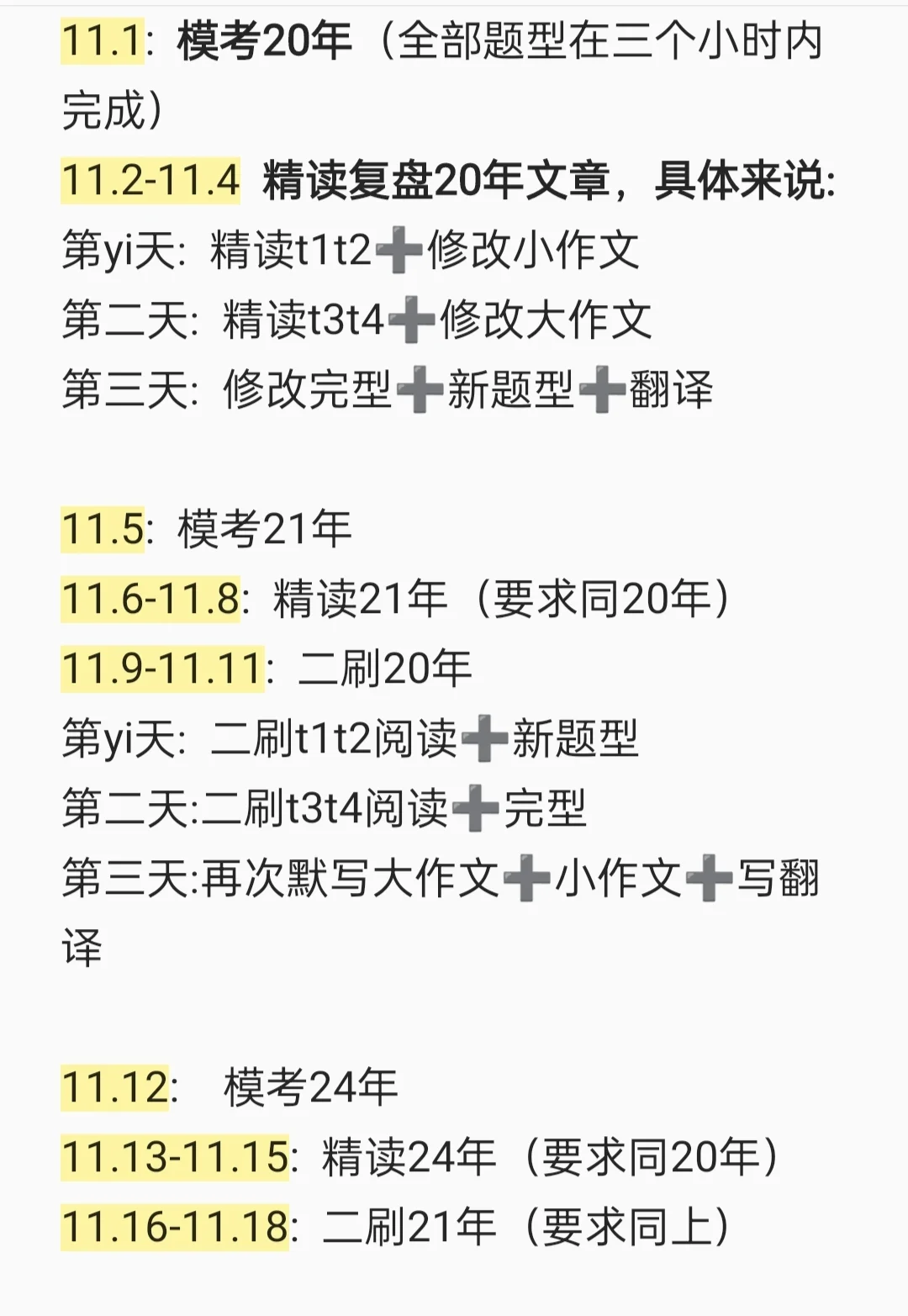 halo宝子们,11🈷️要安排近几年的题进行模考了。如果大家留的是20-24年近五年的题,建议大家zui晚11.10左右安排模考,太晚的话近五年的真题刷不透。今天分享如果从11.1开始安排模考的时间规划