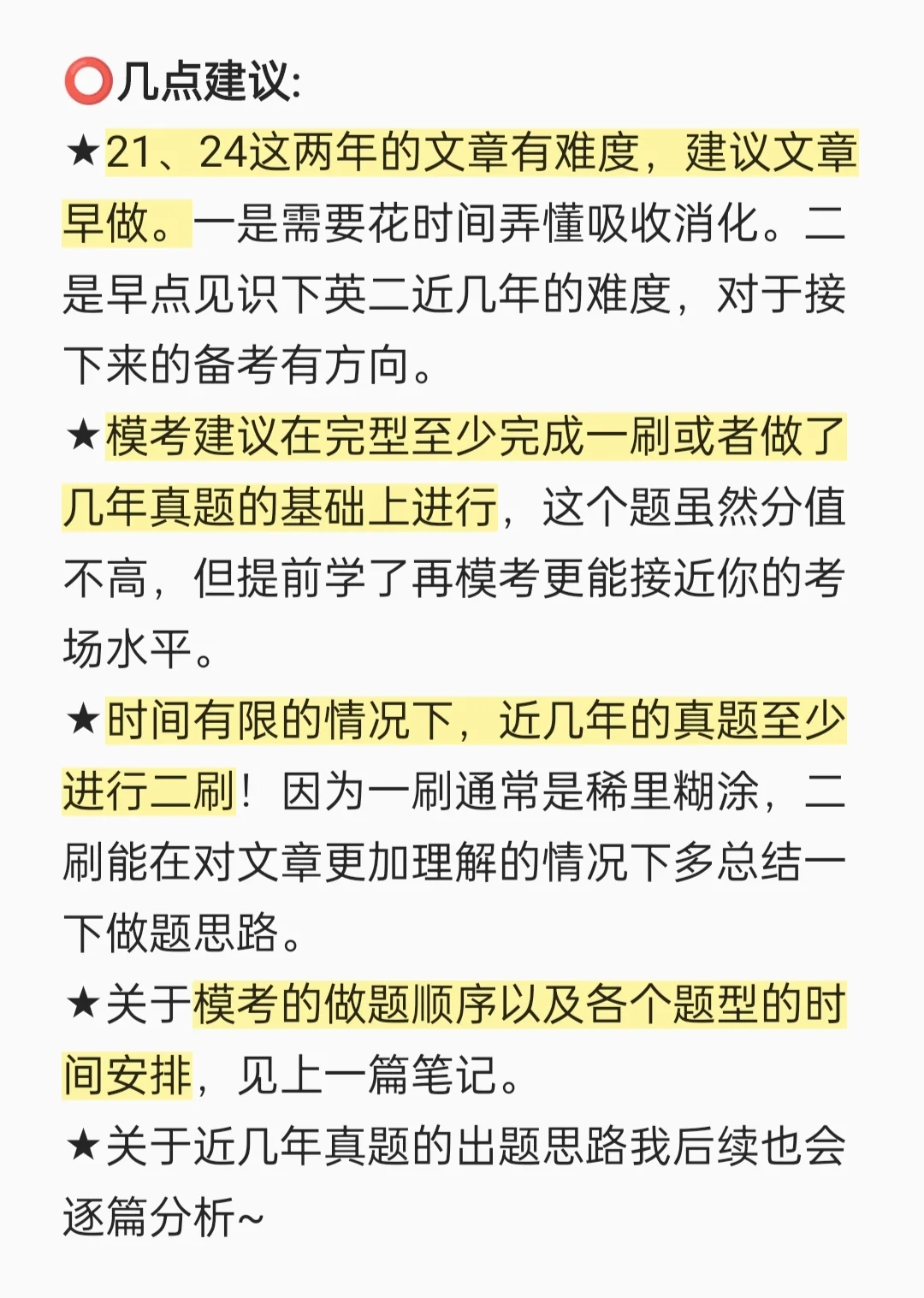 ★21、24这两年的文章有难度,建议文章早做。一是需要花时间弄懂吸收消化。二是早点见识下英二近几年的难度,对于接下来的备考有方向。
