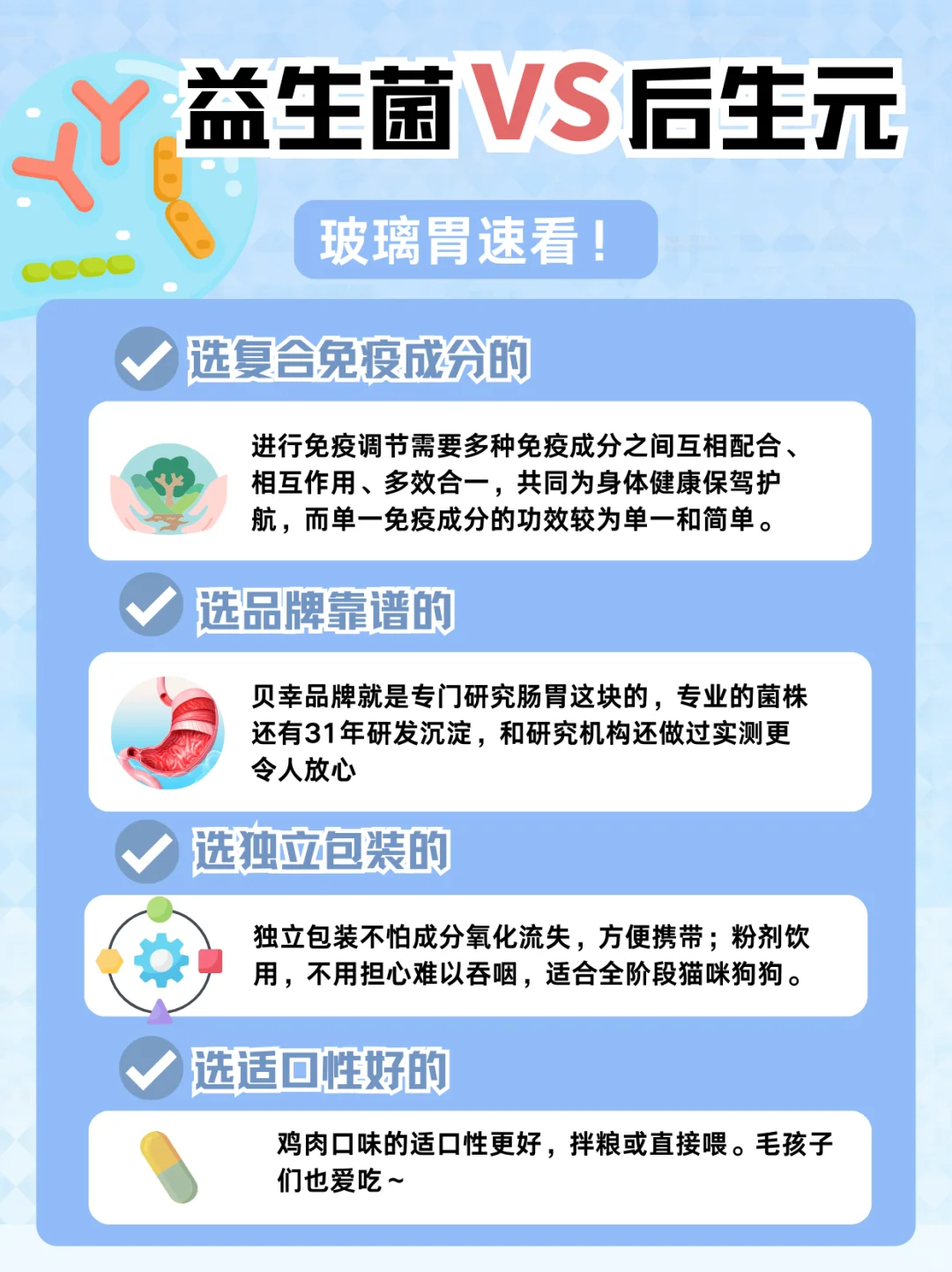 很多人会喂益生菌,但是相比于益生菌,其实后生元效果会更好!比普通益生菌更加耐高温耐酸,稳定性也更加好!!