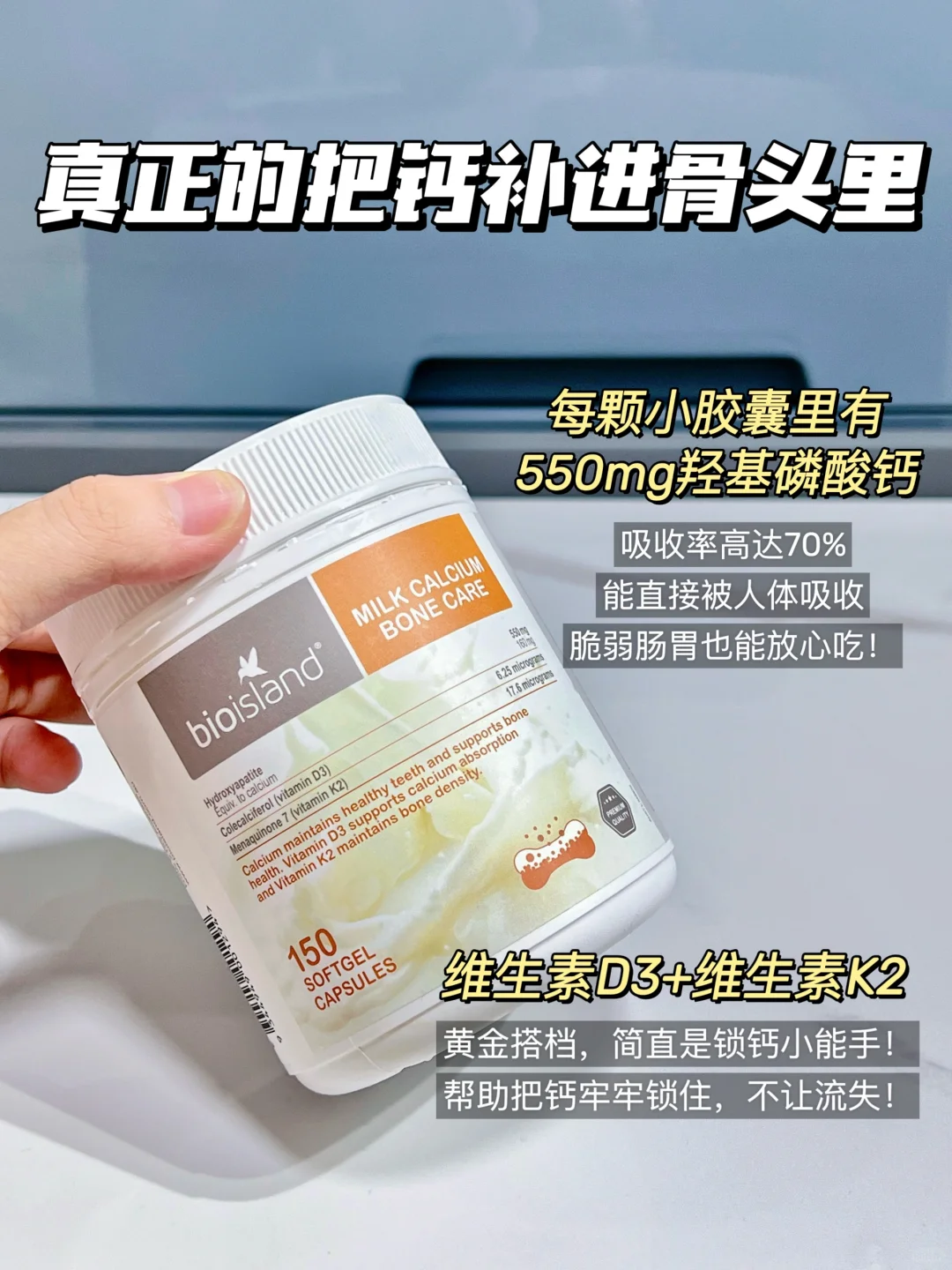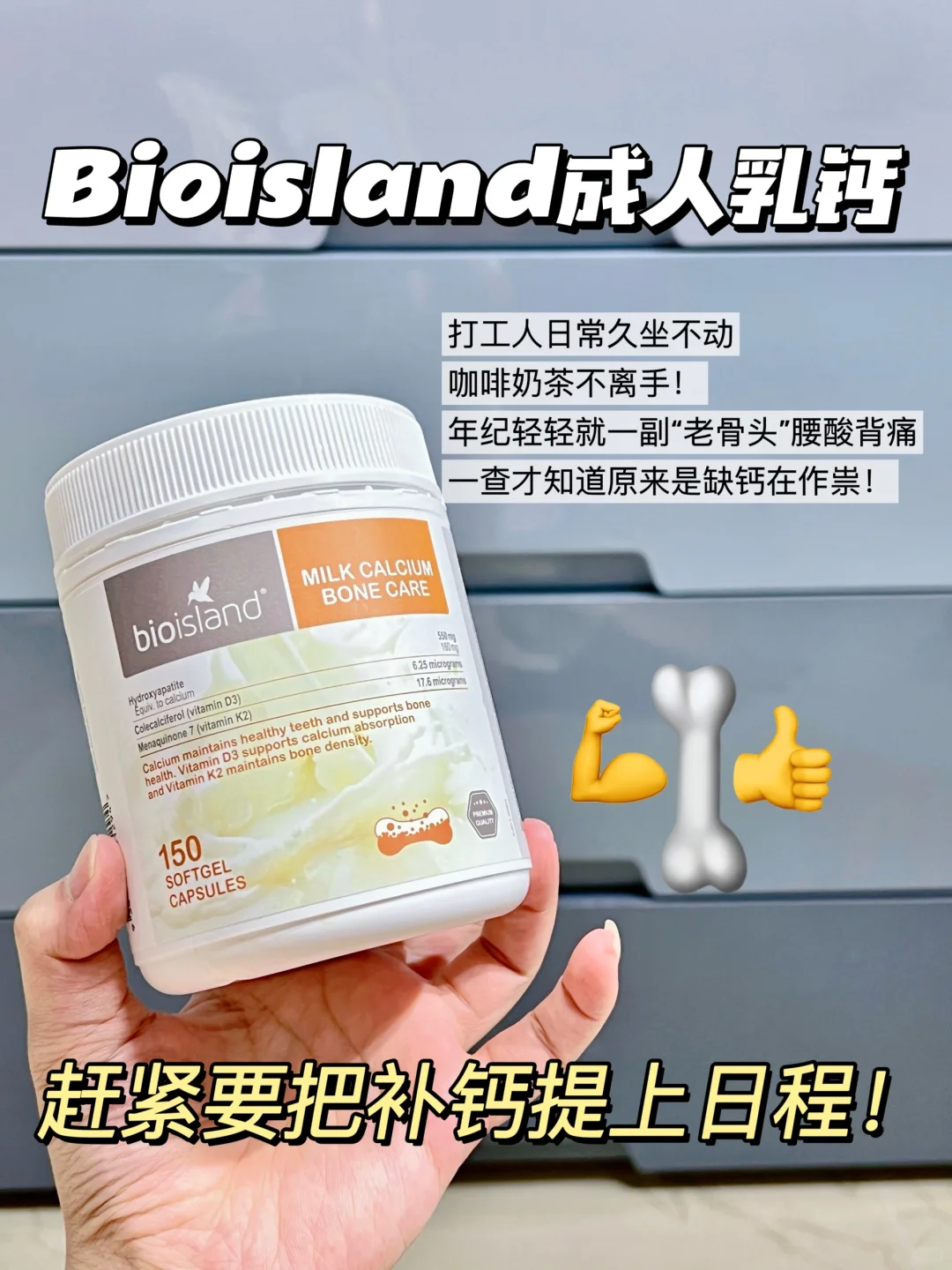 自从加入996打工人之后 在办公室一坐就是一整天 咖啡奶茶不离手! 年纪轻轻就一副“老骨头”腰酸背痛 就像是好久没动过的老机器一样! 后来一查才知道原来是缺钙在作祟! - 刚好上周末逛山姆超市的时候,发现了👉Bioisland成人乳钙 对比了下市面上的其他补钙神器! 觉得这款还不错,二话不说直接收入囊中! - 这牌子可是澳洲本土的明星 而且还是澳洲TGA认证的哦! 仔细研究了它的成分表,发现人家就是正儿八经的给身体补钙! 全是天然牛乳里提取的精华——液体钙! 每颗小胶囊里都藏着550mg的羟基磷酸钙 吸收率高达70%!能直接被人体吸收! 脆弱肠胃也能放心吃! 而且还添加了维生素D3+维生素K2 这对黄金搭档,简直是锁钙小能手! 帮助把钙牢牢锁在身体里,不让它偷偷溜走! - 一天随餐吃2粒就行! 一天2粒就相当于550mg的钙 就像是你偷偷喝了五杯香浓牛奶,营养满满,还不长胖哦! 而且超大一桶!一家老小都能共享这份健康小秘密! - 上周和闺蜜去爬山看日落, 我简直是活力四射,一点不觉得累! 真心推荐给所有忙碌的“脆皮打工人”,赶紧给自己的小日子加点料,健康补起来,生活更美好!💪💖