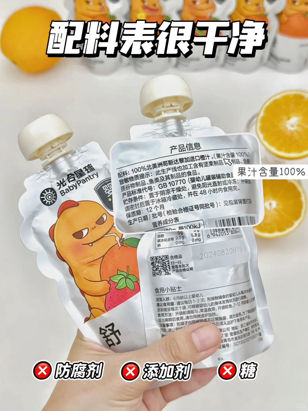 这款是符合婴标100%的真果汁,不加一滴水,也没有白砂糖,糖浆,香精,防腐剂,色素等乱七八糟的添加,配料表只有果汁,给宝宝喝特别放心!