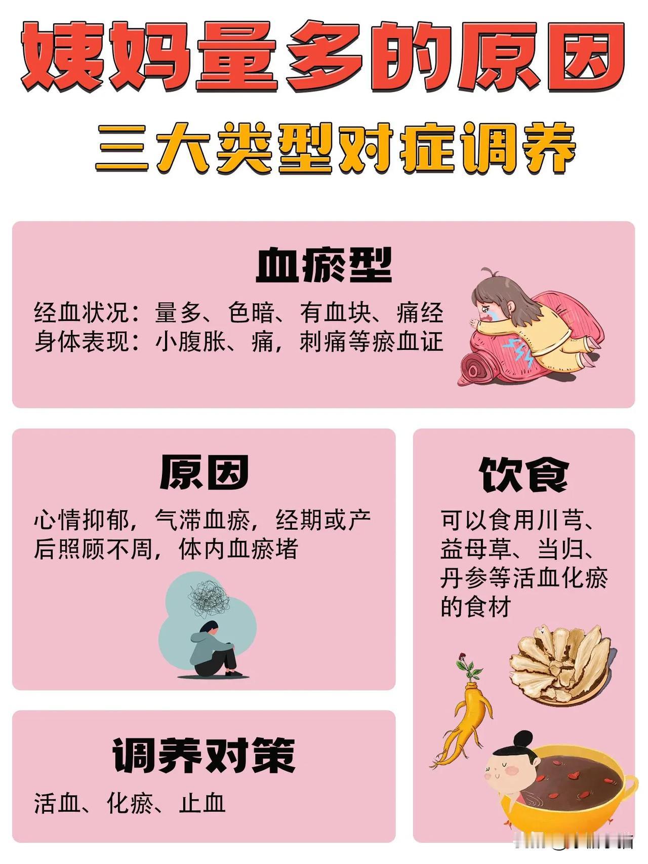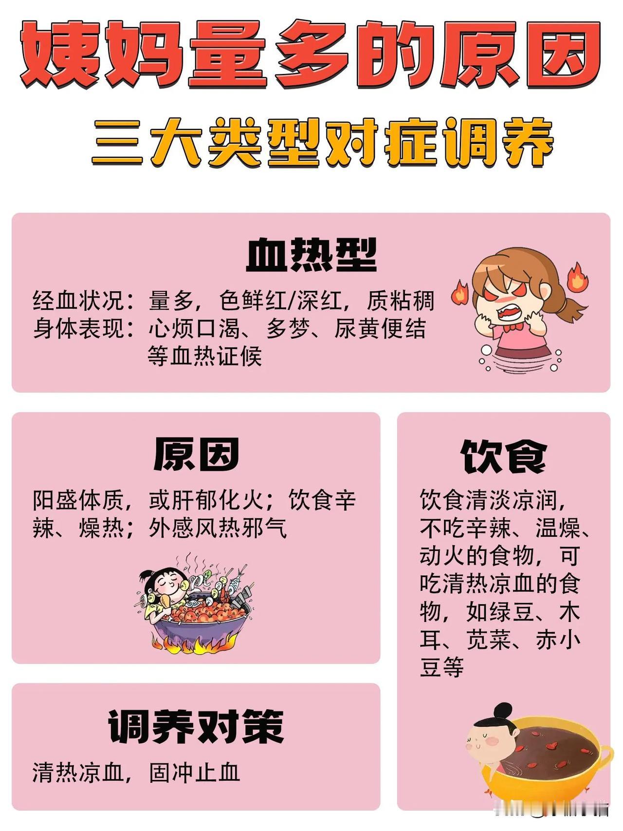姨妈量多三大类型❗️对症调养不轻视❗️ 每个月的“那几天”,对于很多女生来说都是一场考验。特别是当遇到大姨妈量过多的时候,不仅让人感到不适,还可能影响到日常生活。今天,就让我们来聊聊如何根据不同类型的症状,进行对症调养,让你在特殊时期也能保持最佳状态! 姨妈量多三大类型 气虚型 血热型 血瘀型 具体调养方案请看下图↓ 在调养的同时,也要保持良好的生活习惯,避免熬夜和过度劳累哦 #气血不足是这样# #之前气血不足# #关于我气血不足# #气血就上来了# #气血不足好烦人# #养好气血不易老# #养生分享之气血# #月经失调压力大# #养好气血💕# #看起来气血很足#