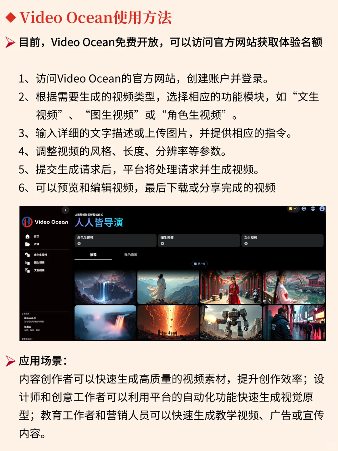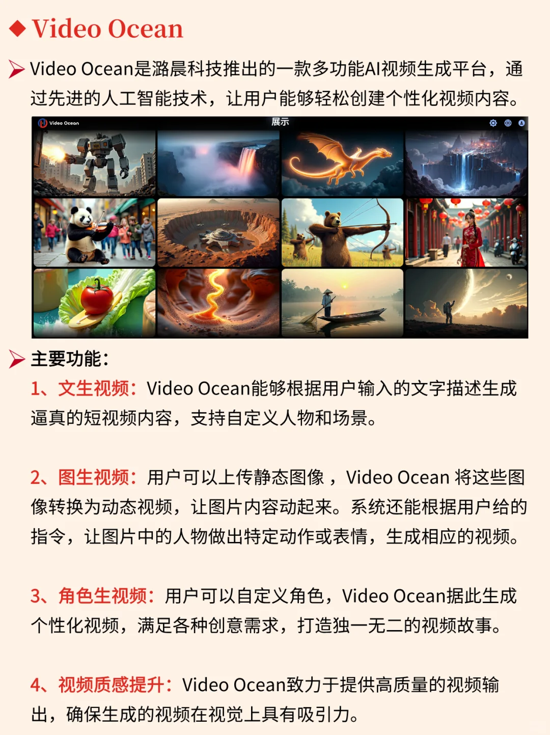 👭🏻 Video Ocean则是潞晨科技在视频生成领域的一次大胆尝试。💻 它是一个多功能AI视频生成平台,能够根据用户的文本描述或图片生成逼真的短视频内容。Video Ocean的核心技术在于其能够理解和处理复杂的视觉信息,将用户的创意快速转化为视觉内容。无论是内容创作者、设计师还是营销人员,都能通过Video Ocean轻松创作出高质量的视频素材,提升创作效率和内容质量。