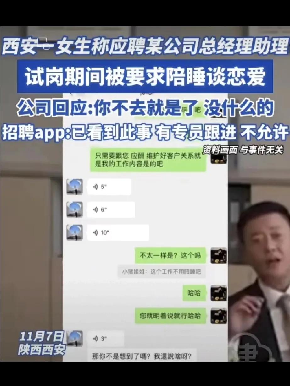 职场惊现“陪睡”乱象,底线何在? 在繁华的西安城,近日曝出了一则令人瞠目结舌的职场丑闻。一位女生应聘总经理助理一职,本以为是开启事业新征程的机会,未曾想竟遭遇如此不堪的要求。 据了解,11 月 6 日,这位勇敢的女生称去某公司面试时,起初听到的要求只是配合经理工作偶尔应酬。可到了试岗期间,画风突变,竟被要求陪睡,甚至公司陈总还提出要跟女生处对象。这简直是对职场的亵渎,对女性尊严的践踏! 咱们来算一算,每年有多少年轻人怀揣着梦想踏入职场,他们满心期待凭借自己的才华和努力,实现人生价值。然而,这样的事件无疑是给他们的梦想泼了一盆冷水。 这也不禁让人思考,这家公司到底是个怎样的存在?难道在招聘时就没有一点规范和底线?难道所谓的“领导”就能如此肆意妄为?专家曾指出,一个健康的职场环境,应当是公平、公正、尊重人性的。 当然,这位女生的勇敢曝光值得点赞。她的举动,让我们警醒,让我们有机会去审视和纠正这样的歪风邪气。 总之,这一事件给我们敲响了警钟,职场的清朗需要我们每个人去守护。不能让这种乌烟瘴气的事情,毁了年轻人的梦想,毁了我们心中理想的职场。 希望未来,每一个踏入职场的人,都能被尊重,都能凭借真本事打拼出一片属于自己的天地,而不是遭遇这种令人作呕的“潜规则”。