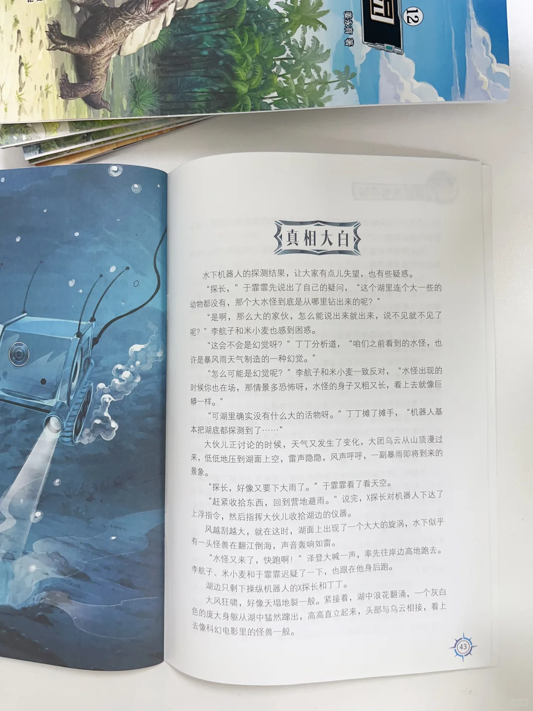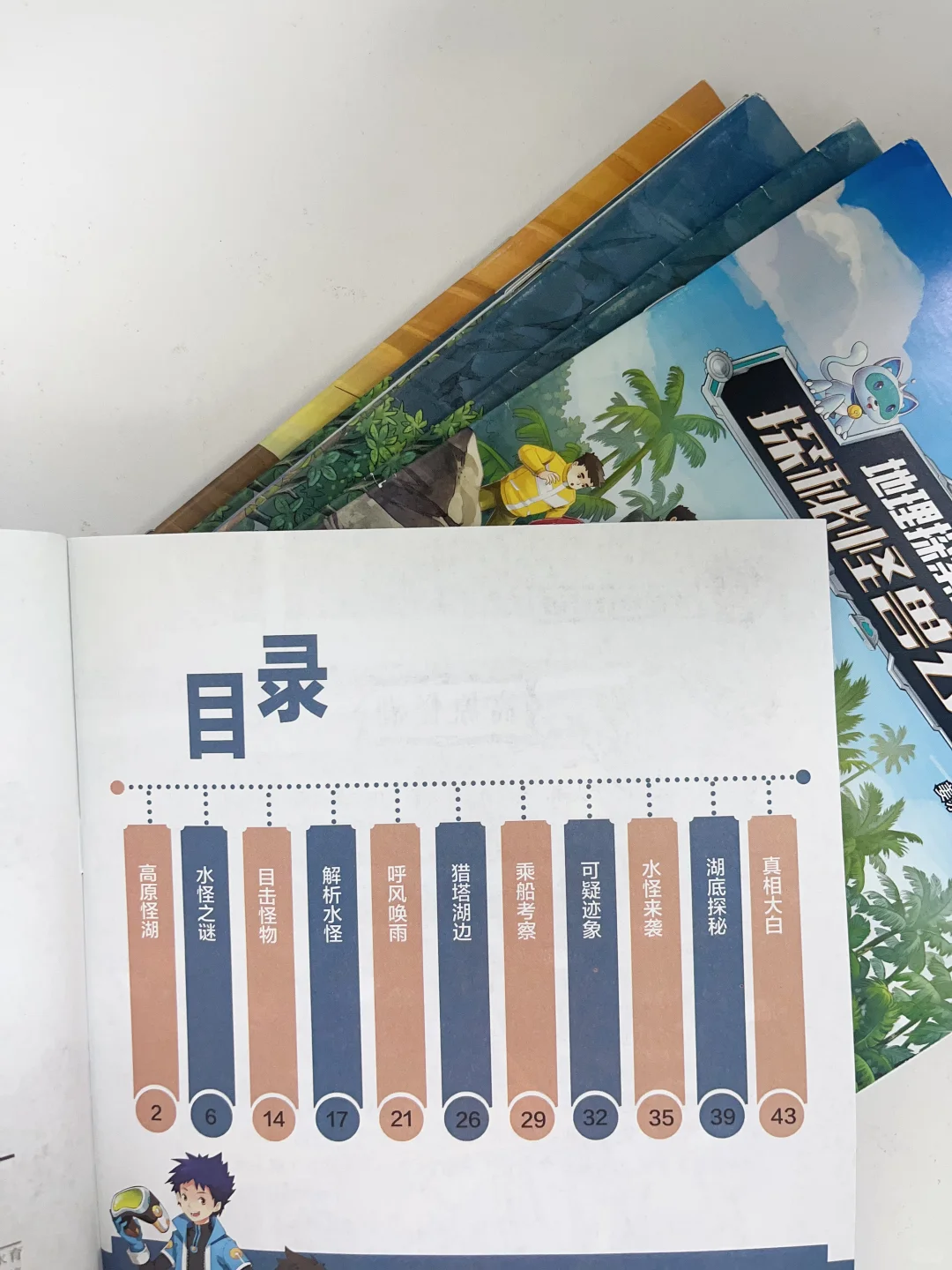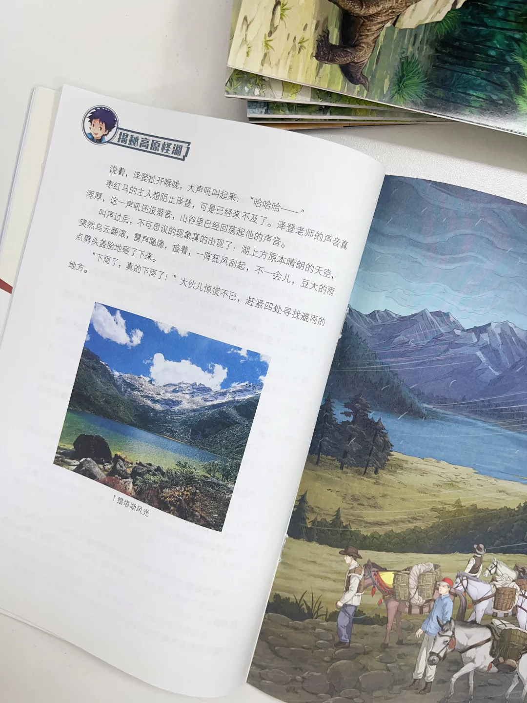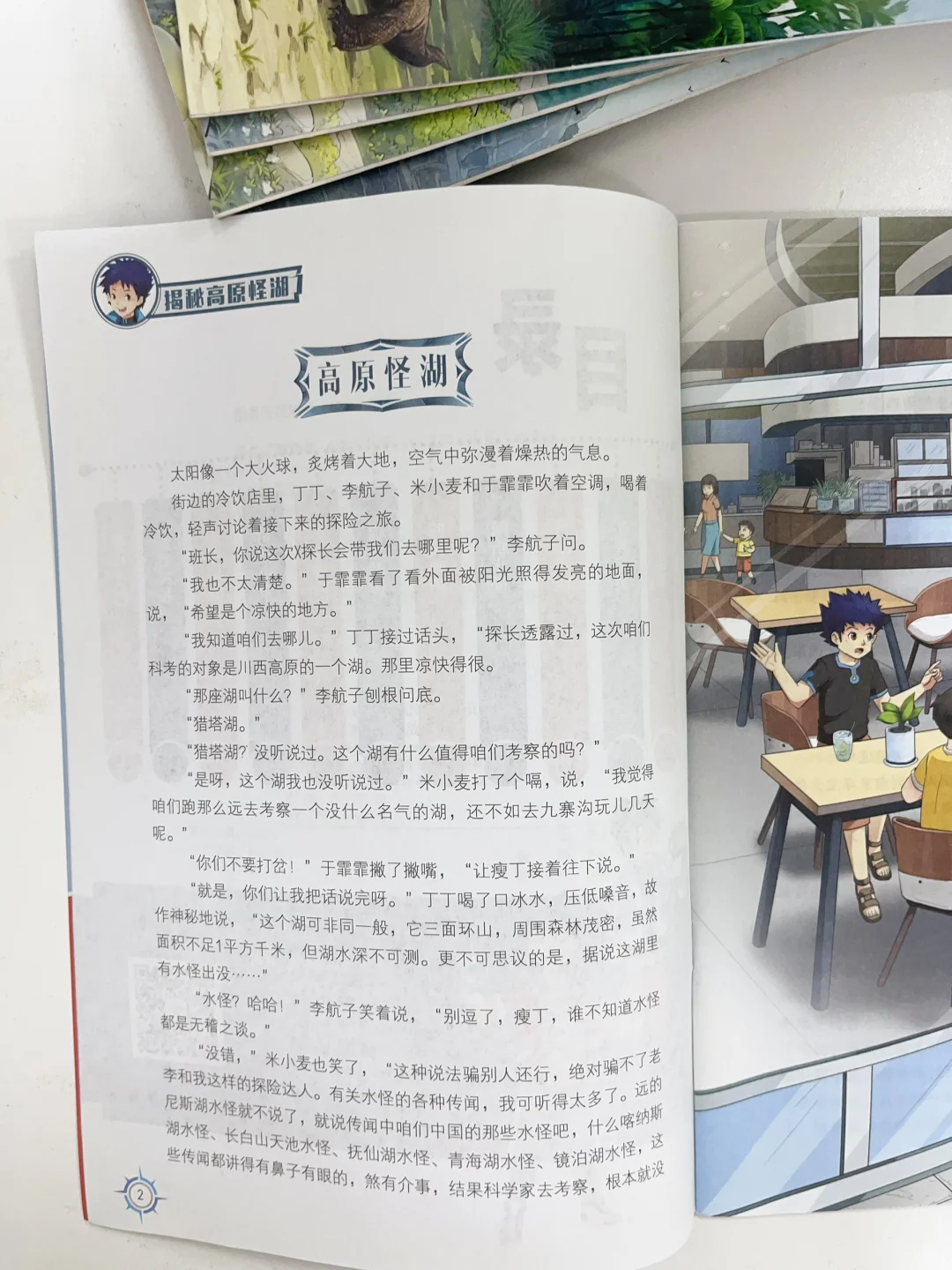 每册开启一段神秘探索之路,探访一个景区或地址,娃儿伴随着主人公的思绪一起去探索,用虚构文学形式来呈现奇妙探索之旅,一环接着一环,环环相扣,有种做福尔摩斯大侦探的既视感。比如,以揭秘高原怪湖(22年一册主题)为例,11段分别是:高原怪湖,水怪之谜,目击怪物,解析水怪,呼风唤雨,猎塔湖边,乘船考察,可疑迹象,水怪来袭,湖底探秘,真相大白。