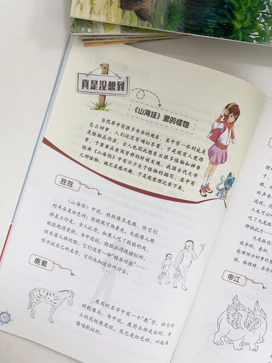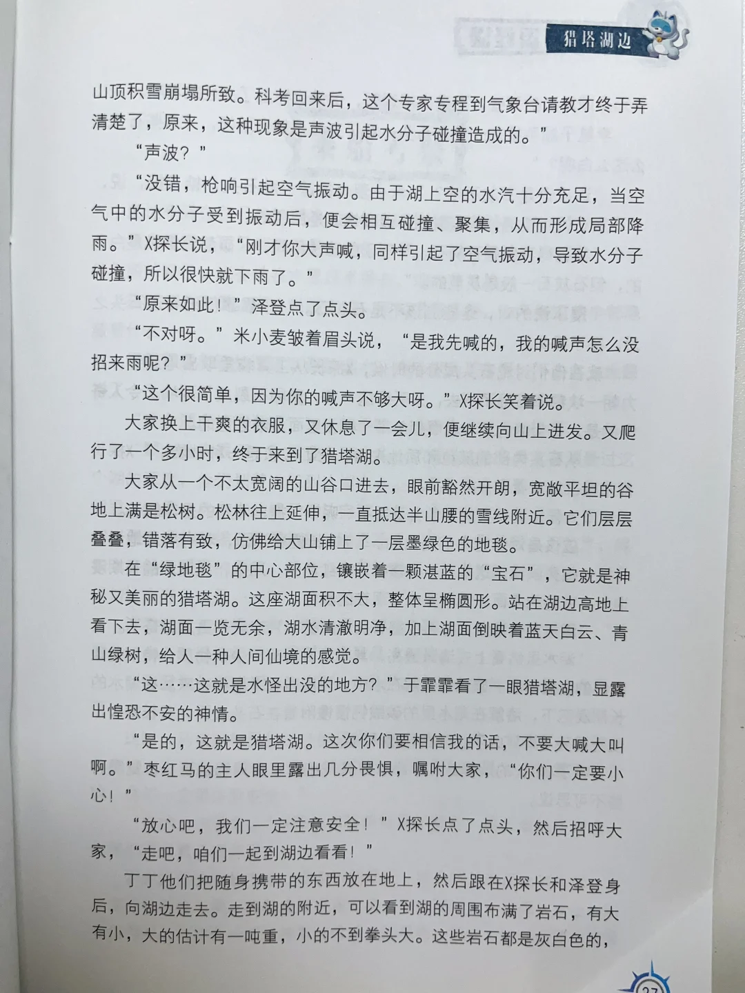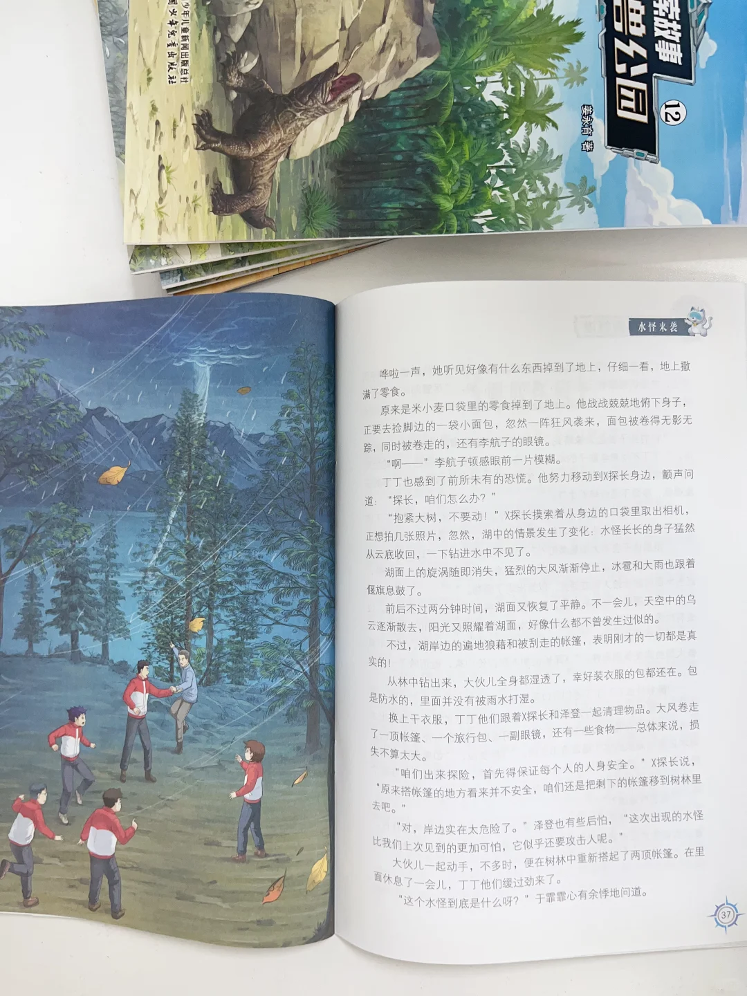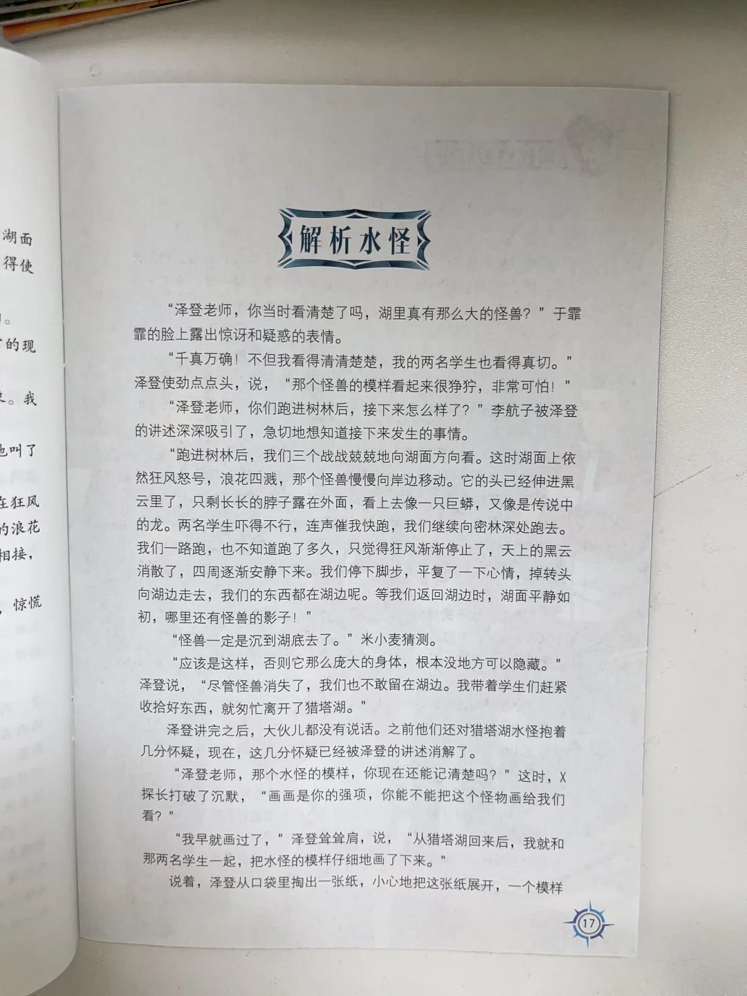 每册开启一段神秘探索之路,探访一个景区或地址,娃儿伴随着主人公的思绪一起去探索,用虚构文学形式来呈现奇妙探索之旅,一环接着一环,环环相扣,有种做福尔摩斯大侦探的既视感。比如,以揭秘高原怪湖(22年一册主题)为例,11段分别是:高原怪湖,水怪之谜,目击怪物,解析水怪,呼风唤雨,猎塔湖边,乘船考察,可疑迹象,水怪来袭,湖底探秘,真相大白。