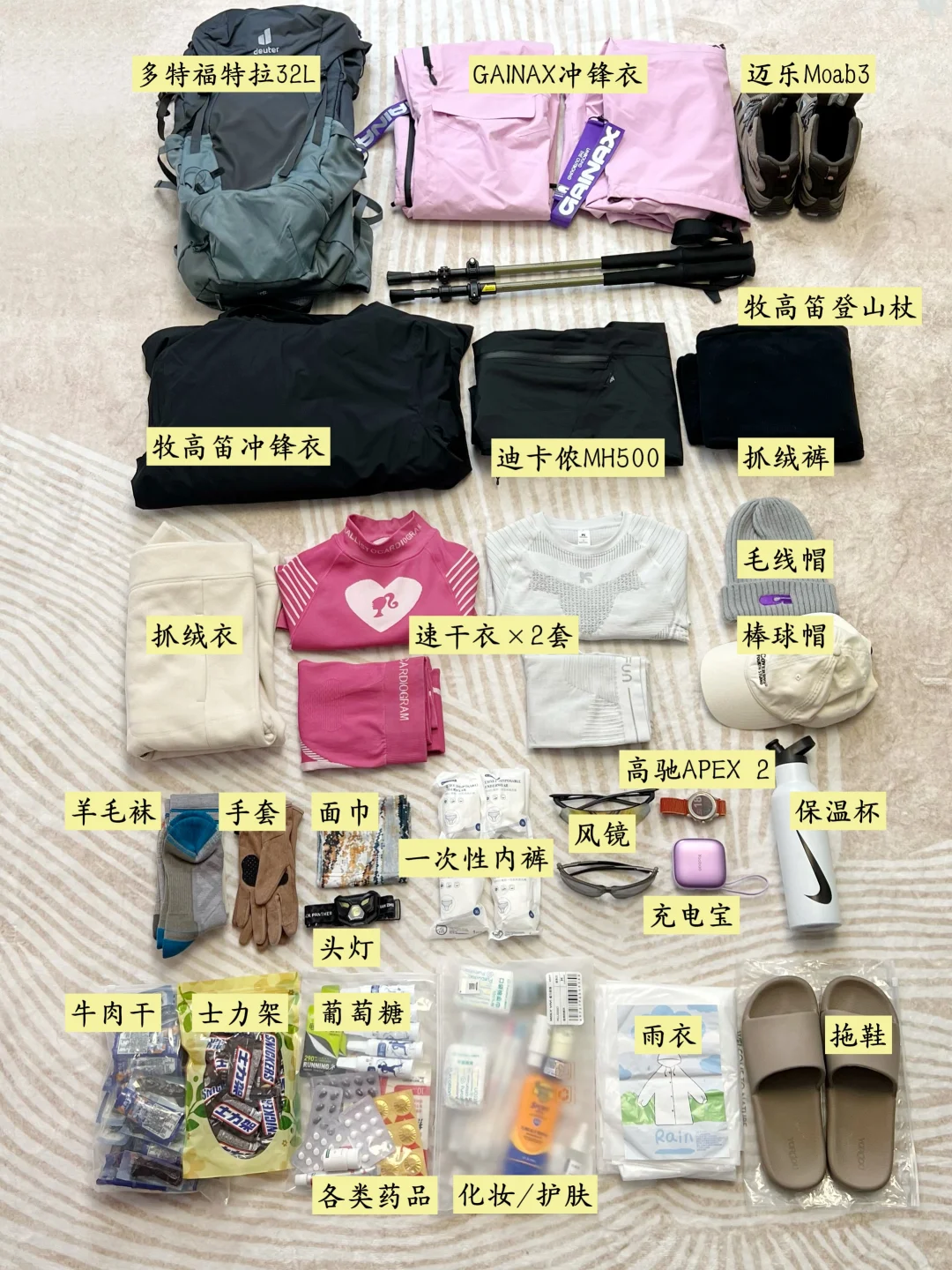 2⃣️冲锋衣:1件就行,2件背着有点累(粉色:GAINAX(其实是滑雪服);黑色:牧高笛(带羽绒内胆))