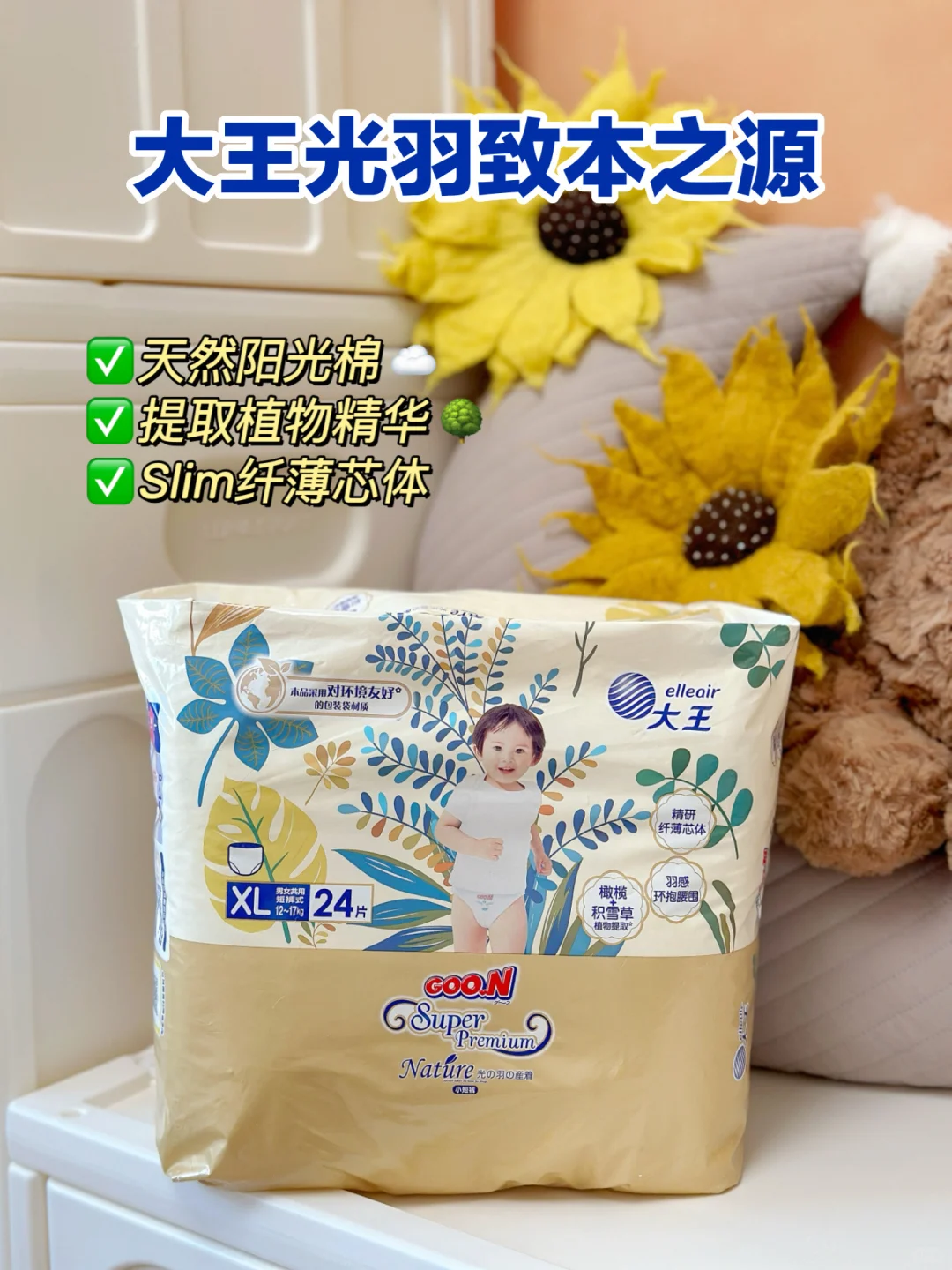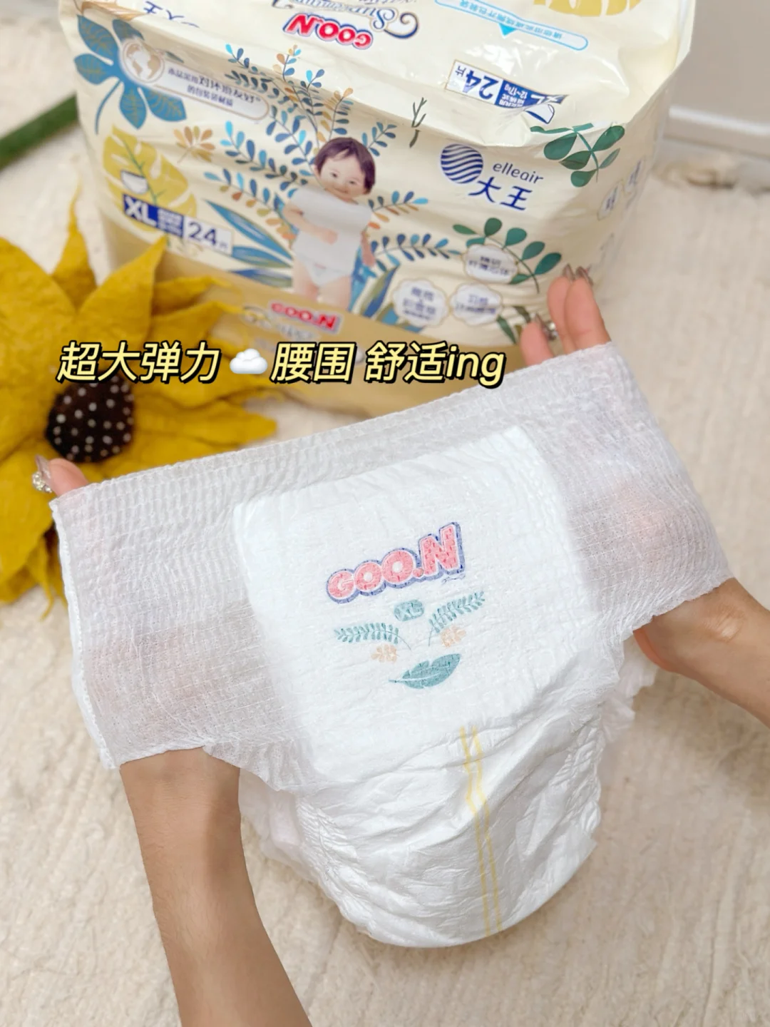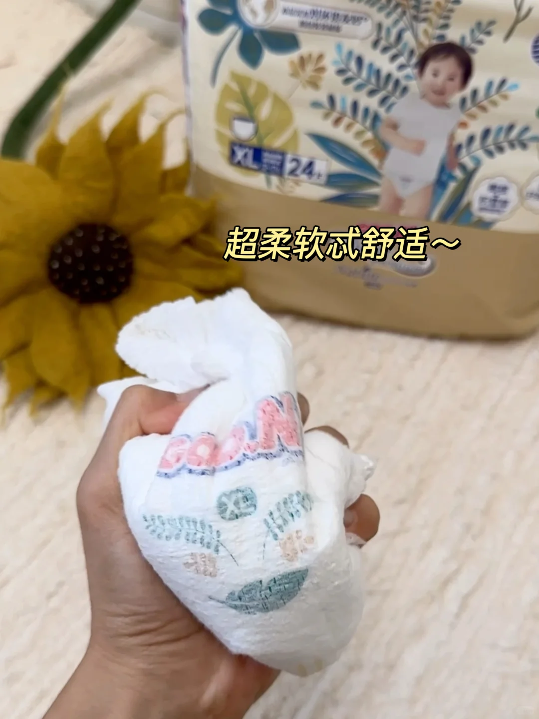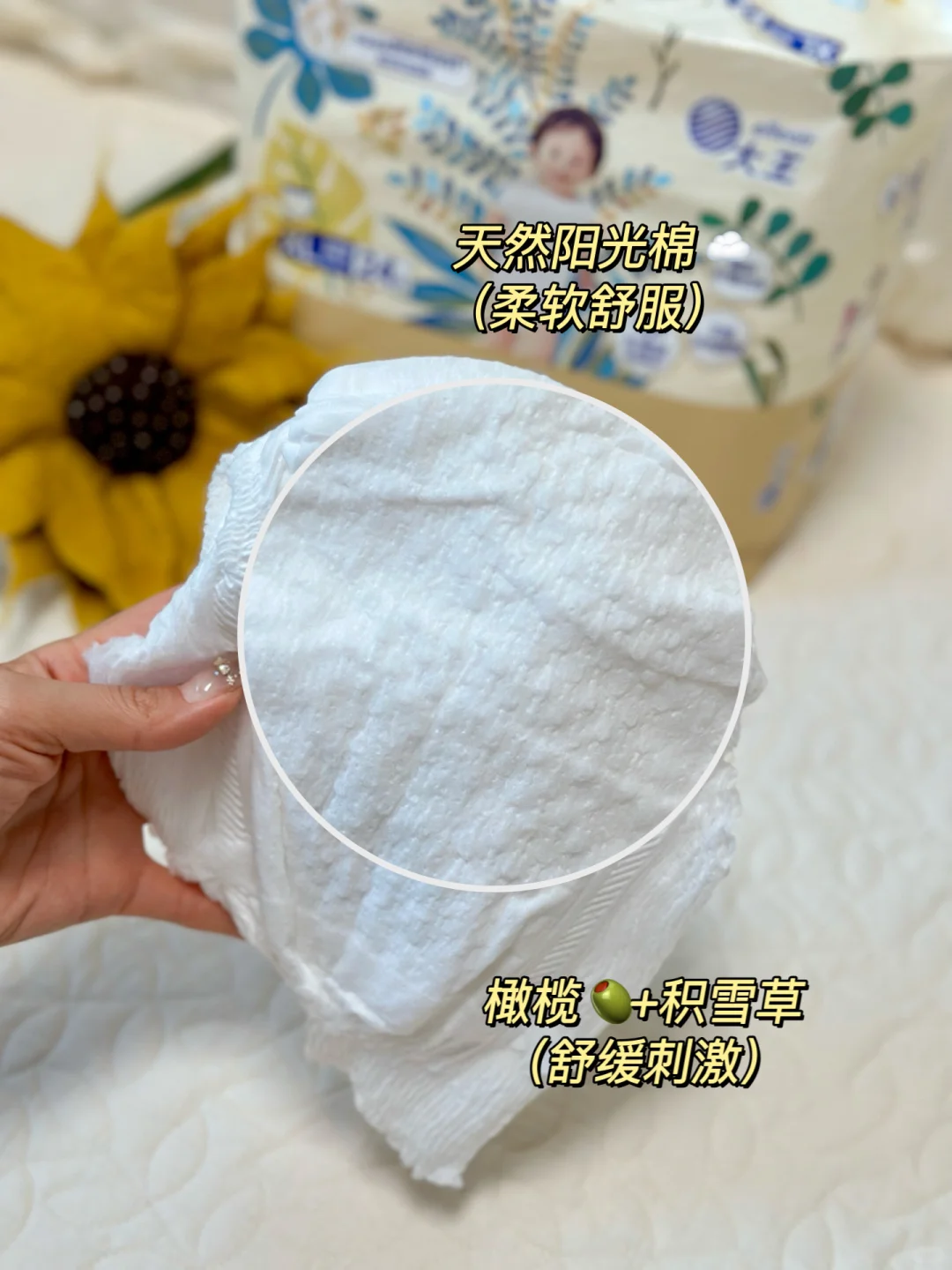 我们家现在用的是这款大王光羽致本之源,它的手感真的很柔软舒服,外表层是天然蓬松好棉,☁️摸上去的触感柔柔软软,就像云朵一样,☁️而且这里面还有橄榄和积雪草植物提取成分,就像给pp敷了一层面膜一样非常舒爽,👏基本不会给pp和尿便接触的机会,我家宝宝用久了也没有出现红屁屁
