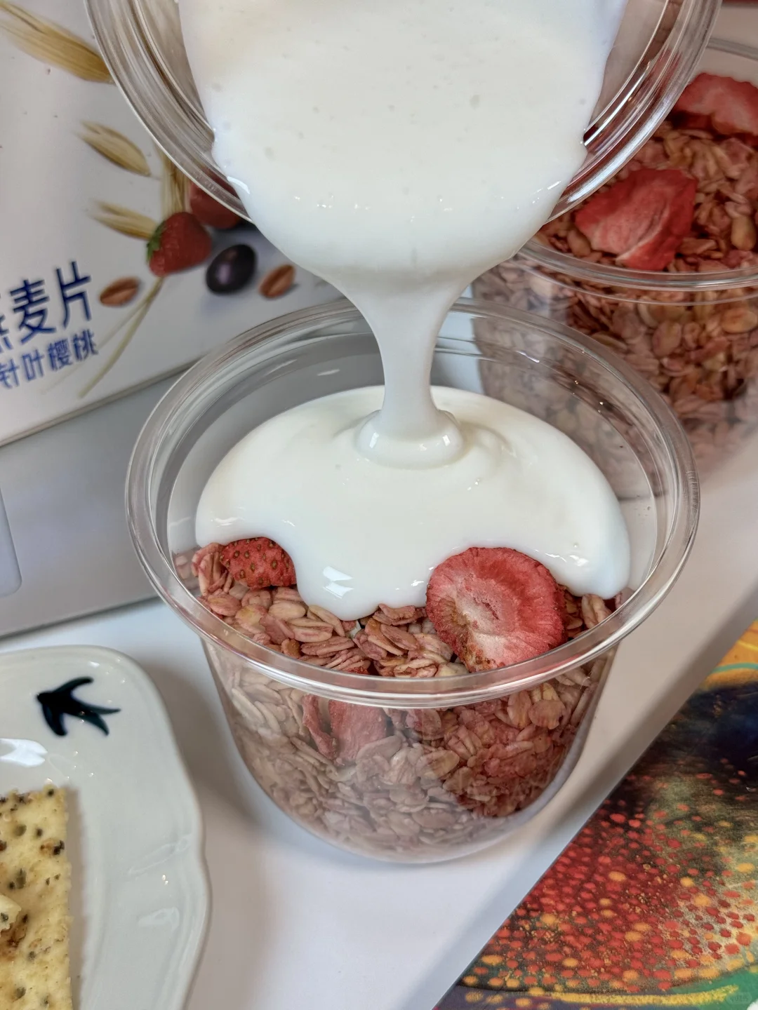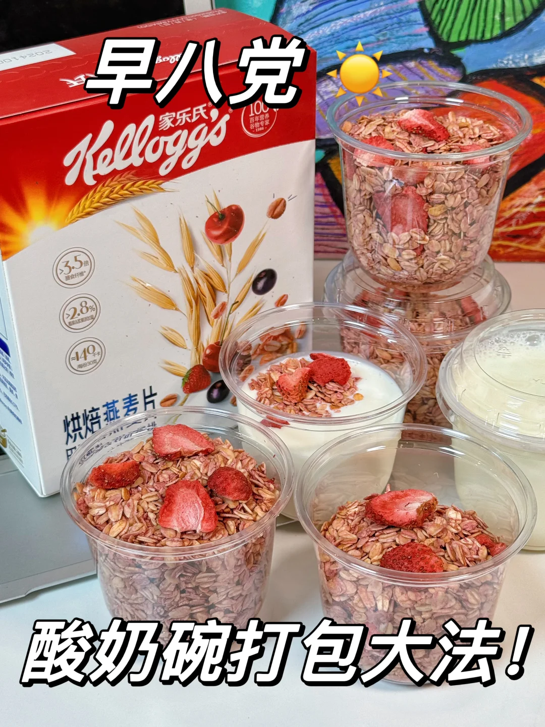 我会提前准备酸奶杯用来做分装盒,每盒按照自己的份量提前分装好保存,另外再准备酸奶或者牛奶🥛,吃的时候直接加进去拌着吃就可以了,味道超绝超好吃![赞R]