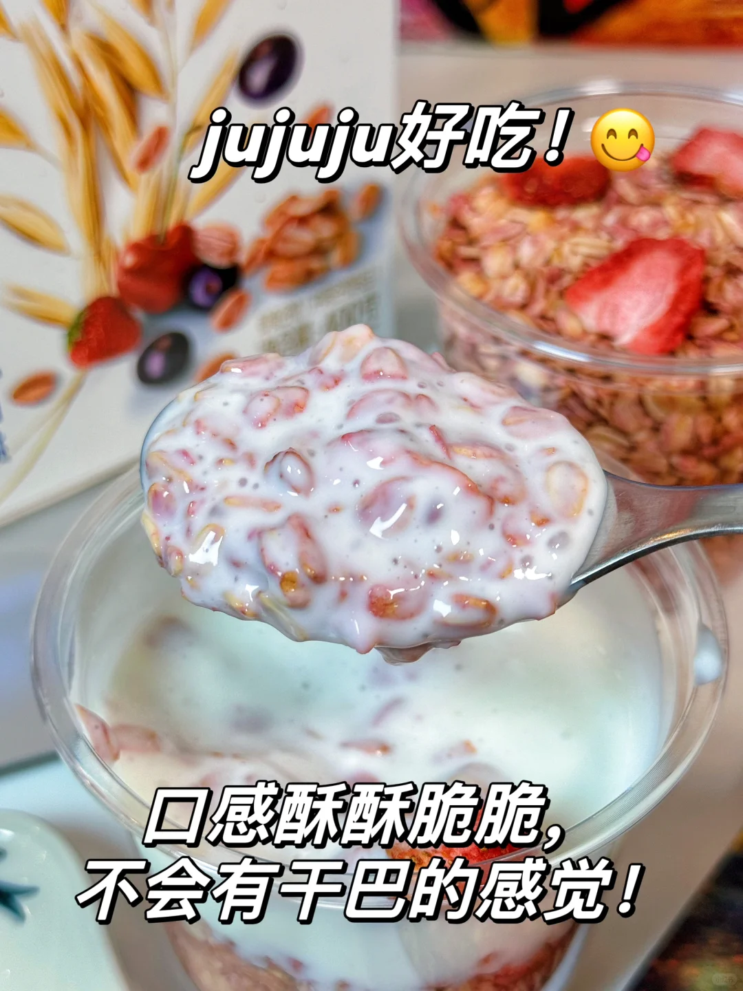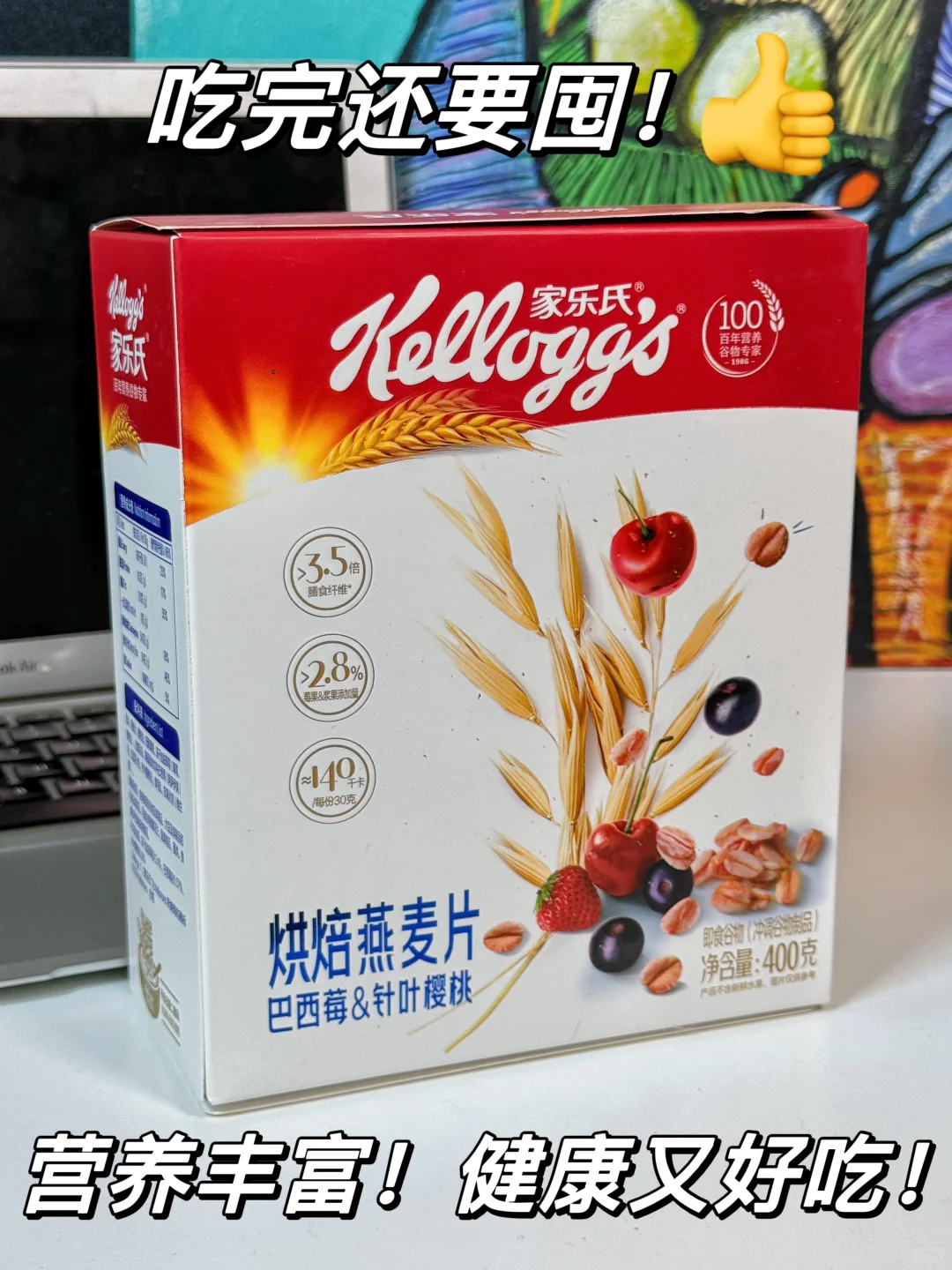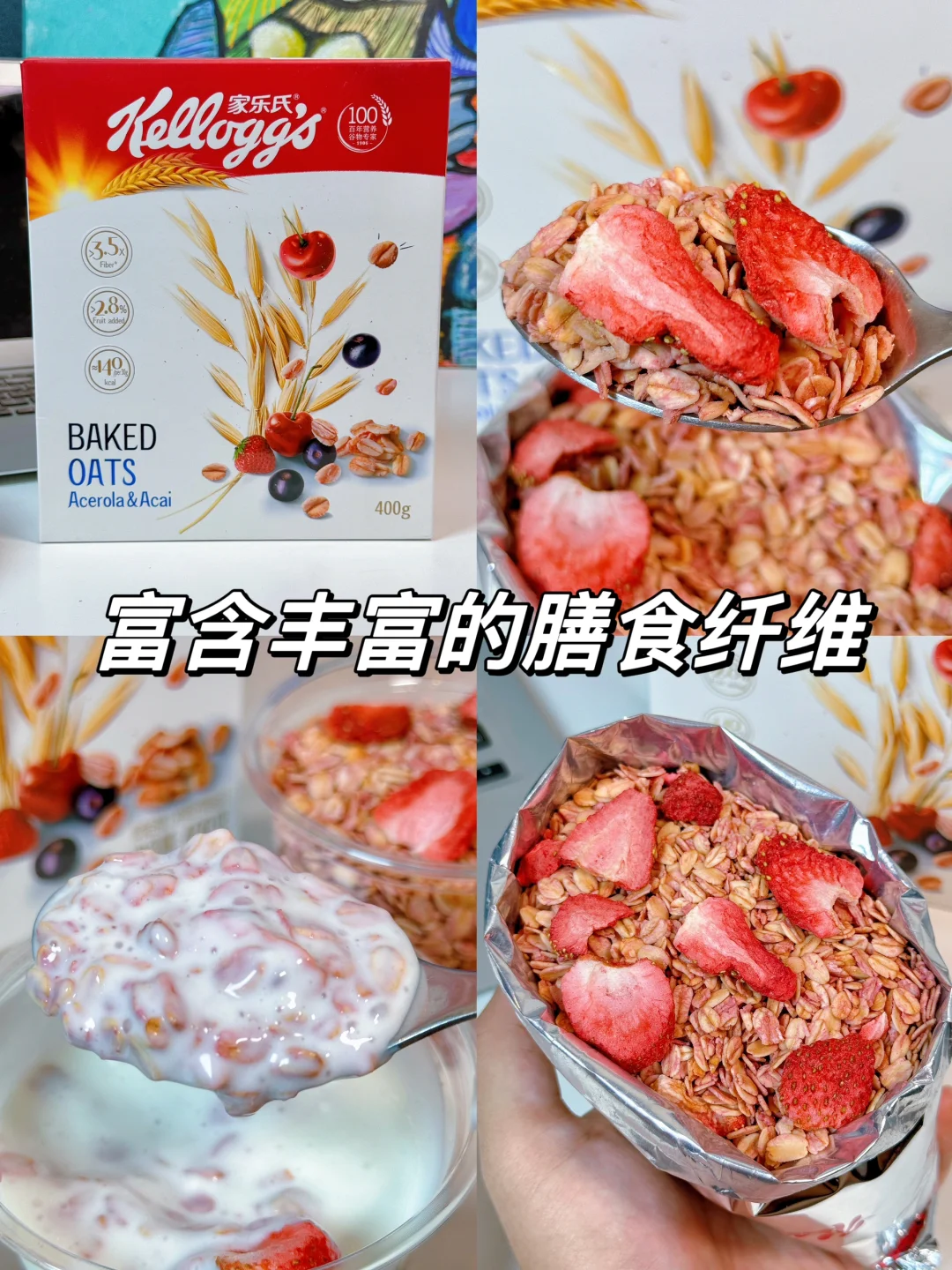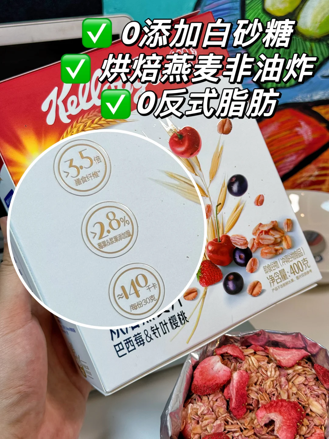 这款家乐氏超级莓是烘焙燕麦片,口感酥酥脆脆的,而且不会有干巴的感觉,除了麦片还有莓果和浆果,还添加了巴西莓粉(含花青素)和针叶樱桃粉(含维C),融合后酸酸甜甜,真的是好吃营养又健康!每天享用,好气色轻松唤醒!