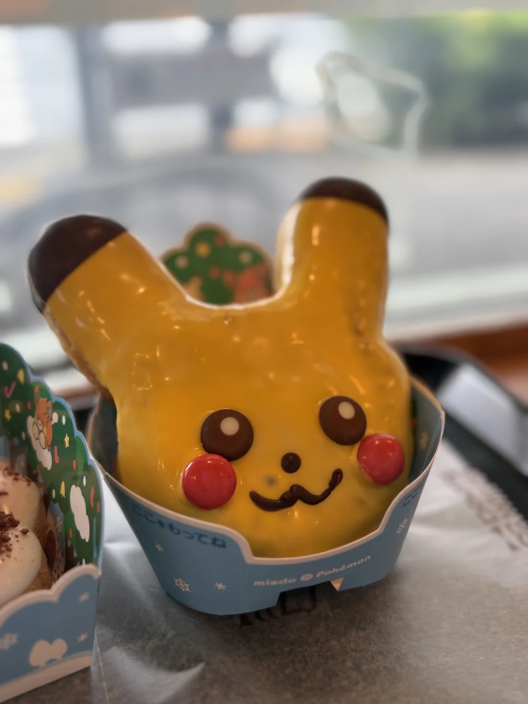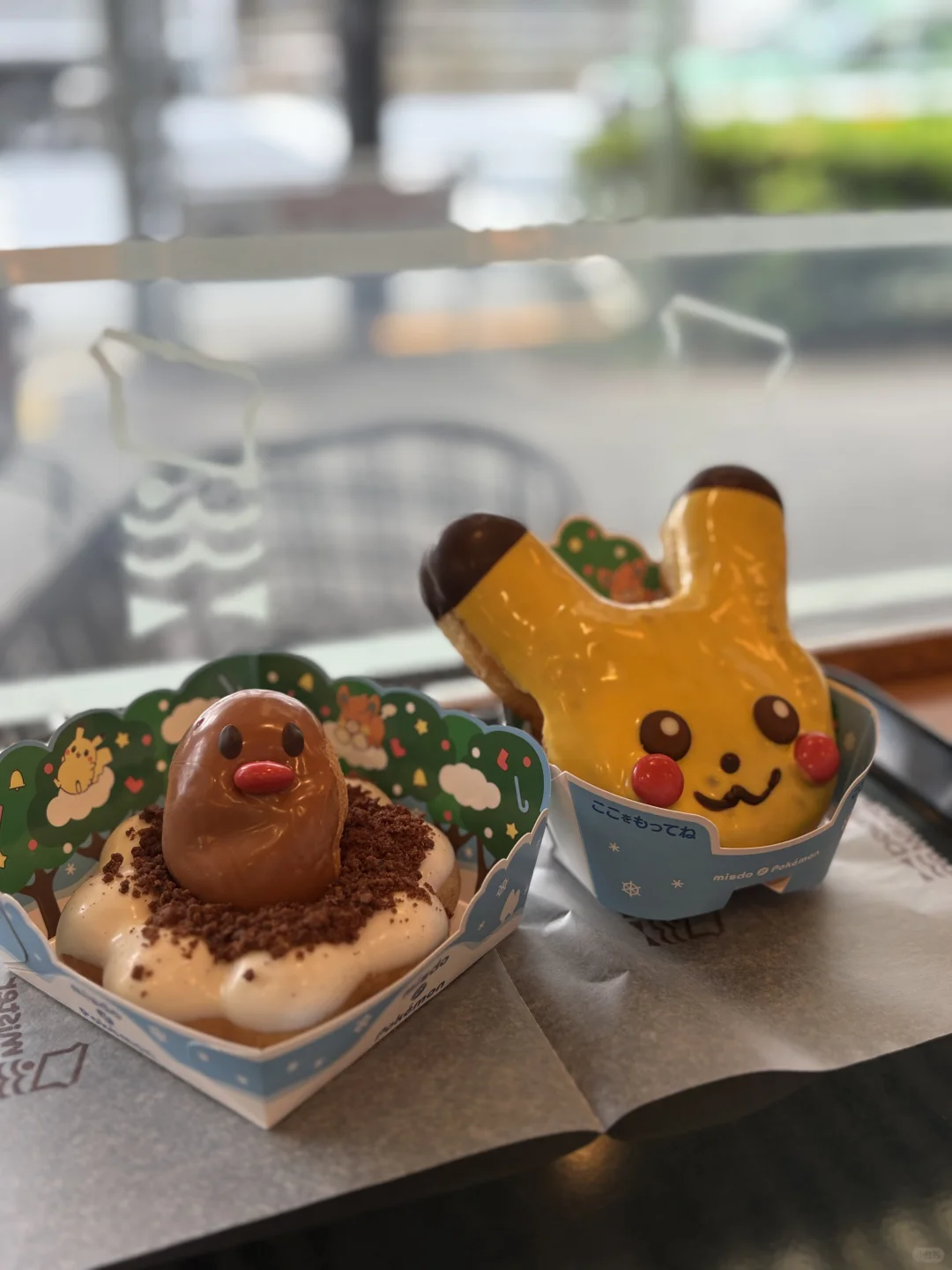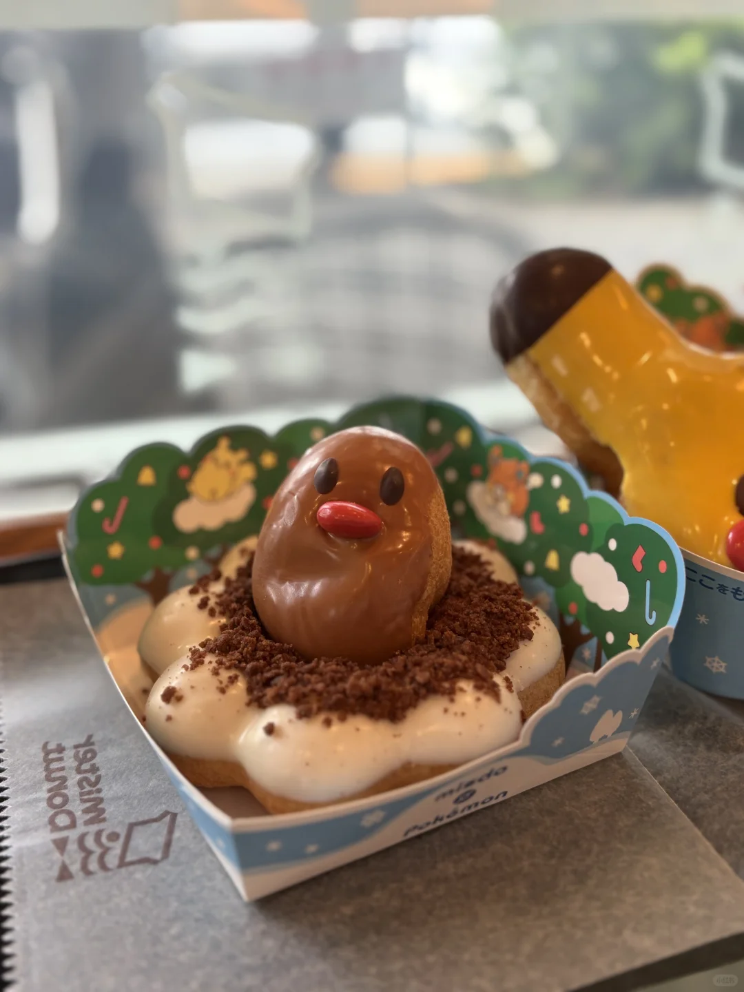 回国前终于吃上了今年的宝可梦合作款[派对R] 11月6日-12月下旬都会有,大家如果路过日本各地mister donut的话可以进去碰碰运气。 地鼠的造型实在太适合甜甜圈了,本体是糯唧唧的巧克力芬迪,奶油用量足,味道不错,15块一个童叟无欺[害羞R]