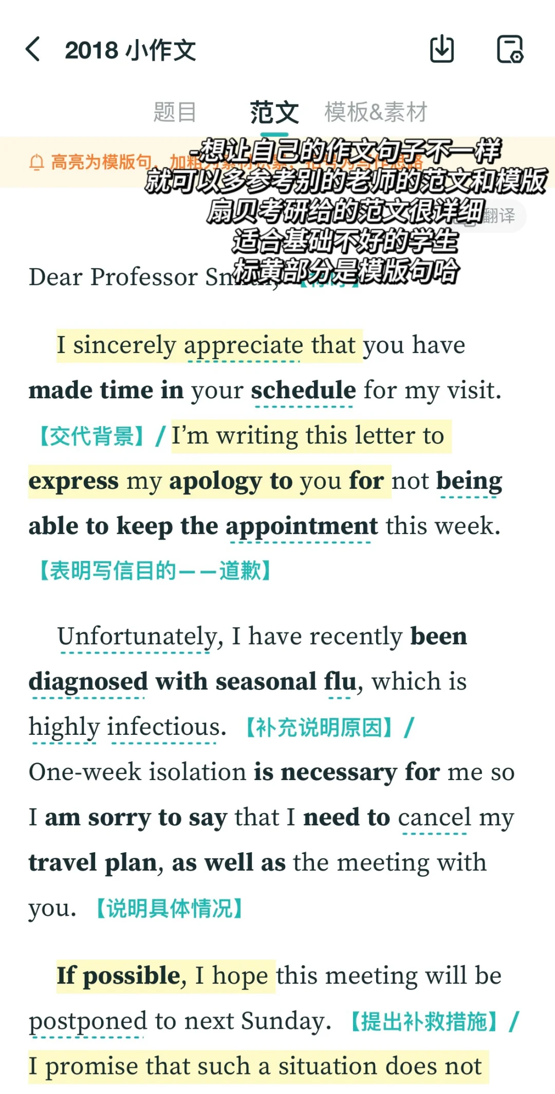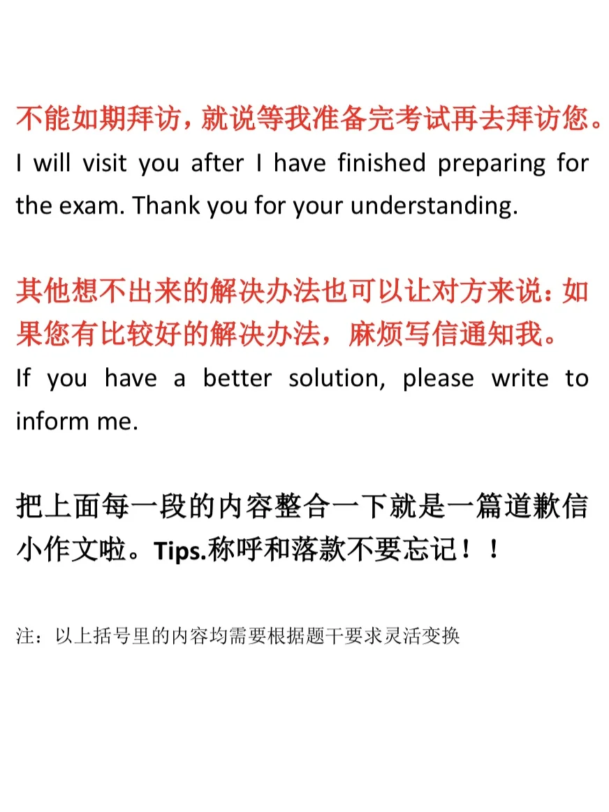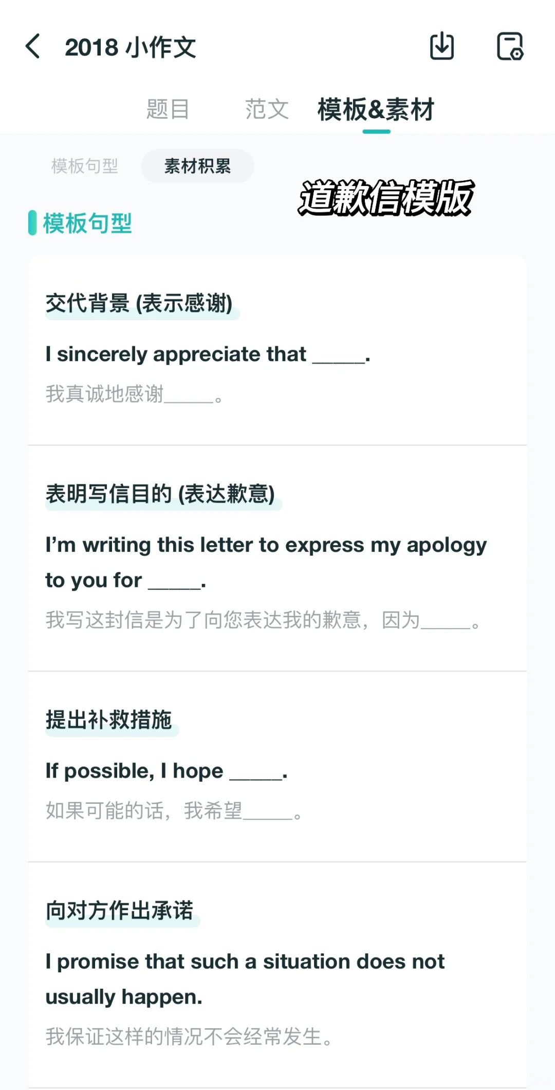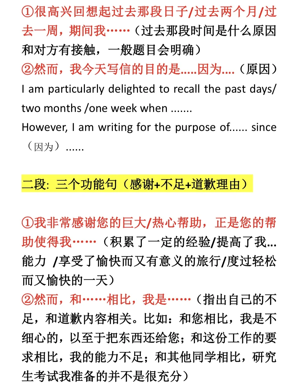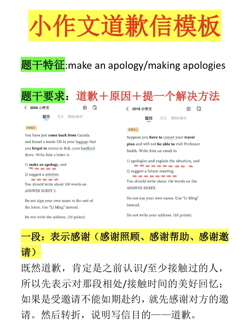 学姐根据石雷鹏老师的功能句整理了小作文的模板,小作文分道歉信、建议信、通知类信、感谢信、邀请信……好几种类型。核心内容主要是开头结尾不太一样,中间内容都是咱们常用的功能句。看起来很多,但是不用担心!后续我整理好了都会逐一分享,大家直接保存图片拿去背就可以啦。