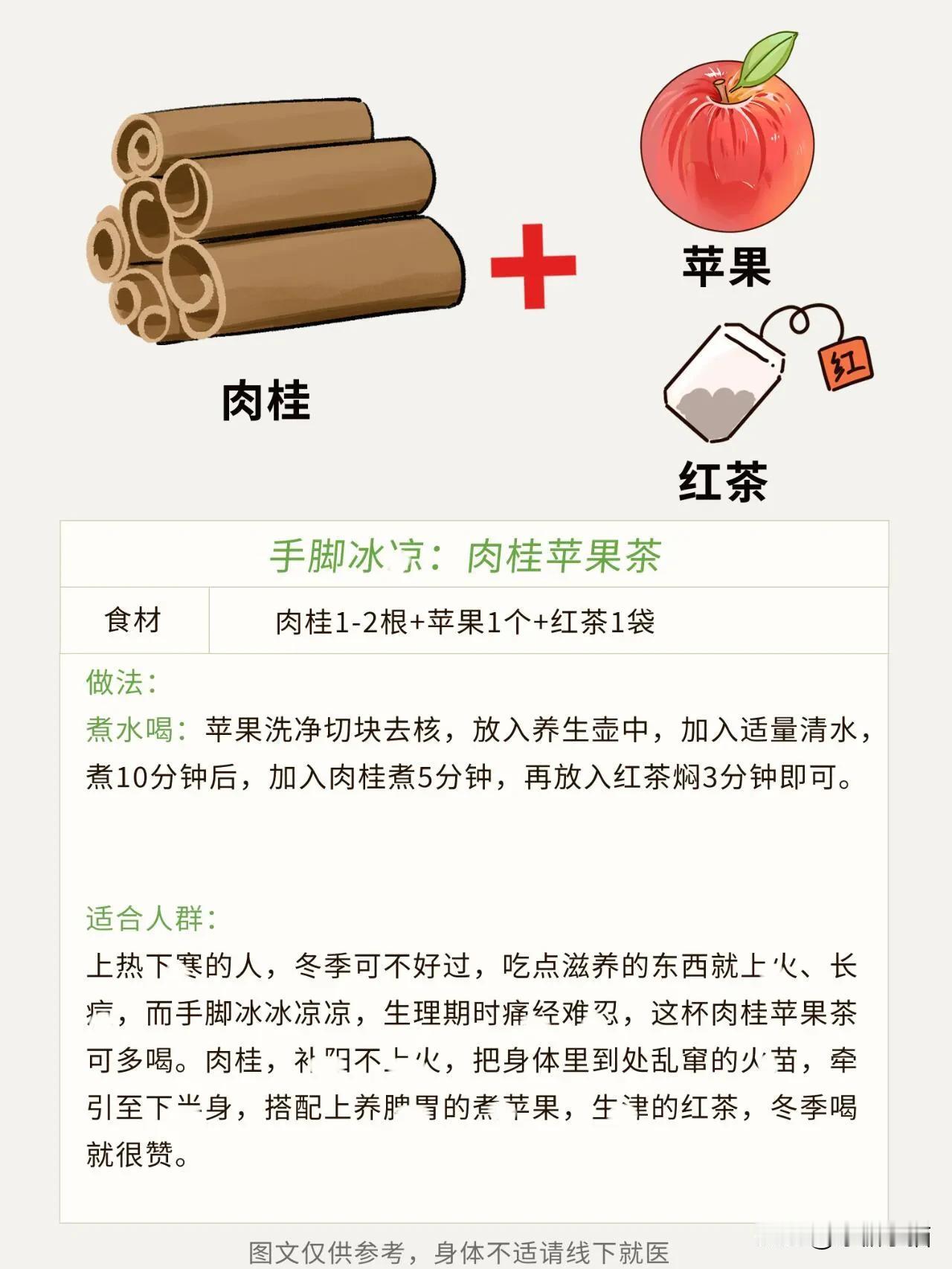 冬季养生|善用肉桂,上热下寒姐妹的心头好 冬季滋养,用肉桂 它气味纯☀️,很适合上热🔥下寒的姐妹 👇 【上热】:吃点滋养的东西就上、喉咙干 【下寒】:手脚冰凉、怕冷 . 而肉桂,把上焦的🔥气引导到身体✅需要的地方,引🔥归元。 在寒冷的冬天,🍵喝上一杯肉桂茶,暖暖的很舒服 ‼️肉桂虽好,但性大热,一周喝2次即可哦~ 元气满满气血茶 必备的养生茶 元气红参暖暖茶 驱散体寒温润茶 陈皮红枣白茶饮 桂圆六宝茶 四宝茶元气满满 肉桂茶推荐 人参元气茶