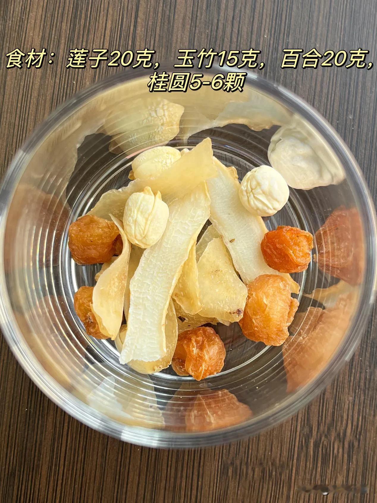 连喝3天,这个舒肝清心茶方太厉害了... 有没有翻来覆去睡不着、一睡着梦就特别多经常半夜醒了睡不着的? 2个原因: 心火旺/干气不舒 1.心火旺熬夜多,脾气大的容易gan气太旺gan 气太旺会加重心火这样的人特别容易心烦、容易上火想的太多了,入睡特别困难费心的也多,可以看看舌头舌尖特别红~ 2.干气不舒干气不舒,气郁化火这样的人特别容易生气姨妈来了特别心烦气躁、口苦眼干梦特别多,经常2-3点醒干气太旺会让干火旺的人火上浇油更容易mian 一个玉竹莲子清心汤分享给宝子们 食材:莲子20克,玉竹15克,百合20克,桂圆5-6颗 做法:全部洗干净加入1500ML水煮15分钟即可我煮来拿去办公室当日常茶饮也可以煲汤 十排骨/ 猪骨/瘦肉... 听说喝了补气血 脾气虚怎么补 睡不着、气血差 暖胃,补气血 好气色从胃开始 补气很重要 补气补精神 各种补气血 心烦口苦