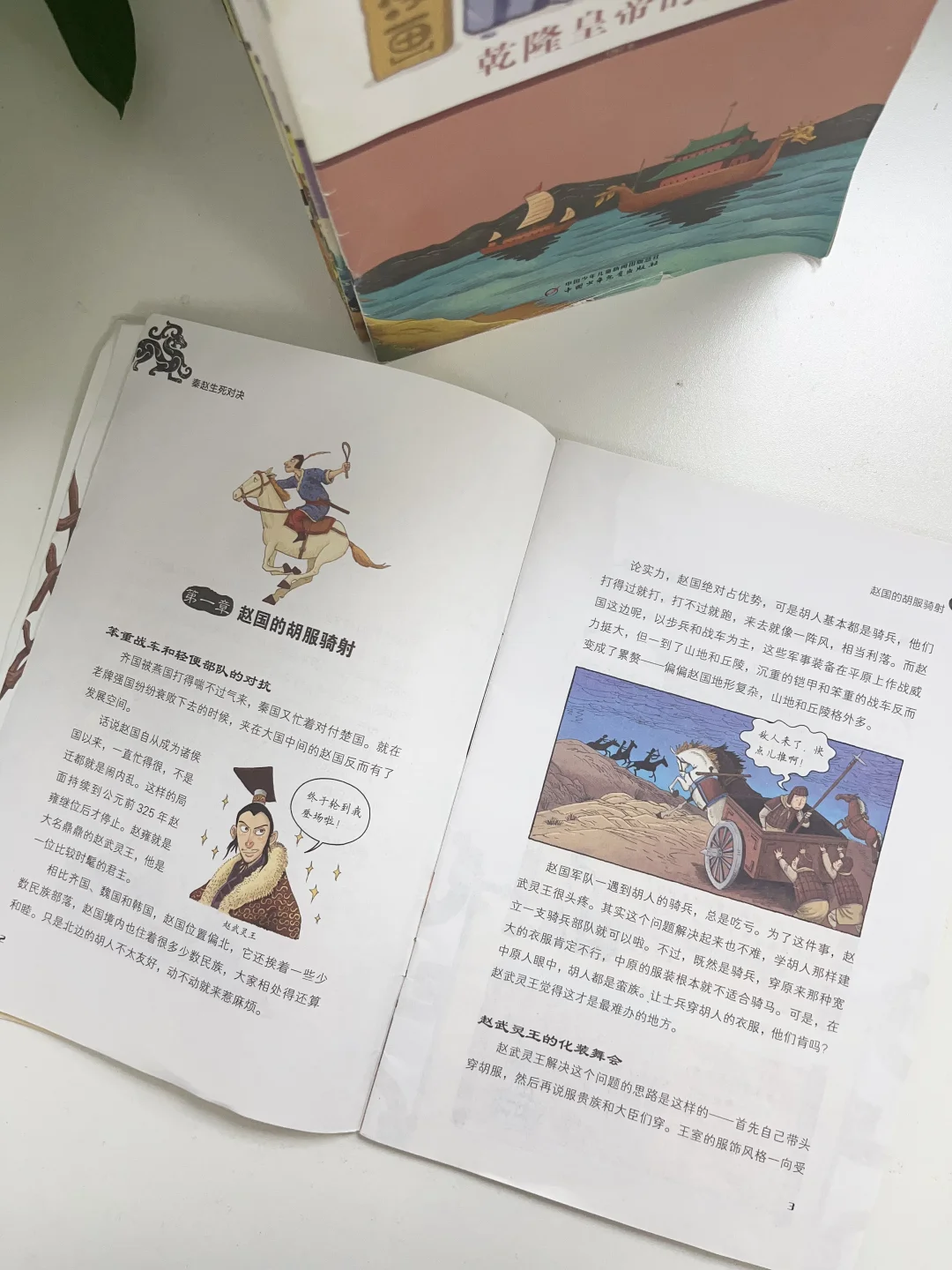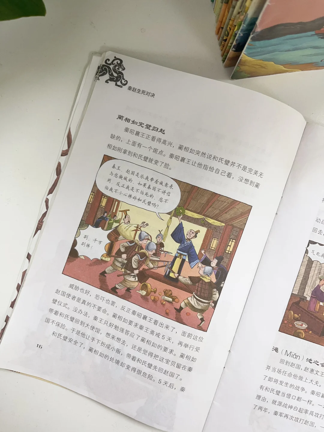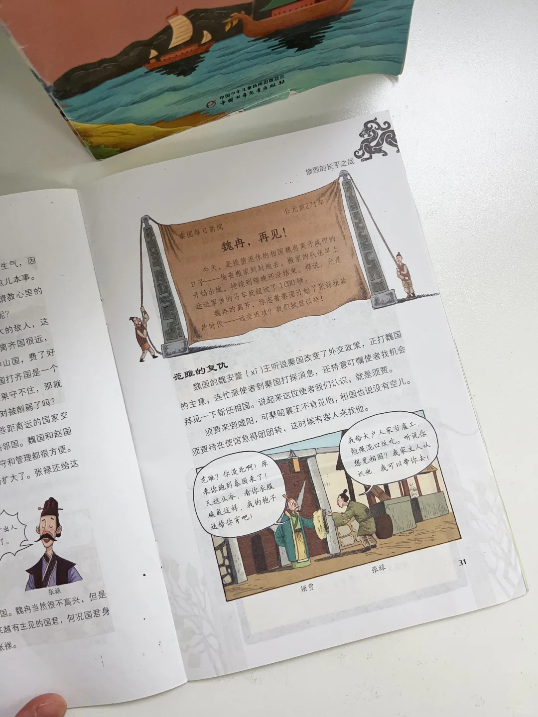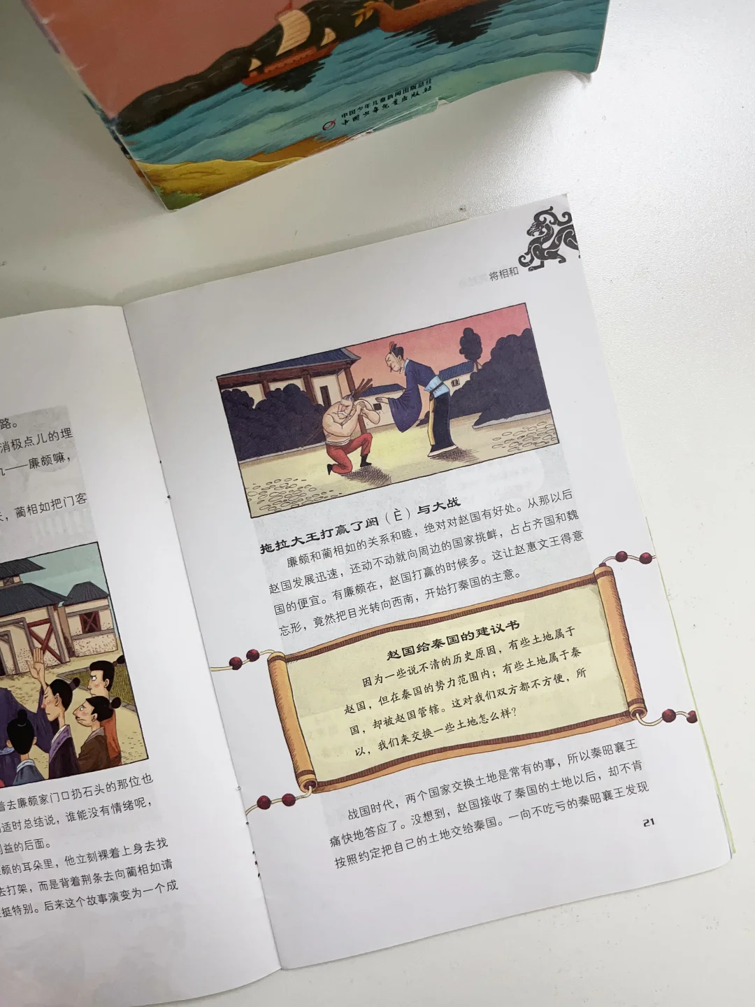 这套历史书深得语文老师的青睐和喜欢,不仅仅是文史不分家那么简单,而是语文课本上的成语古典,小古文等都被水灵灵搬上这套历史书中了。比如漫画历史故事第11册为例,这里讲到《将相和》蔺相如完璧归赵,赵括纸上谈兵等,牵涉到古代穿衣风格,古代乐器等以知识链接科普,一套书把语文课本上涉及到五千年历史文化部分搞定,不要太全面。