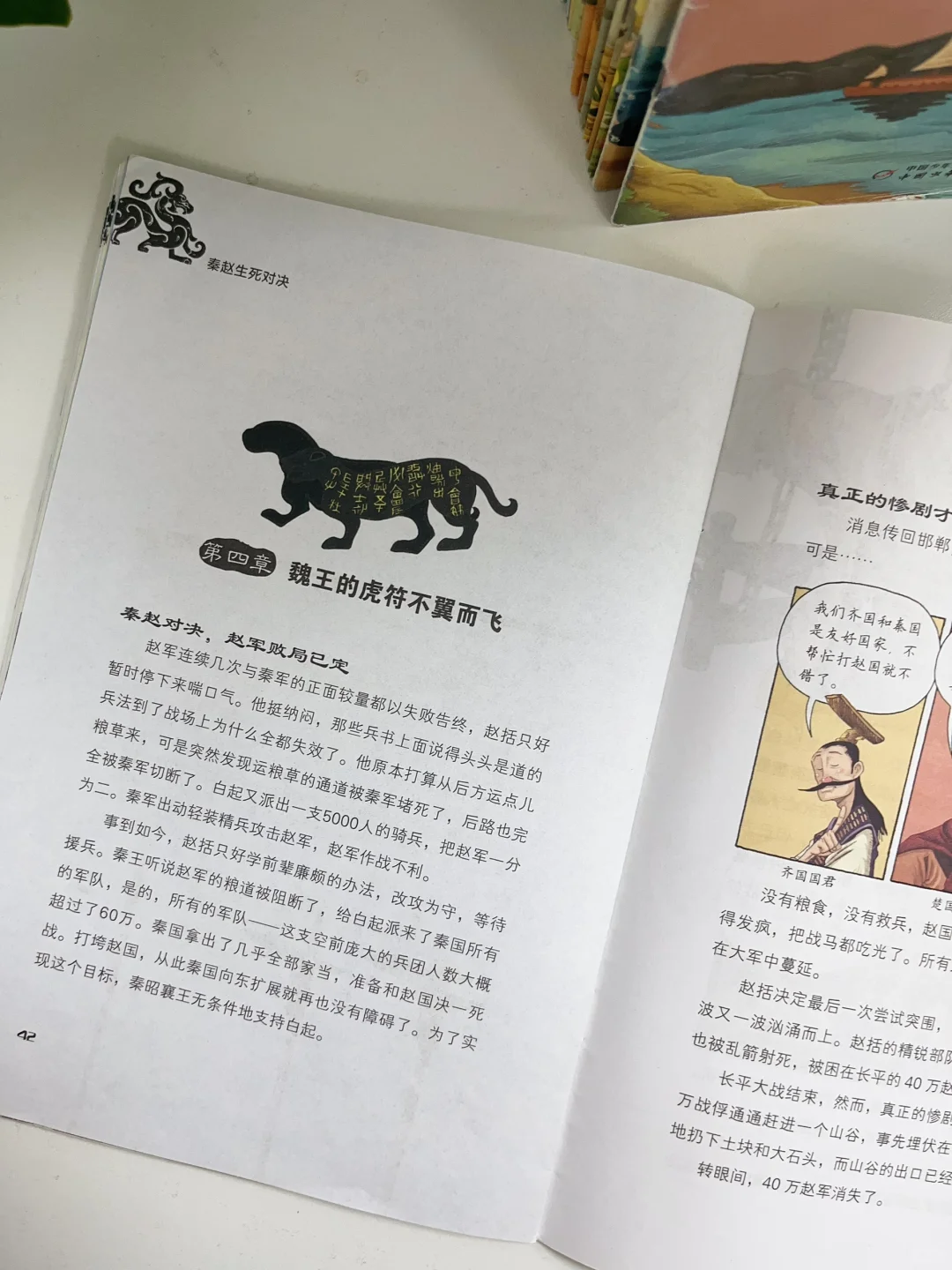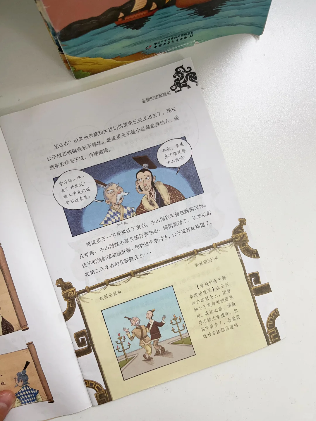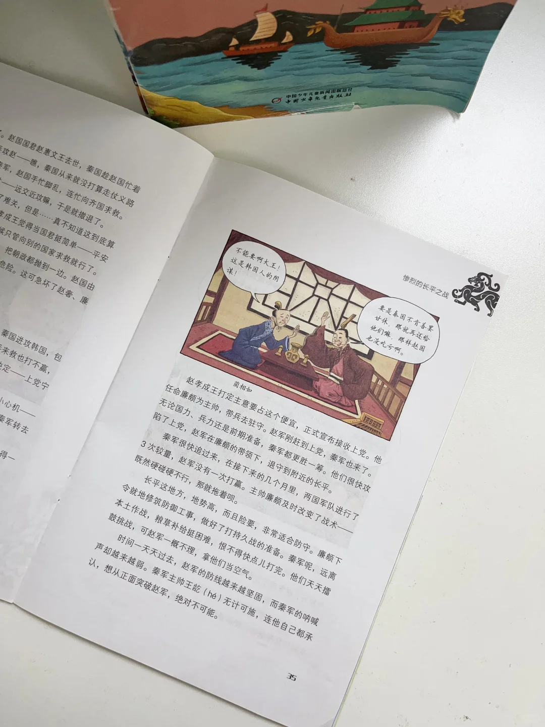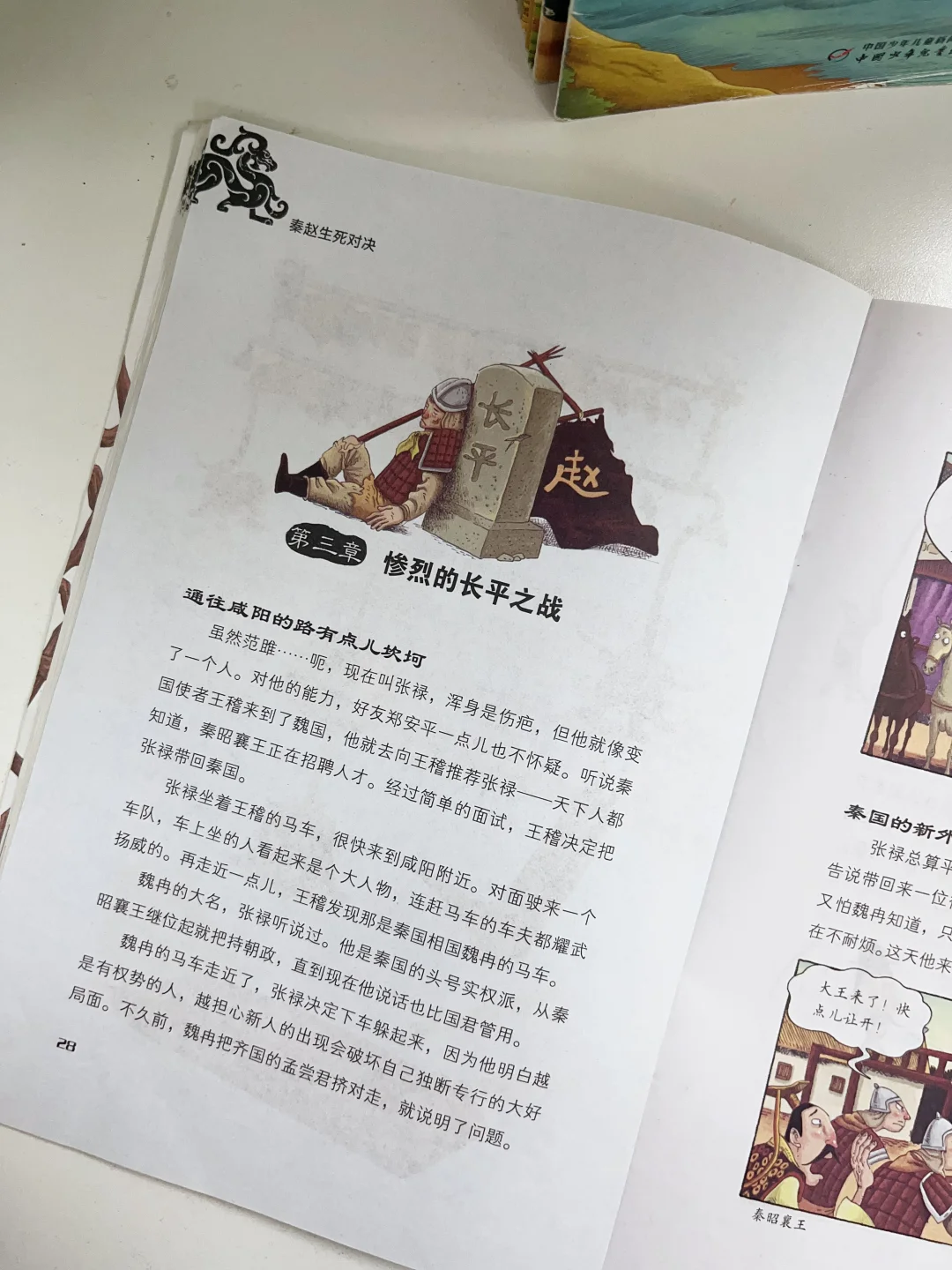 这套历史书深得语文老师的青睐和喜欢,不仅仅是文史不分家那么简单,而是语文课本上的成语古典,小古文等都被水灵灵搬上这套历史书中了。比如漫画历史故事第11册为例,这里讲到《将相和》蔺相如完璧归赵,赵括纸上谈兵等,牵涉到古代穿衣风格,古代乐器等以知识链接科普,一套书把语文课本上涉及到五千年历史文化部分搞定,不要太全面。