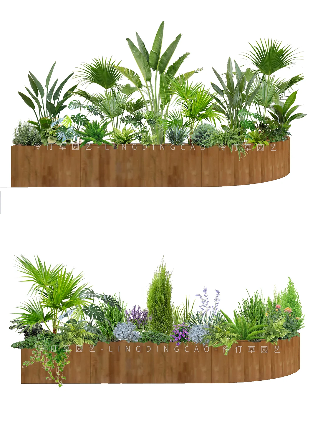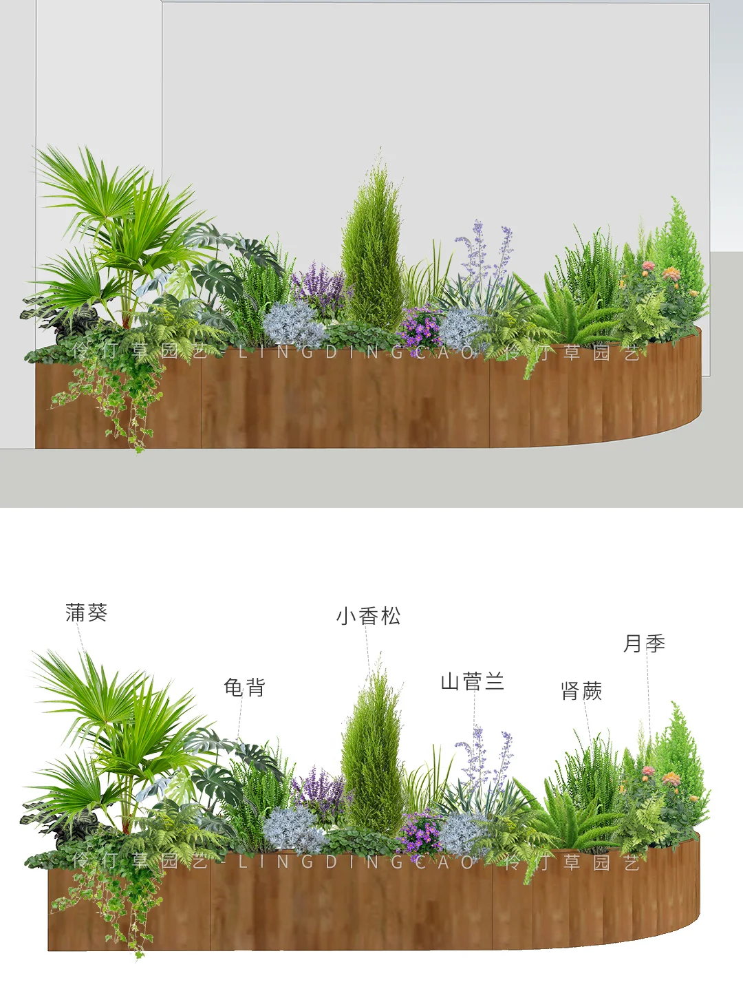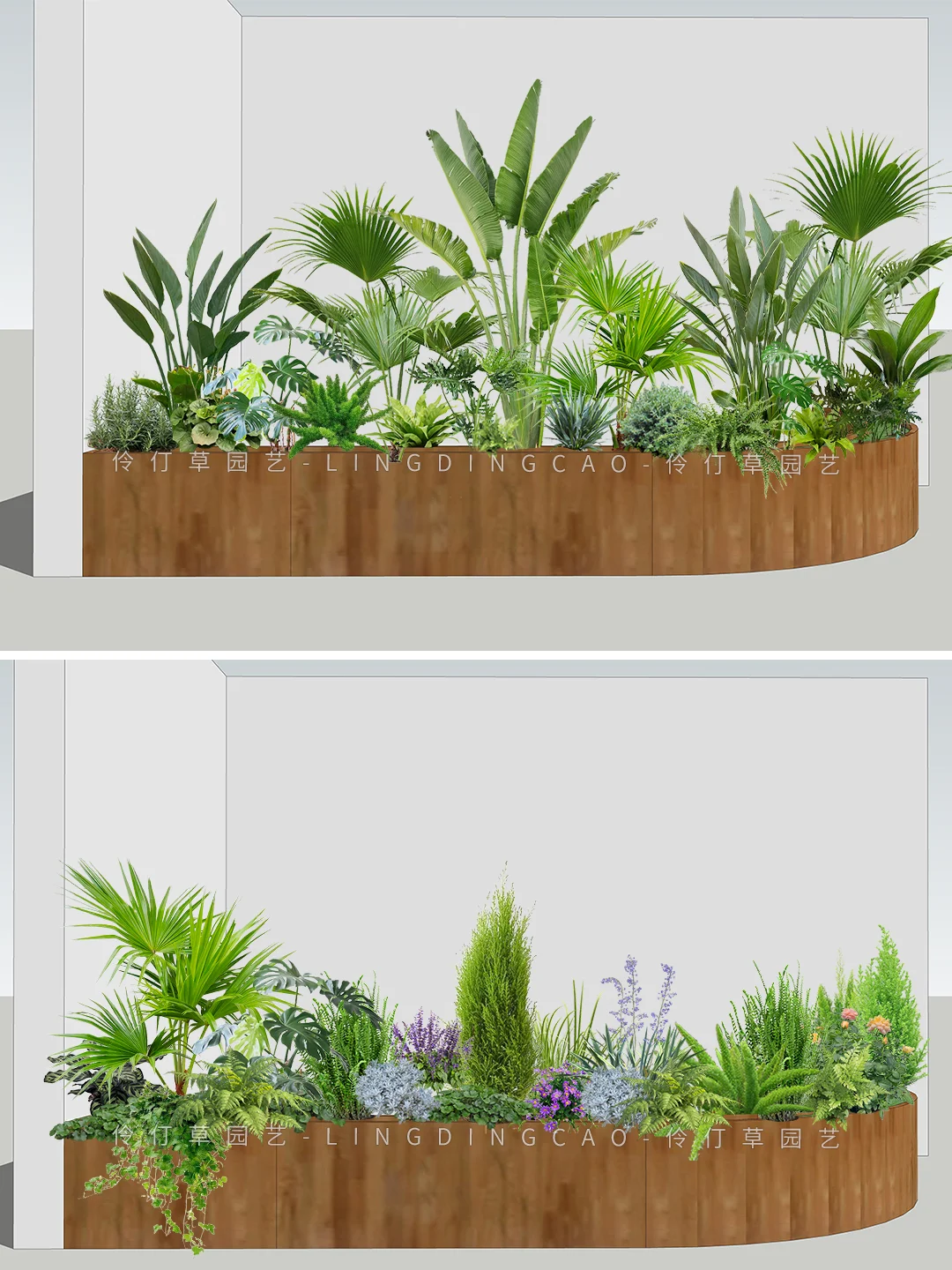 植物配置一:迷迭香、鹤望兰、蒲葵、旅人蕉、、一叶兰、鸟巢蕨、狐尾天门冬、龟背、乌托邦 植物配置二:蒲葵、龟背、小香松、山菅兰、肾蕨、月季、姬小菊、鼠尾草、金星蕨、常春藤
