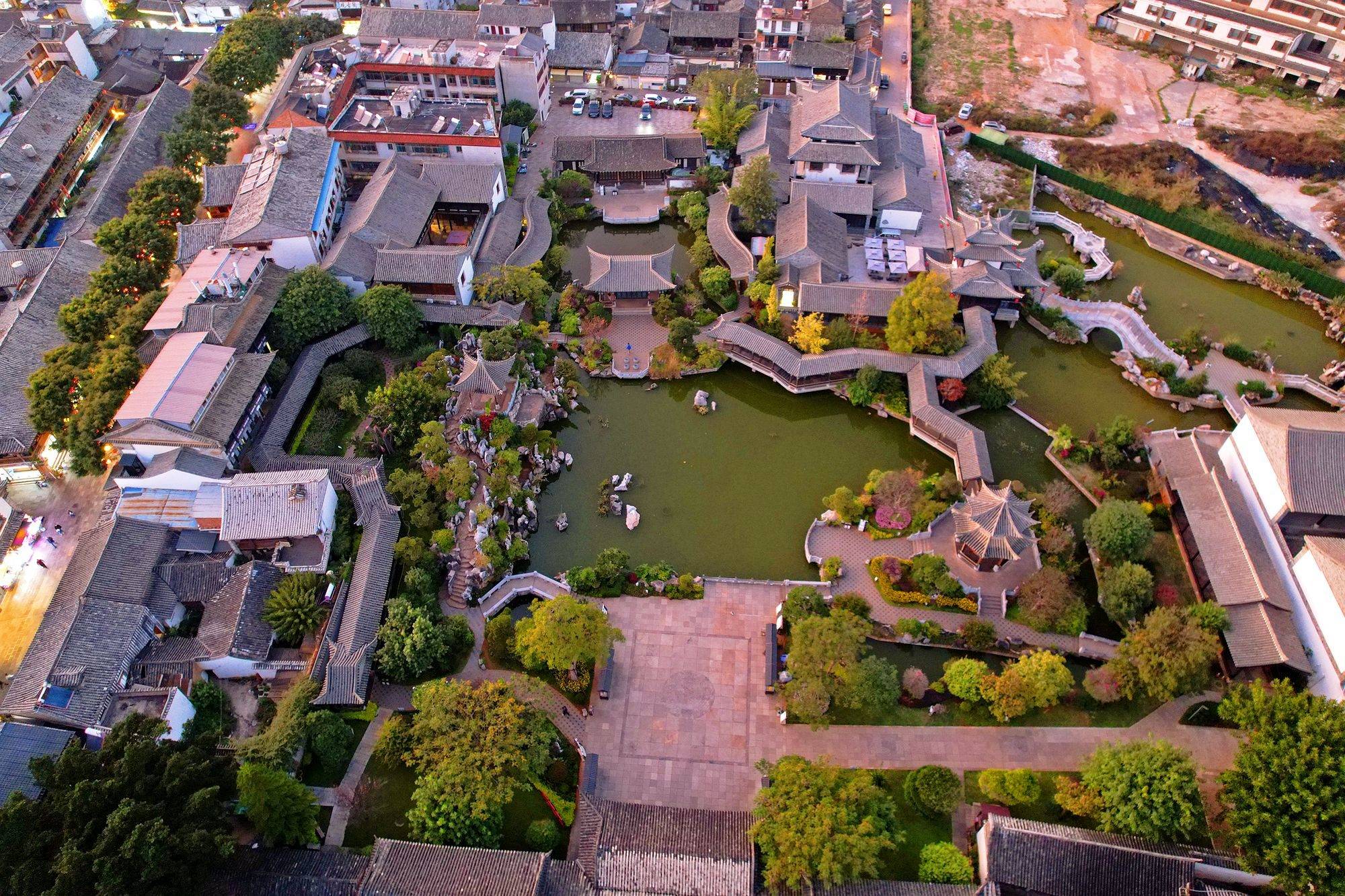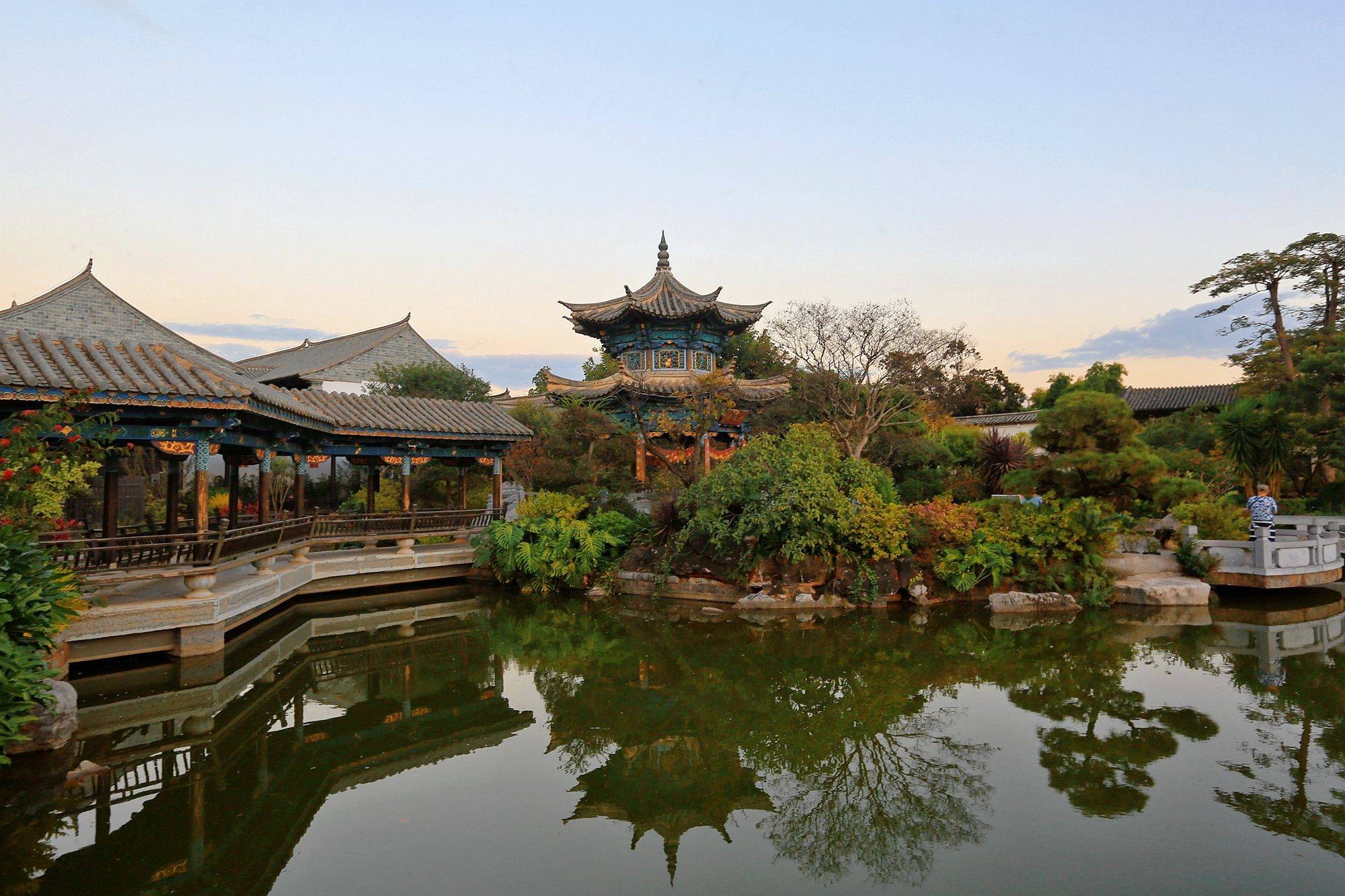 层层叠叠、高低错落的建筑中走出来,走进后花园,视野豁然开朗,一方池水倒映着天光,倒映着岸边的亭台楼阁、假山湖石,明亮华丽,好像是跌进了一幅绝美的画中。