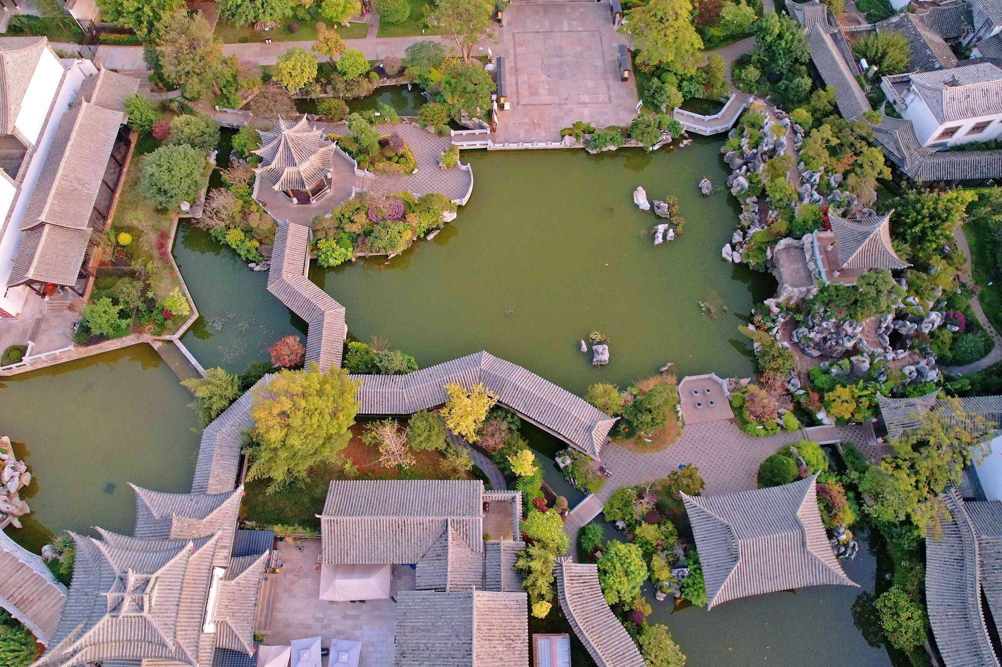 从高空俯瞰,一片青砖褐瓦中藏着深深的湖水,嵌着苍老的树木,挑着朱红的灯笼,朱家花园的规模让人印象深刻,而这庞大规模中灵动有序的布局,这其中蕴藏的细致心思更是让人赞叹。