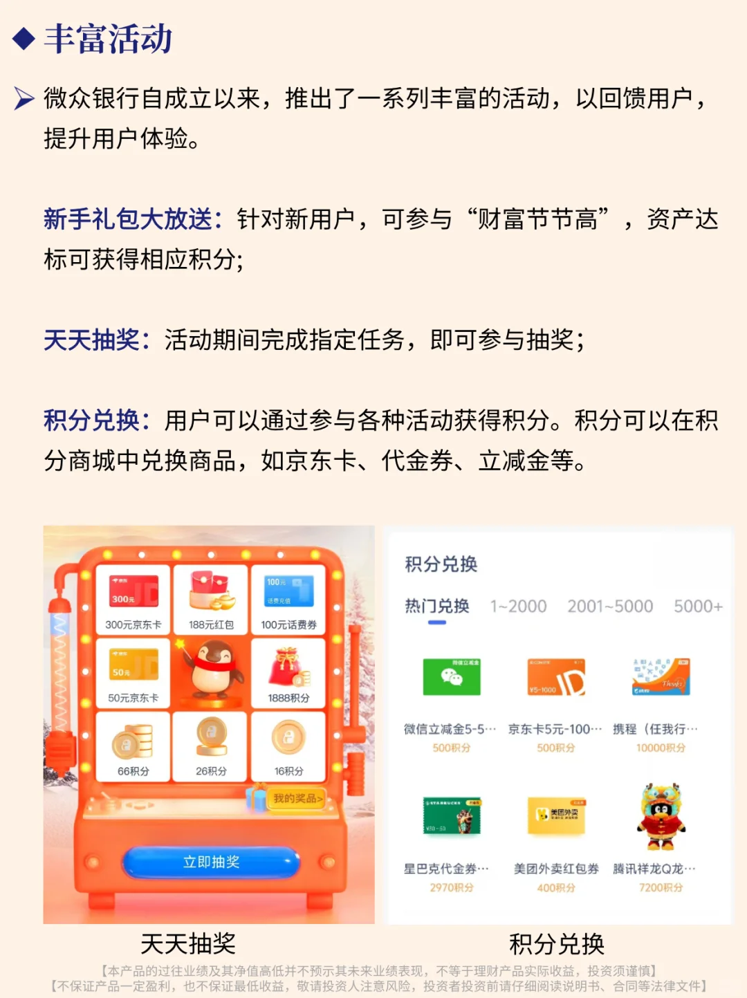 [大笑R] 除此之外,微众银行还有很多积分活动可以参与,像新客大礼包+达标赚积分活动,赚到的积分可以去商城兑换一系列奖励,京东购物卡、话费、微信立减金等都可以兑换,相比其他平台,微众这一点还是做的不错的,像我平时就会兑换一些话费卡,算下来可以省不少💰。