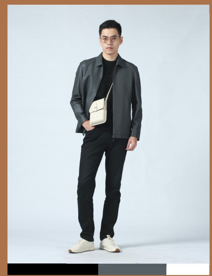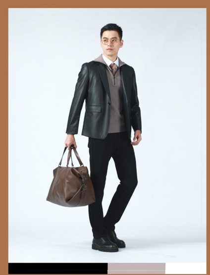 内搭黑色圆领毛衣衔接深灰哑光皮茄克,下搭黑色直筒休闲裤,以米白斜挎包与白色休闲鞋点缀突出层次。通过哑光皮革与针织的材质碰撞、经典版型的细节改良,在保留职场专业感的同时注入轻商务休闲气息,金属眼镜框与斜挎包的精致点缀强化细节品味,适合日常通勤、办公的多元化场合。