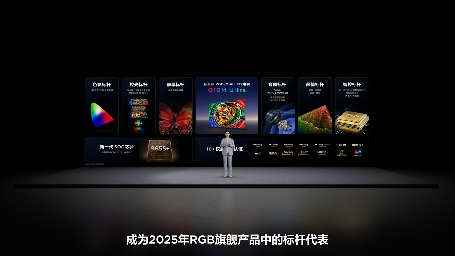 这款电视搭载了RGB万象分区和全链路光色控制技术,色彩表现简直绝了,竟然能达到100% BT.2020的色域,光色控制精度也高达120bits,亮度更是能冲到9000nits!