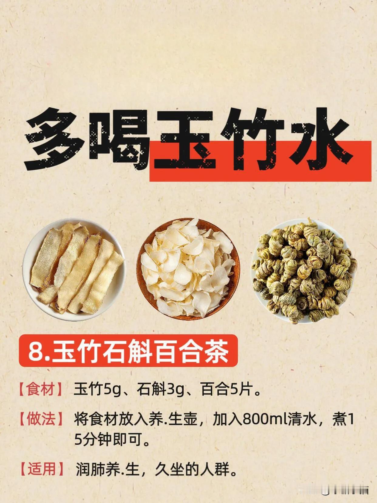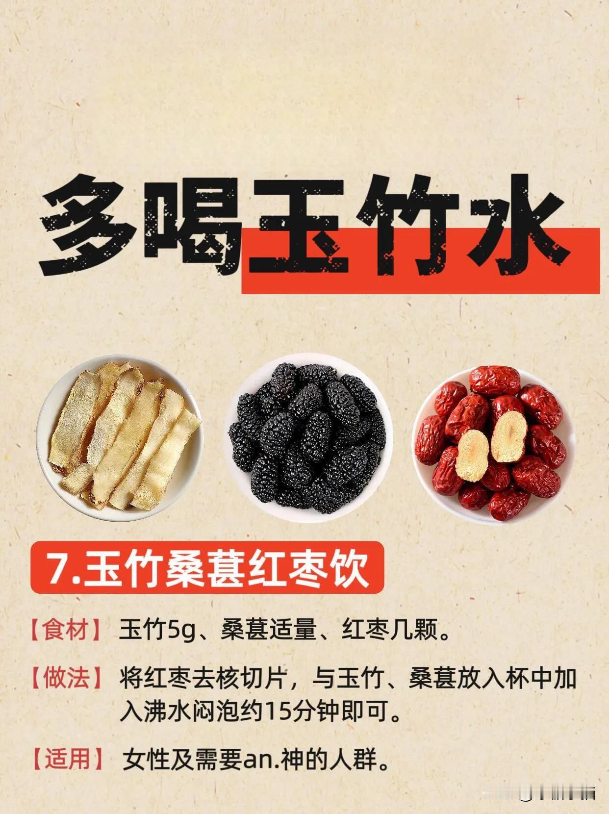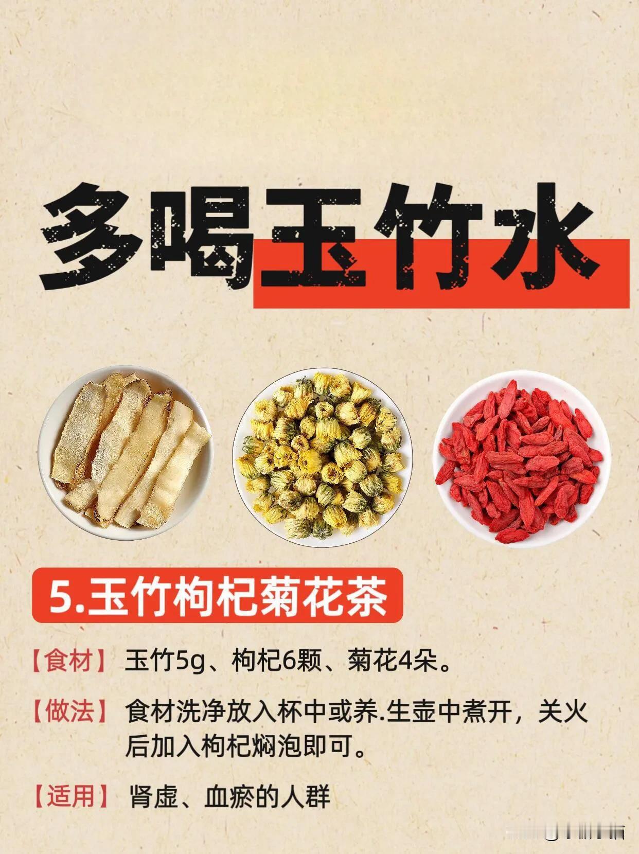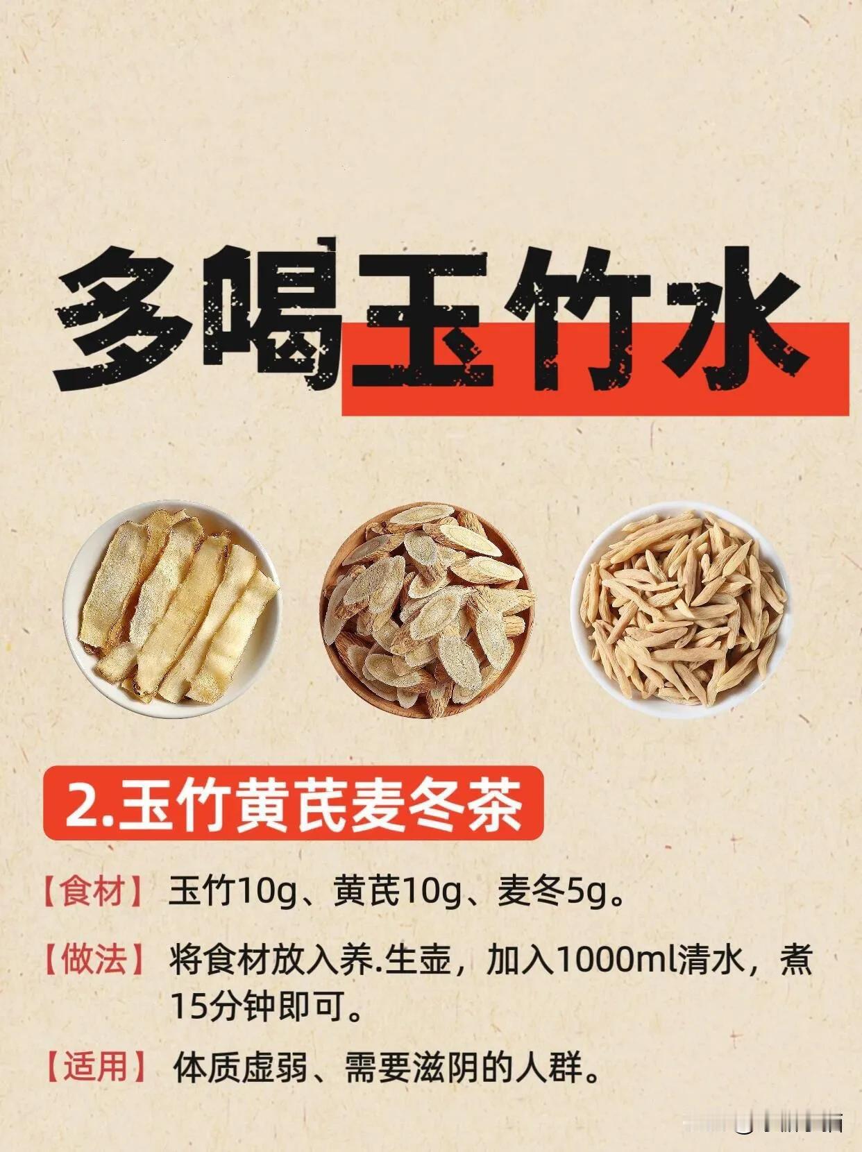 小雪阴虚火旺补津液就喝玉竹水 补津液多喝玉竹水☕️冬天身体也是润润的❗ 冬天,气候逐渐变得干燥❗ 此时身体也容易受到秋燥的影响,出现皮肤干燥起皮,喉咙痒咳,伤及肺腑。 所以要补津液,玉竹自古就是滋阴run.燥的佳品! 《神农本草经》记载玉竹“久服去面黑斑,好顏色,润泽”。意思是经常吃玉竹能dan.化脸上的黑斑,让肤色变得更加美丽,也水嫩有光泽。 - 今天给大家分享10种玉竹搭配的食疗方 黄芪石斛灵芝茶 玉竹百合茯苓饮 麦冬雪梨水 黄芪泡水好搭配 玉竹雪梨饮 黄精黄芪枸杞 虫草陈皮川贝茶 最强补益神汤 我的养生搭子
