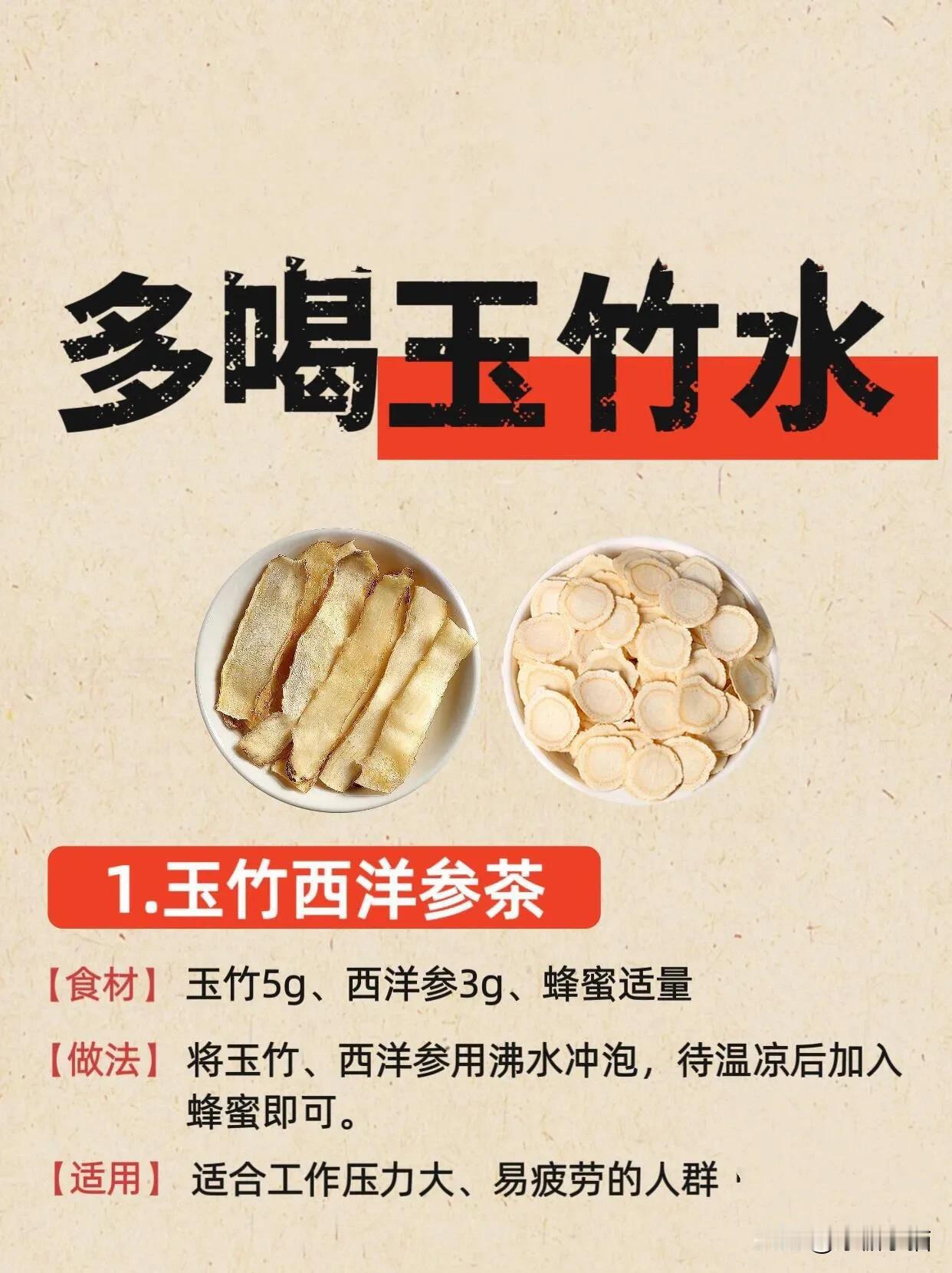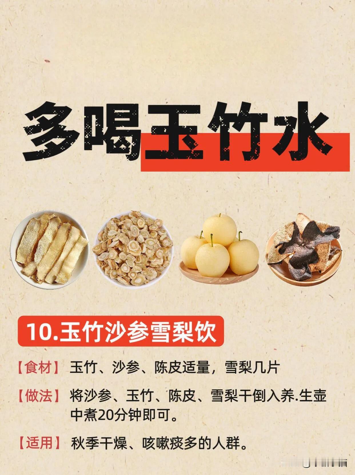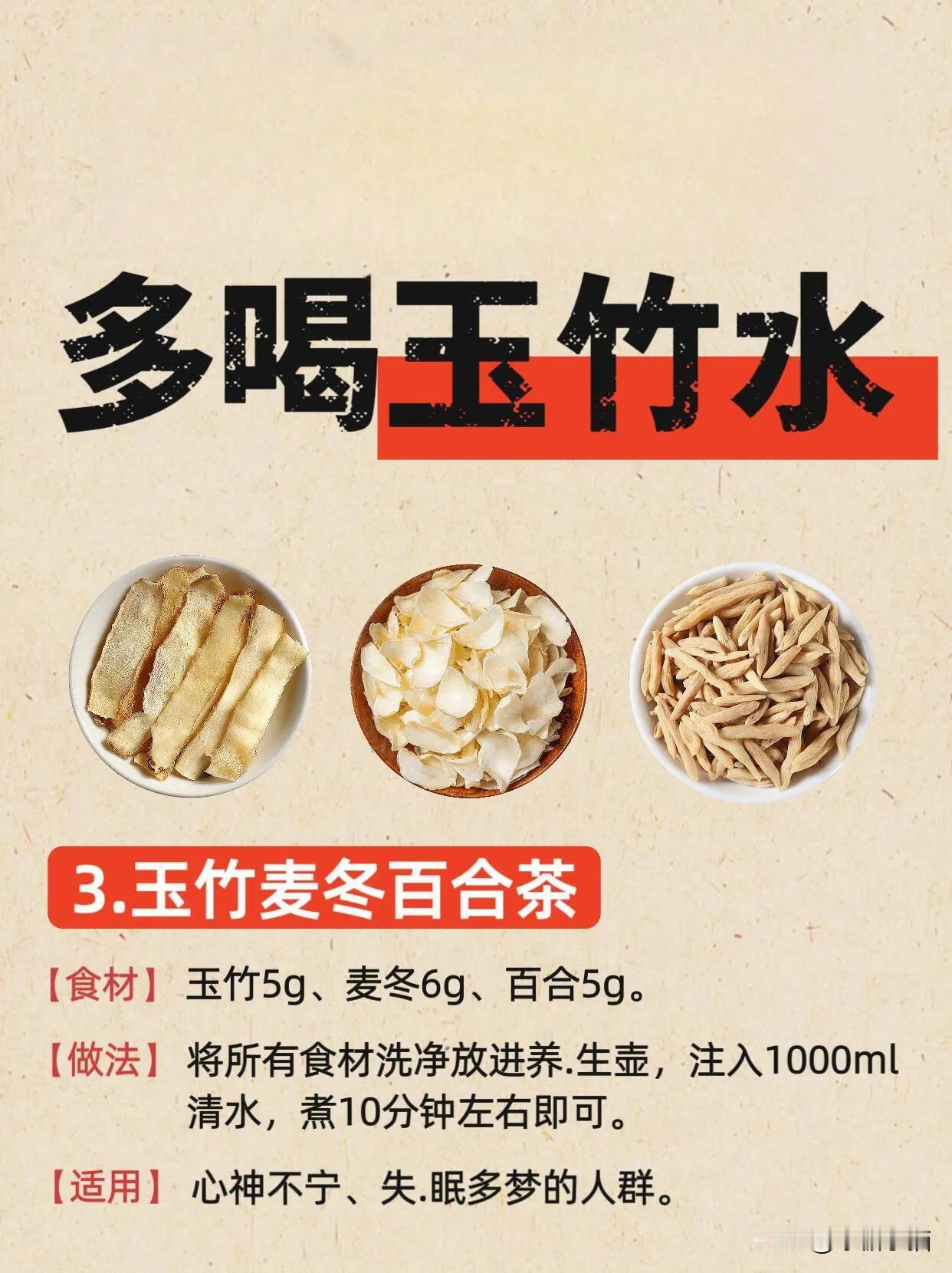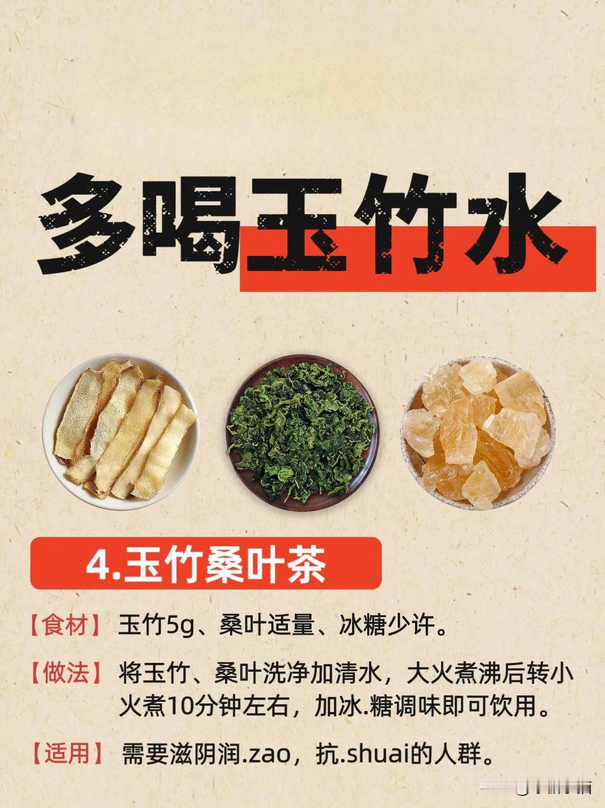 小雪阴虚火旺补津液就喝玉竹水 补津液多喝玉竹水☕️冬天身体也是润润的❗ 冬天,气候逐渐变得干燥❗ 此时身体也容易受到秋燥的影响,出现皮肤干燥起皮,喉咙痒咳,伤及肺腑。 所以要补津液,玉竹自古就是滋阴run.燥的佳品! 《神农本草经》记载玉竹“久服去面黑斑,好顏色,润泽”。意思是经常吃玉竹能dan.化脸上的黑斑,让肤色变得更加美丽,也水嫩有光泽。 - 今天给大家分享10种玉竹搭配的食疗方 黄芪石斛灵芝茶 玉竹百合茯苓饮 麦冬雪梨水 黄芪泡水好搭配 玉竹雪梨饮 黄精黄芪枸杞 虫草陈皮川贝茶 最强补益神汤 我的养生搭子