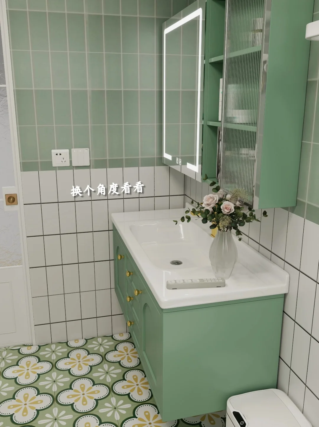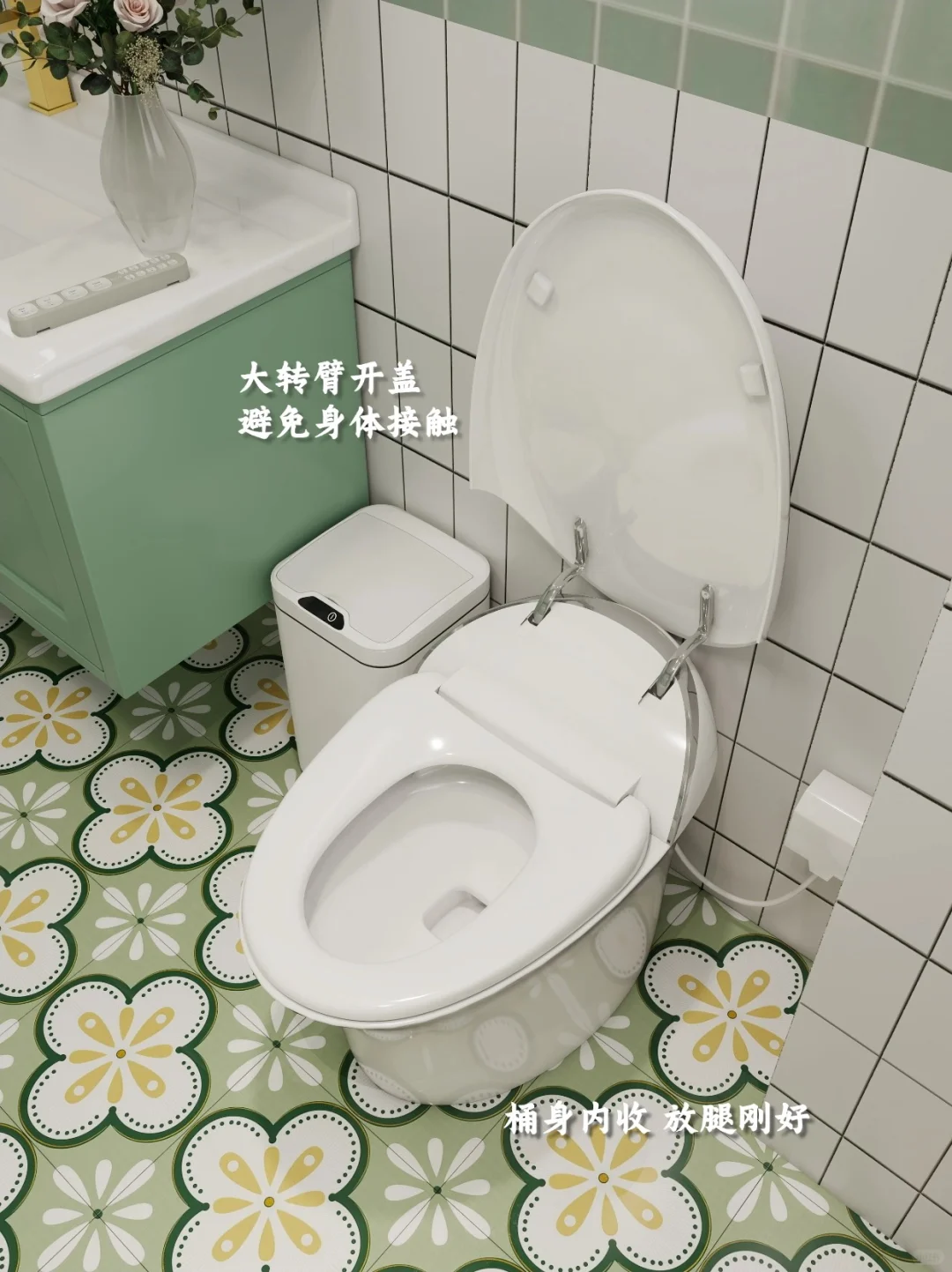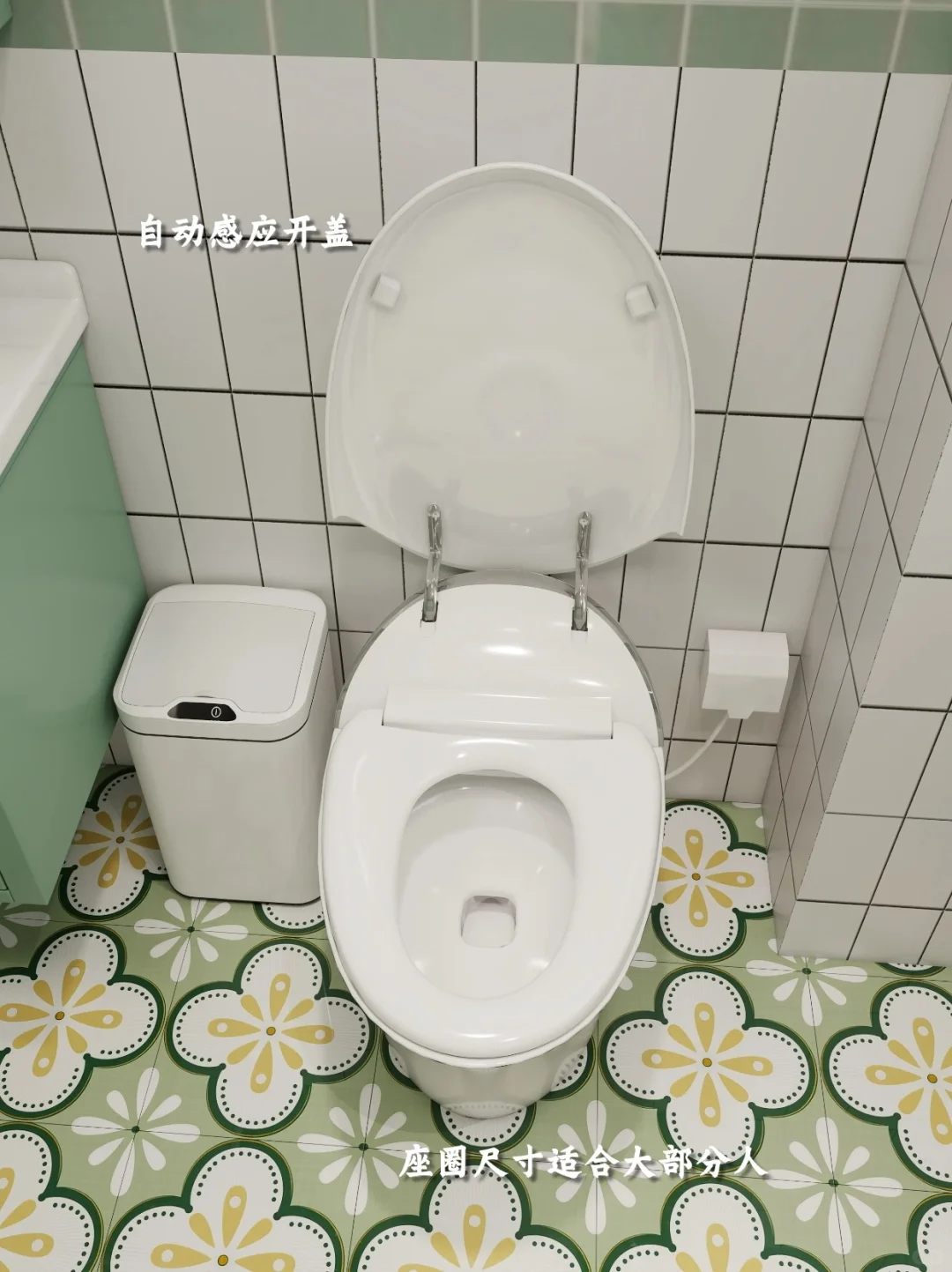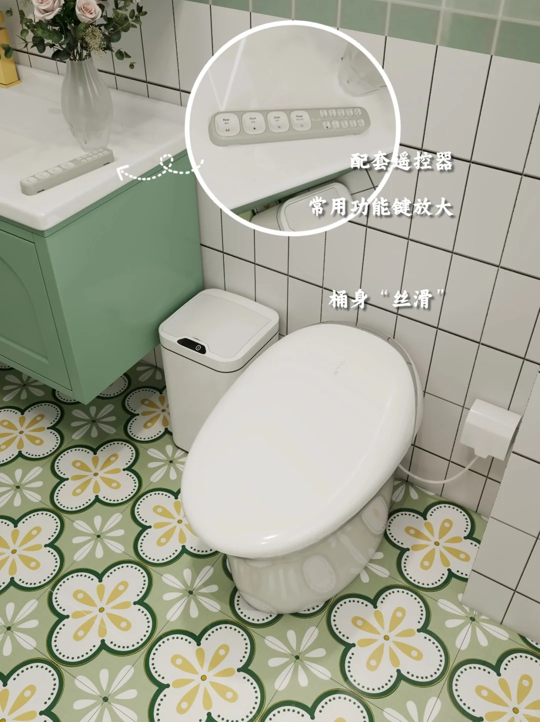 熟悉我的粉丝都知道我有多喜欢绿色,家里的主色调就是绿色和白色。 时间长了也看不腻,反而越看越好看。尤其是客厅和卫生间~ 所以我给父母家里“复刻”了我的卫生间。 同样是白绿色调+小花砖的设计。但在马桶的选择上用了点心思。 选了宜来的智能马桶,这个更适合老人使用。 能够自动开盖、自动冲水,还有妇洗、臀洗、烘干等功能,可以做到全程不沾手,老人能更加方便的保持个人卫生。 侧边设置了常用功能键,可以根据手感不同进行区分,不用弯腰不用转身就能操作~ 还有座圈加热的功能,老年人身体弱,最怕着凉,这样坐着暖暖的,就不用担心啦~