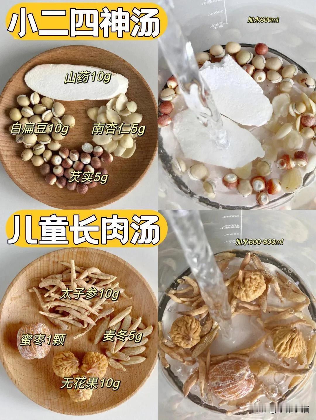 宝宝少生病爱吃饭长肉一定要多喝这几款汤 在中yi来说,小儿的体质就是“三有余,而四不足”其中有一就是脾不足,脾比较容易受损,受损就容易积食,B秘,内热,低抗力差等,长个不长肉等问题 随意妈妈们在养育孩子一定要注意养好脾胃,重预防,这样孩子也会更好带。 想要宝宝少生病,爱吃饭,体力强一定要多喝这几款汤,简单又好喝! 🍀新四神汤 🌟材料:山药10g+白扁豆10g+芡实5g+南杏仁5g 🌟做法:养生壶煮15分钟 健脾祛湿 run肠通💩 新四神汤把莲子和茯苓换成了白扁豆与甜杳仁加强通💩的功效,更适合大多数的孩子使用 - 🍀太子参无花果麦冬茶 🌟材料:太子参10g+麦冬5g+无花果10g+蜜枣1颗 🌟做法:养生壶煮15分钟 小孩压食?燥热?咳不停?这款茶清润醇和,有健胃理肠、益qi润肺的作用。 - 🍀儿童秋润健脾茶 🌟材料:炒麦芽8g+陈皮2g+乌梅5g+莲子5g+百合8g 🌟做法:养生壶煮15分钟 润肺健脾,抑制秋燥,缓解睡眠不安、大便不调等问题。适合3岁以上饮用。 - 🍀海底椰雪梨茶 🌟材料:海底椰3g+无花果3颗+雪梨干2片+麦冬5g+百合5g 🌟做法:养生壶煮15分钟 小朋友心火旺、爱发脾气、夜晚爱哭闹、睡不安稳喝它! 这碗雪梨海底椰祛心火肺火、生津润肺、清热除燥、让孩子睡得香! - 🍀秋柠饮 🌟材料:柠檬1个切片去籽+陈皮5g+蜂蜜适量 🌟做法:养生壶煮15分钟 滋阴润🥵和胃,理气祛湿健脾 秋柠饮既能滋阴润🥵,又能理qi祛湿,而且力道比较平和,适合经常饮用。 一岁以上小孩都可以使用,每周可以喝2~3次 - 🍀小儿养脾甜汤 🌟材料:苹果1个+茯苓5g+莲子5g+芡实5g+淮山5g+蜜枣1个 🌟做法:养生壶煮15分钟 健脾开胃,养阴润肺,孩子脾胃虚、不爱吃饭就喝它! 一岁以下宝宝不适合,经常💩秘的宝宝,一周喝一次就够了! ‼️以上为养生茶饮分享,不能代替💊 养娃要养脾胃 鸡内金山药汤 改善脾胃宝宝 保护孩子脾胃 对小孩脾胃好 小儿脾胃养护 宝贝脾胃啥都好 儿童养养脾胃 小孩儿脾胃虚