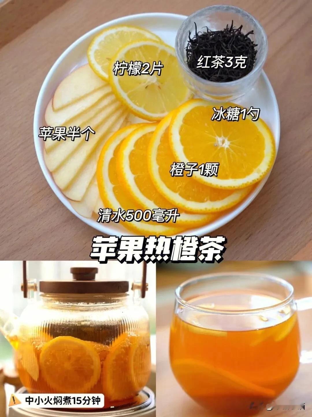 冬日热饮❗❗自制水果茶分享 冬日来喽!我们不仅可以吃热辣辣的火锅🥘、烤肉🥩,还可以搭配一杯暖洋洋的水果茶🍹在家就可以做,做法简单! 1⃣️苹果热橙茶 ✨酸酸甜甜,果味浓郁 🌿食材:橙子1颗切片、苹果半个切片、柠檬2片、红茶3克、冰糖1勺,清水500毫升 2⃣️桂圆热红茶 ✨桂圆的香甜混合红茶的醇香,敲好喝 🌿食材:桂圆15颗、红茶3克,清水500毫升 3⃣️柠檬热红茶 ✨清爽好喝又解腻 🌿食材:柠檬1颗切片、冰糖2勺、红茶3克,清水500毫升 4⃣️雪梨桂花茶 ✨适合干燥的秋冬季节,喉咙不舒服的时候喝 🌿食材:雪梨半个切块、桂花3克、绿茶3克、冰糖1勺,清水500毫升 5⃣️粒粒热红柚 ✨清甜柚香混合甘醇茶香,还能吃到西柚粒粒果肉 🌿食材:西柚半个果肉、冰糖2勺、绿茶3克,清水500毫升 6⃣️满杯金菠萝 ✨清新香甜味道特别棒 🌿食材:菠萝1/4个、冰糖1勺、绿茶3克,清水500毫升 ⚠️TIPS ✅柠檬、橙子用盐搓洗干净,需要去籽; ✅水果冰糖茶叶全部加入茶壶中,,中小火焖煮15分钟。 马蹄雪莉竹蔗茶 早c晚a水果茶 调饮果茶方子 每日一杯鲜果茶 健康蔬果茶 金桔香果茶 花旗果茶好喝 金桔柠檬西柚茶 暖身养颜饮品